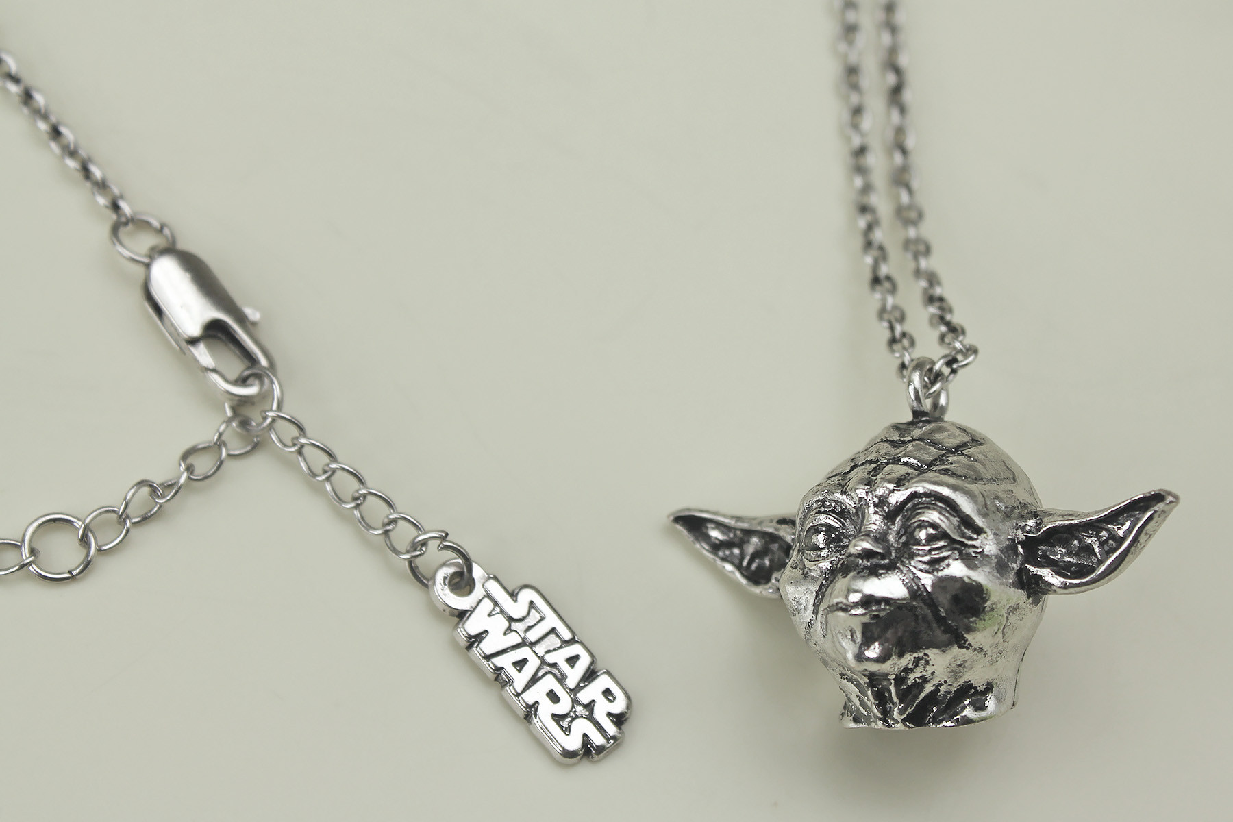 The necklace came packaged in a black satin drawstring bag, with the Star Wars and Love And Madness logos printed in silver on both sides. This is a lovely presentation, perfect for giving as a gift – or as a little treat for yourself! The necklace itself features a long silver-tone chain, with a 3D sculpted pendant of the famous Jedi Master Yoda.