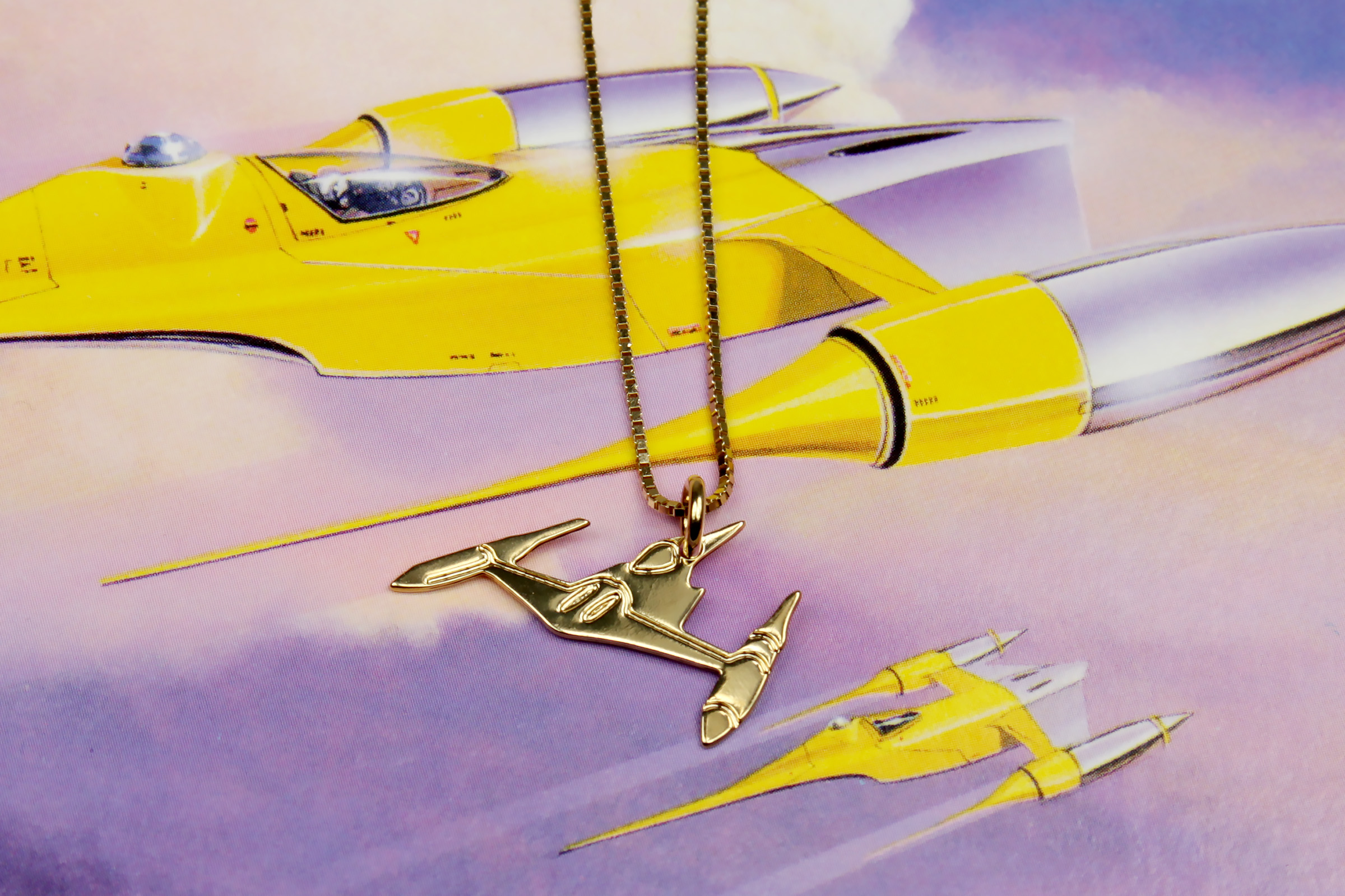 The pendant depicts the Naboo N-1 starfighter in flight, angled slightly, rather than ‘top down’. The design is flat, with recessed detail lines – just enough to define the starship, without adding too much ‘clutter’ to the clean and simple design.
