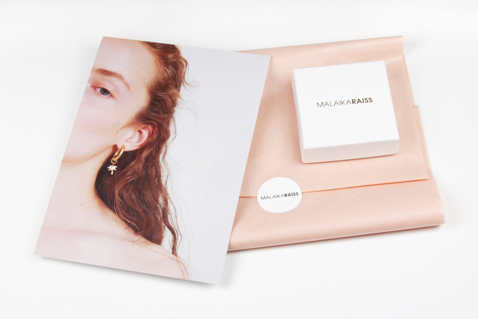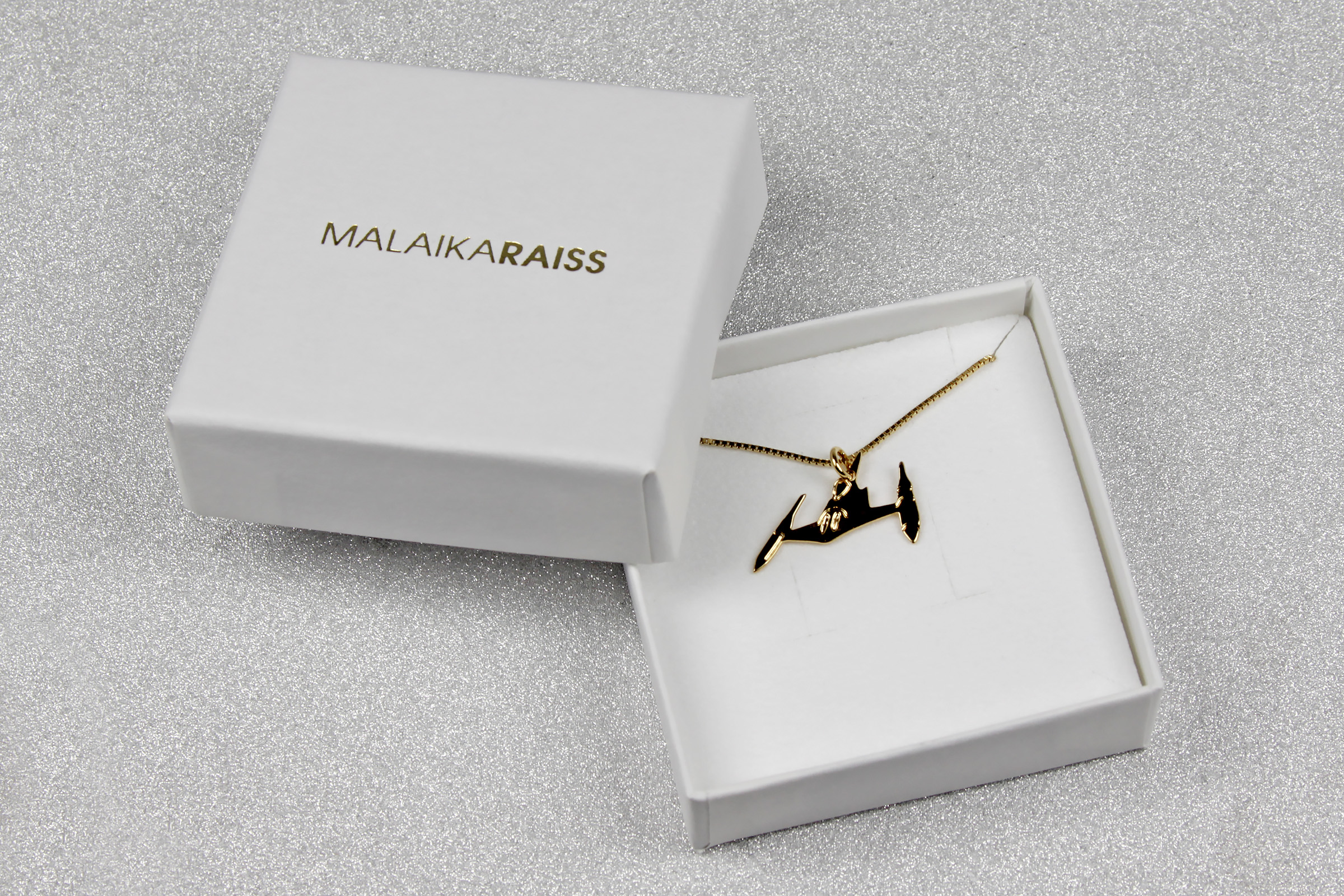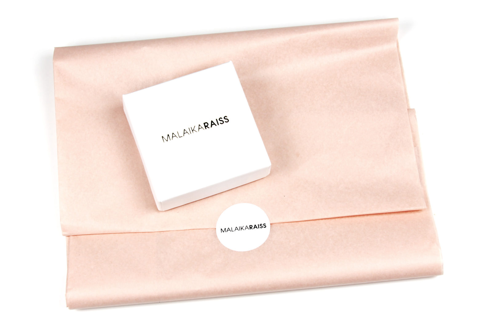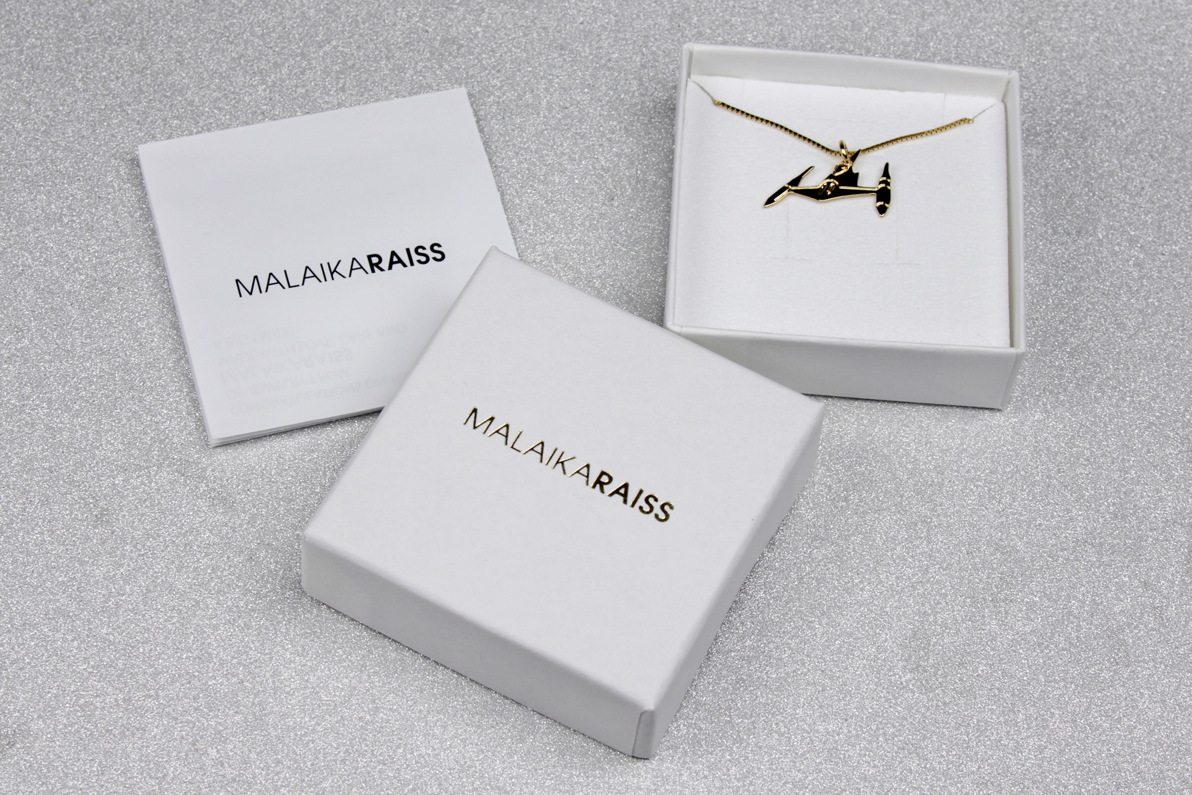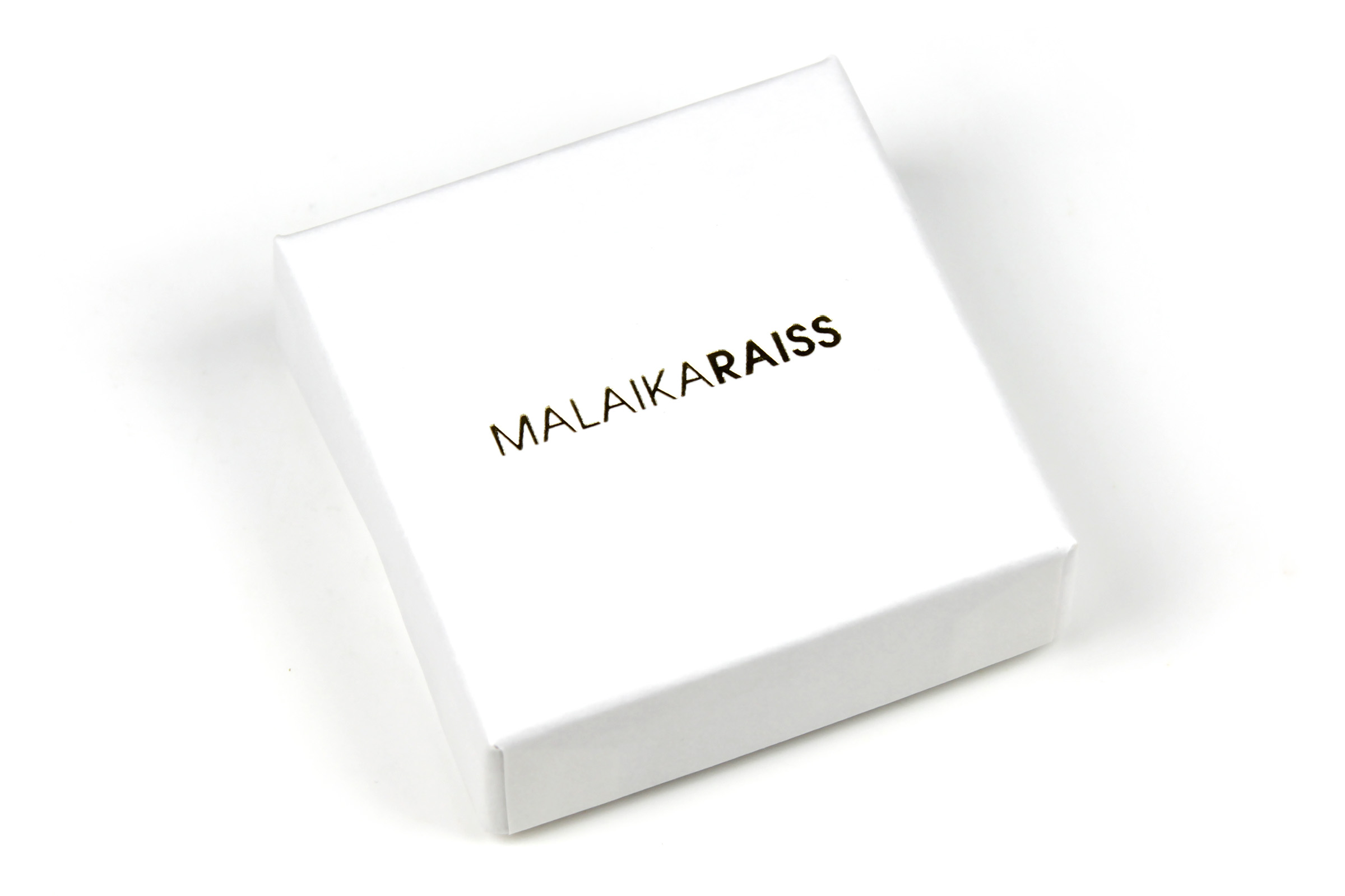The necklace came packaged inside a white cardboard gift box, with the Malaika Raiss brand logo printed in metallic gold foil on the box lid. Removing the lid, the necklace is secured to a soft white foam square, with the necklace threaded through two slits in the upper corners of the foam, and the rest of the chain housed behind.