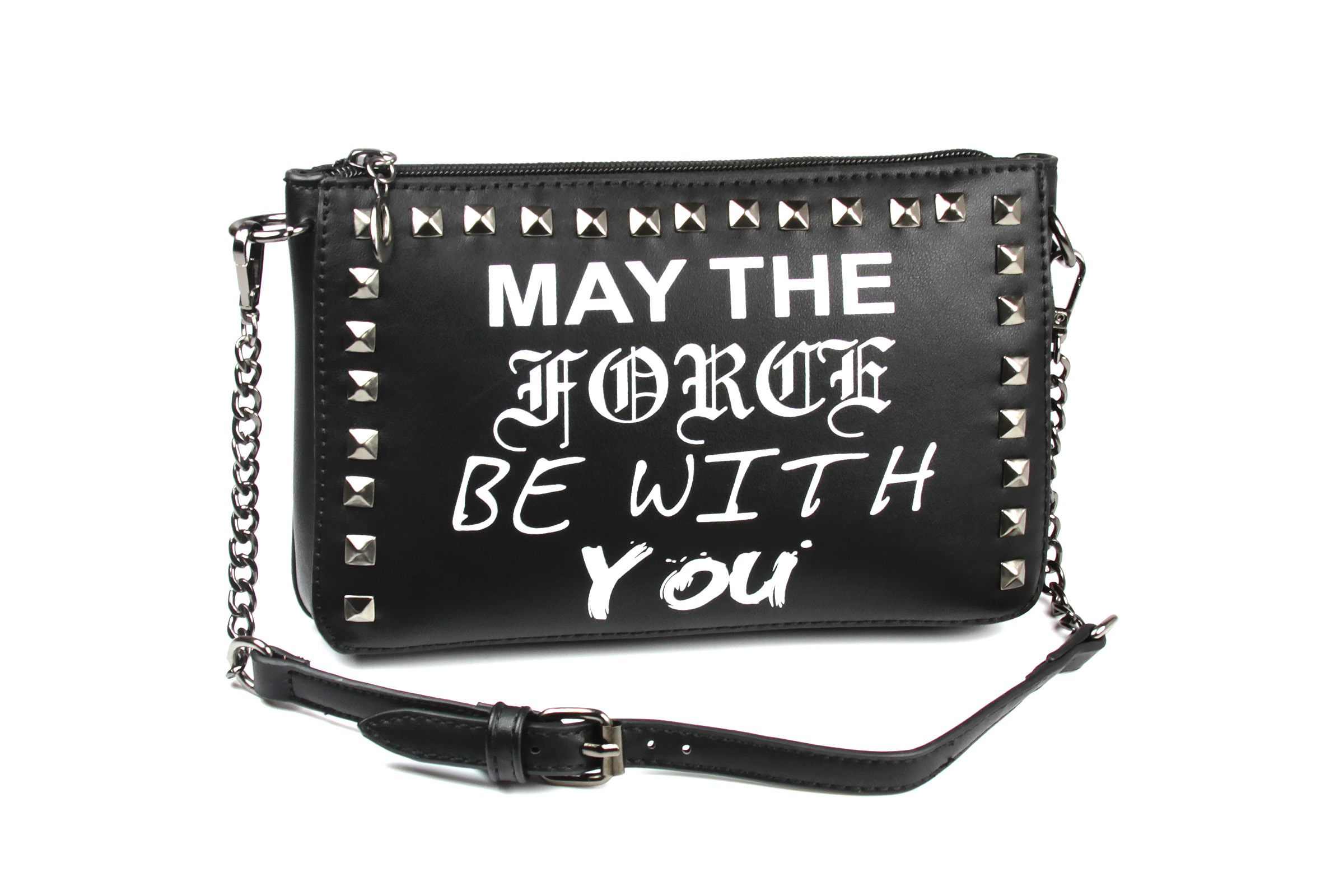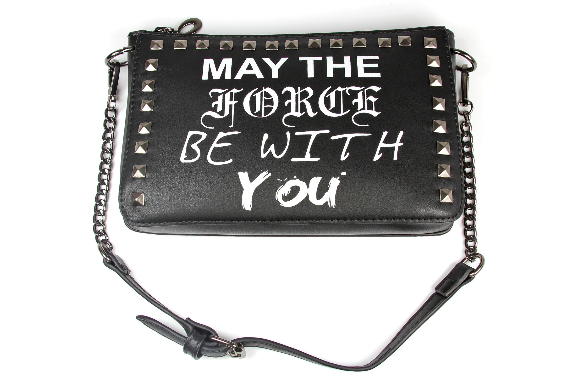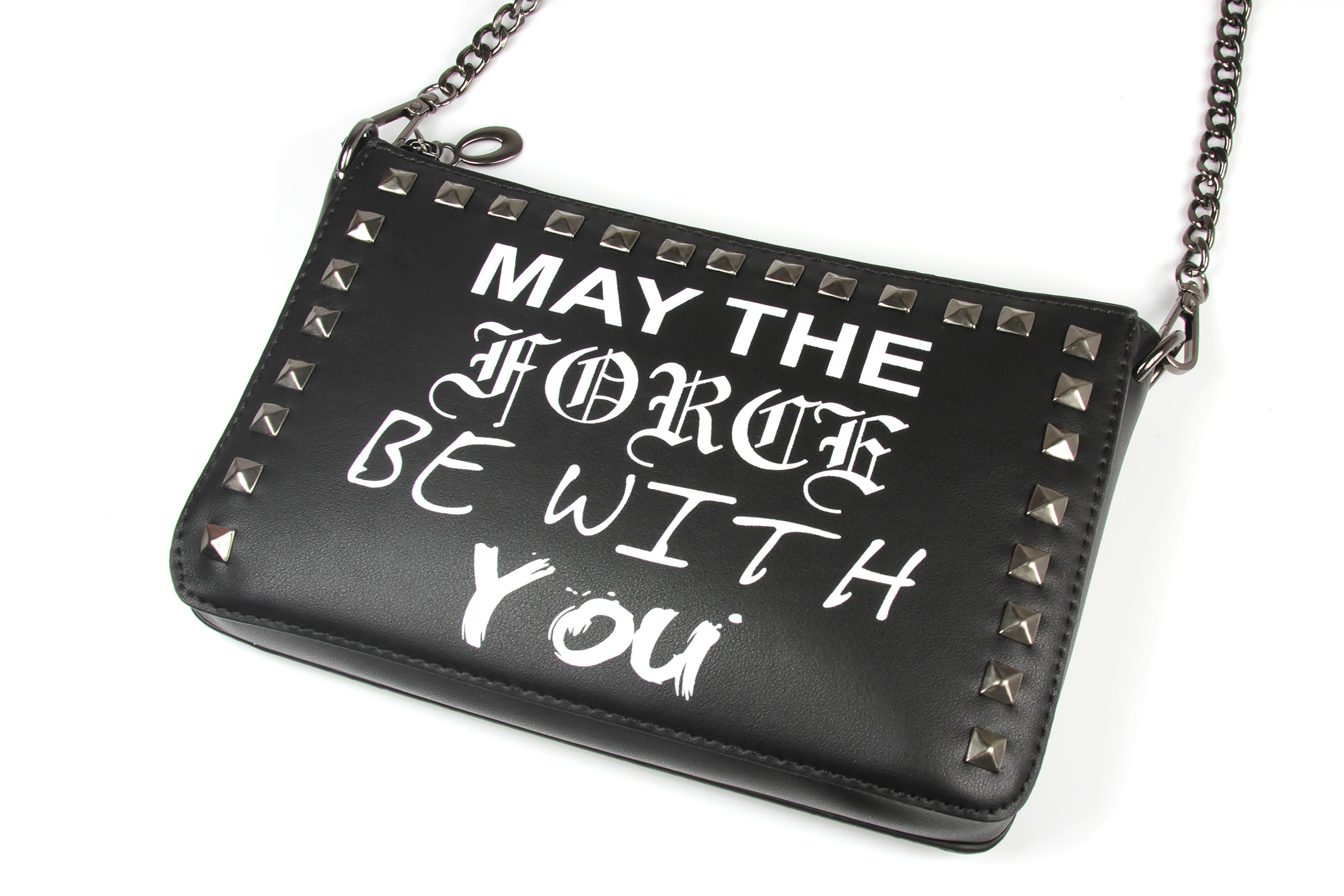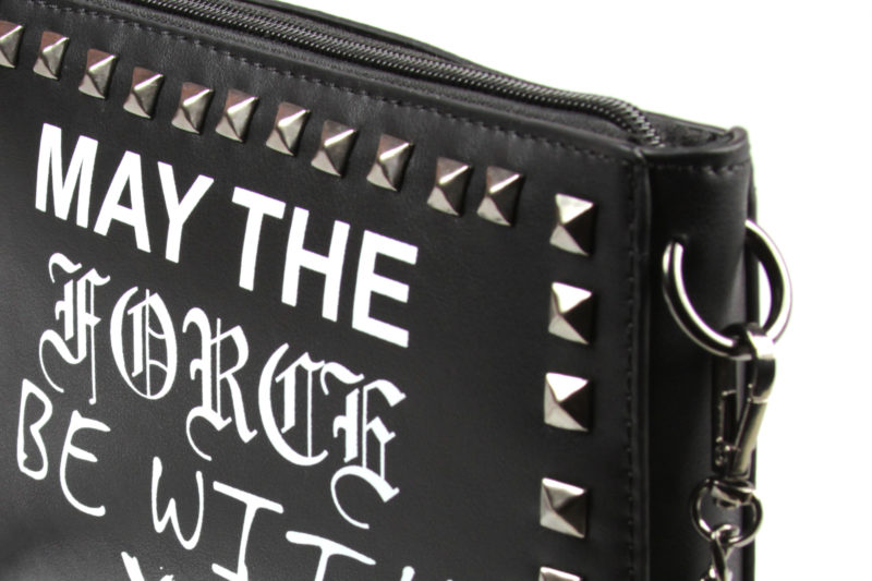 The ‘May The Force Be With You’ purse is made from black faux leather, and features the classic Star Wars quote ‘May The Force Be With You’ printed in different font styles on the front. The front panel is also decorated with dark gunmetal coloured studs around the border. The removable shoulder strap is made from dark gunmetal coloured chain with center piece of faux black leather strap with a buckle.