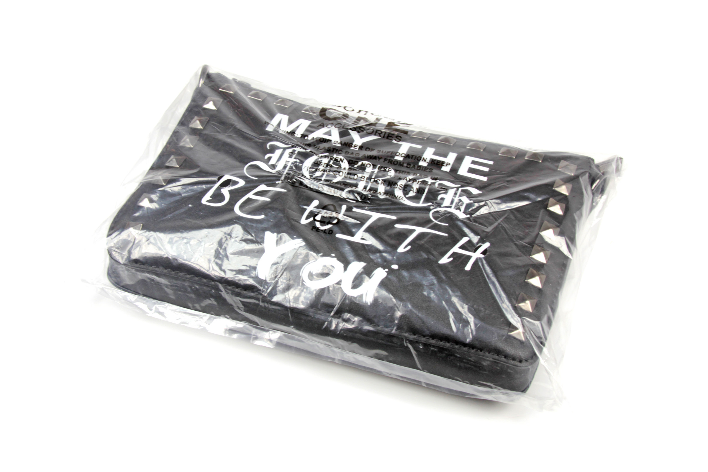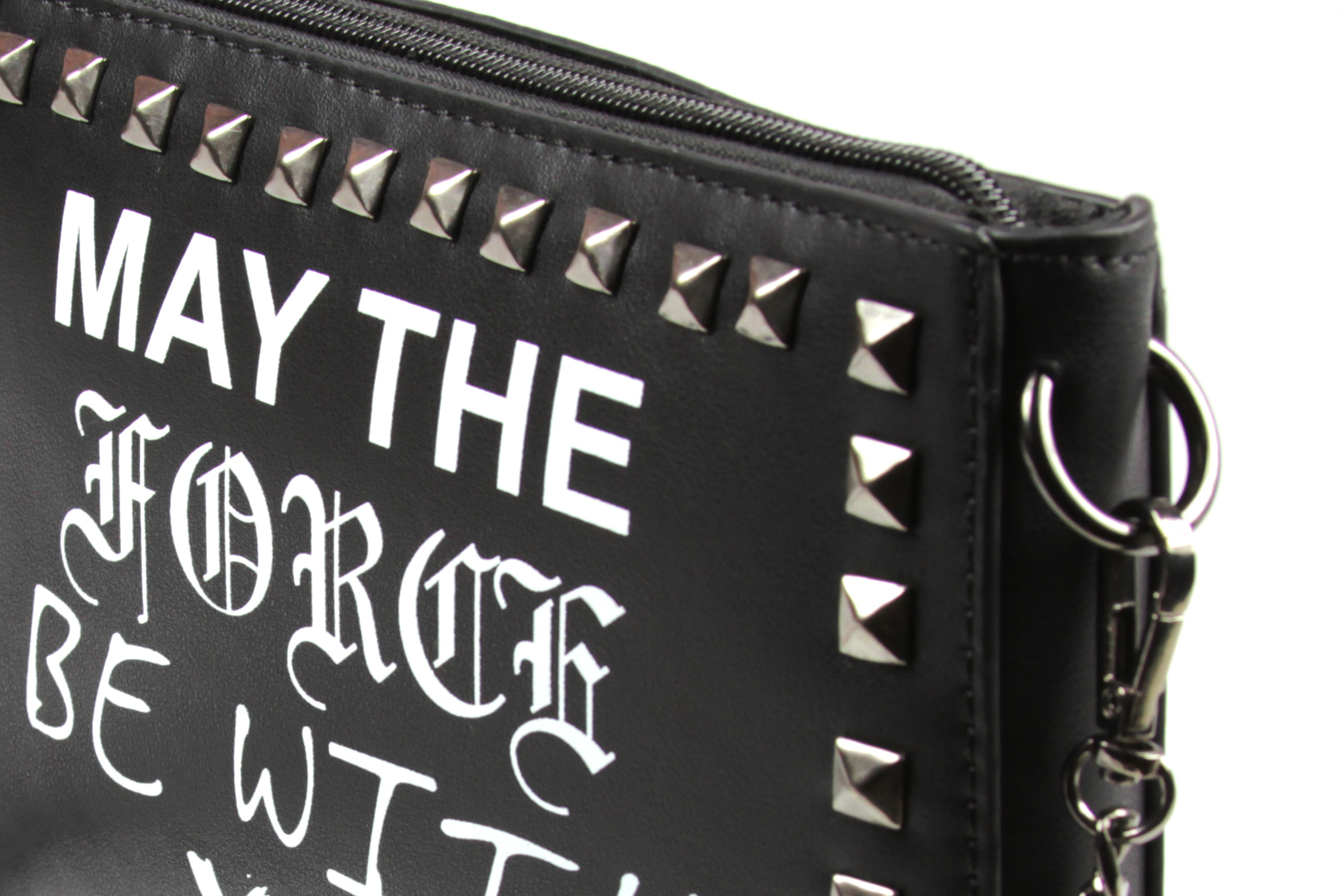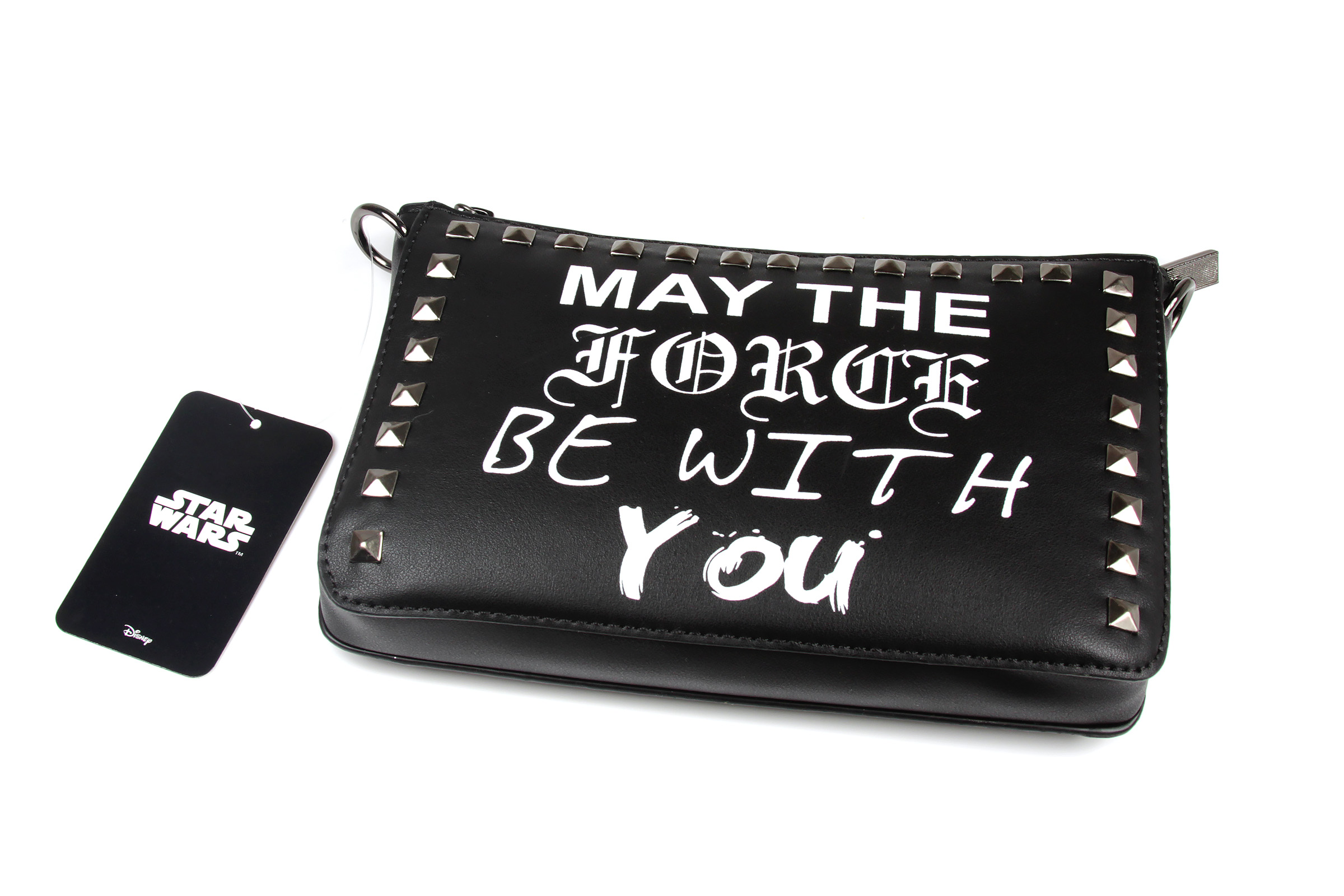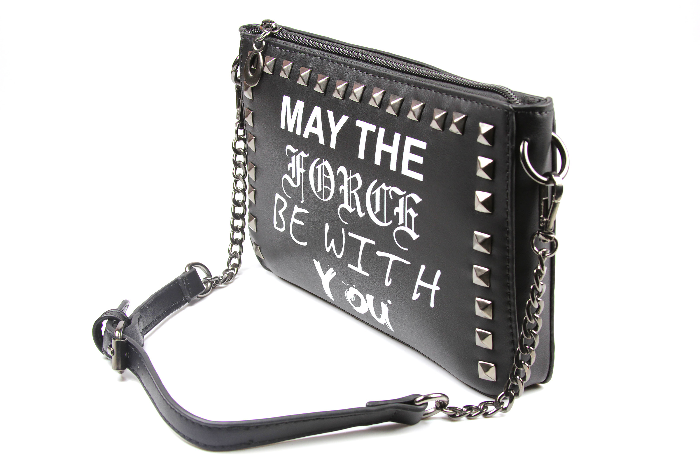 The ‘May The Force Be With You’ purse is made from black faux leather, and features the classic Star Wars quote ‘May The Force Be With You’ printed in different font styles on the front. The front panel is also decorated with dark gunmetal coloured studs around the border. The removable shoulder strap is made from dark gunmetal coloured chain with center piece of faux black leather strap with a buckle.