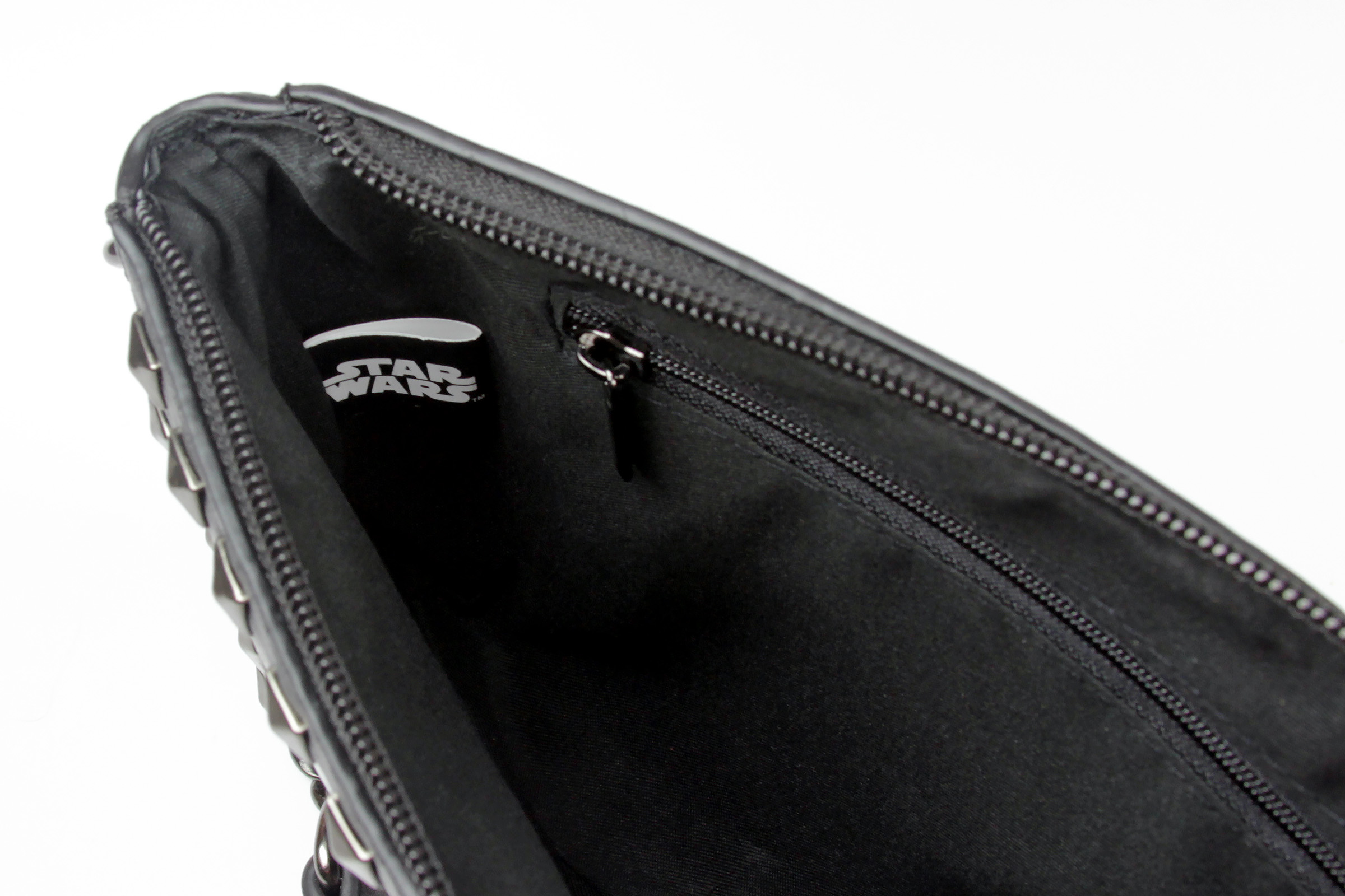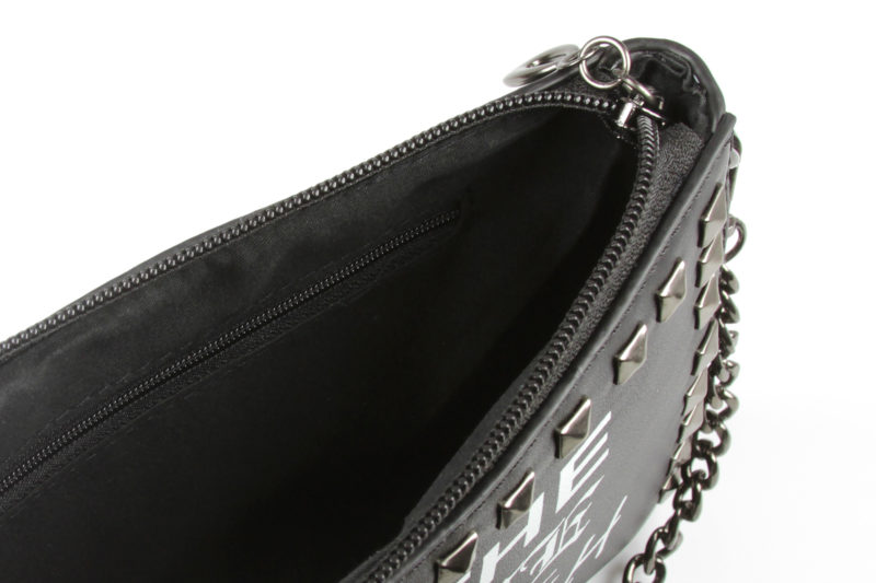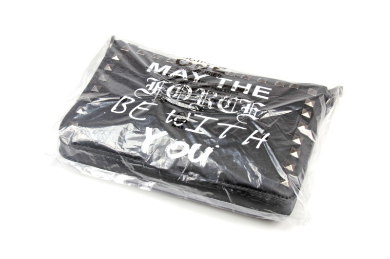 The front of the purse is decorated with a printed text design and metal studs. The classic Star Wars quote ‘May The Force Be With You’ in printed in white, with a varied font design. The printing is clean and tidy, even up close which is nice. The use of different fonts is a reference to punk style, notably the ‘ransom note’ style mix of text as used on album covers for the British band The Sex Pistols. Each line of the quote is printed in a different font – May The Force Be With You.