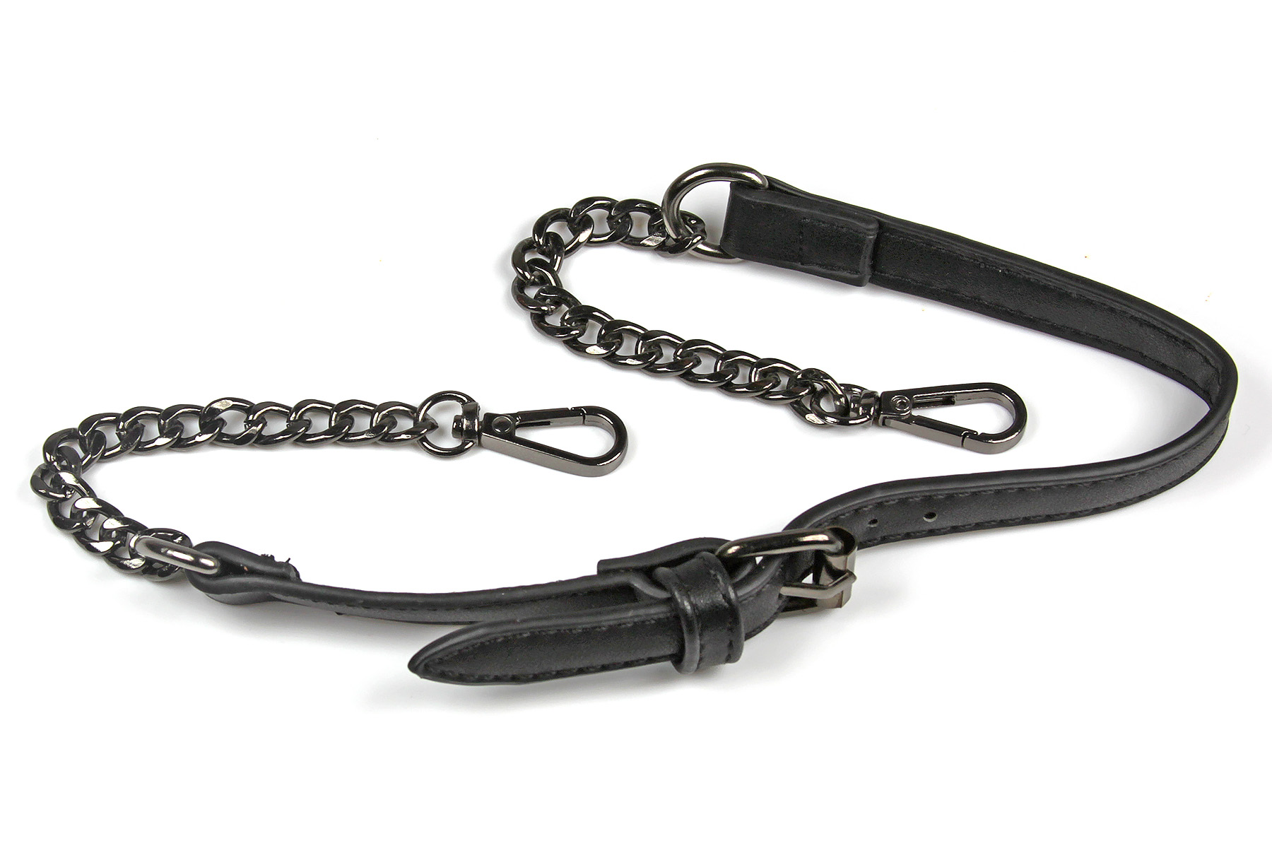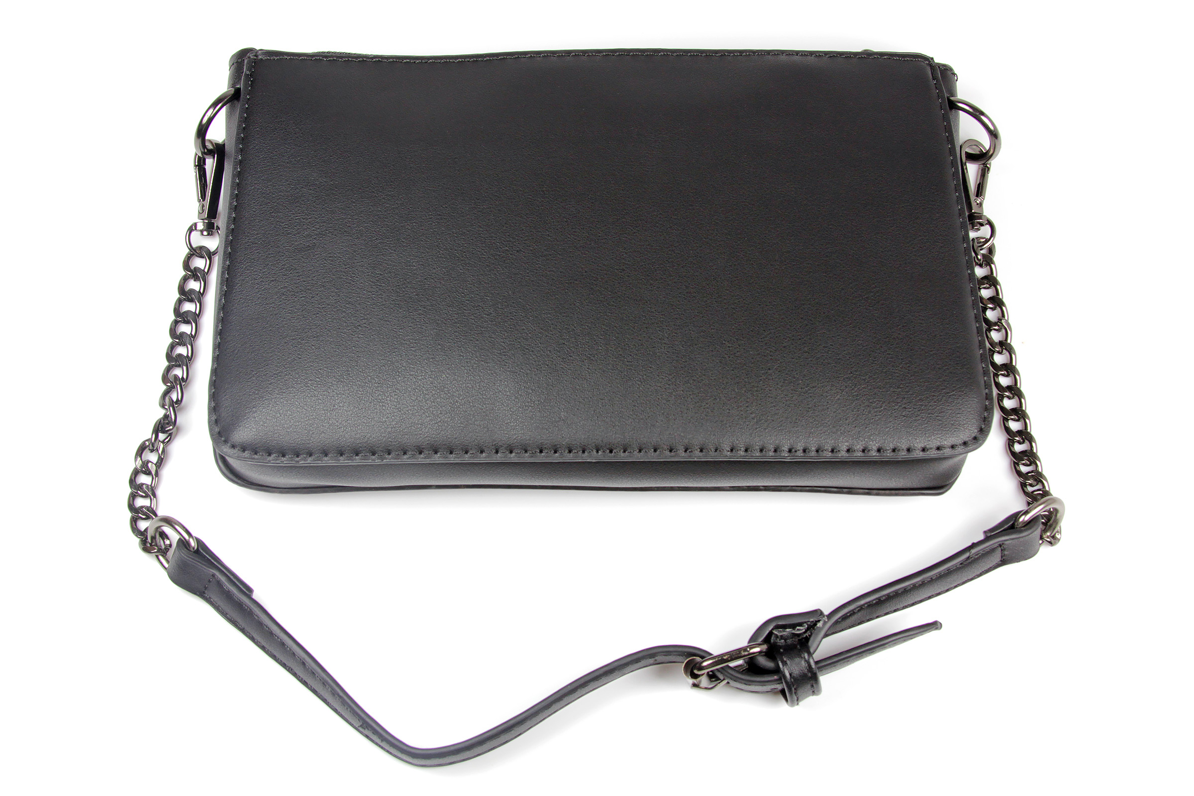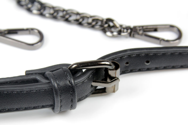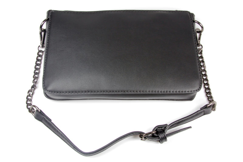 The shoulder strap is made from a dark gunmetal coloured chain, with a clip at each end. The center of the strap is made from the same black faux leather as the purse. The strap has dark gunmetal colour buckle, which is functional. The strap has five punched holes, so it has a small amount of adjustment in length.