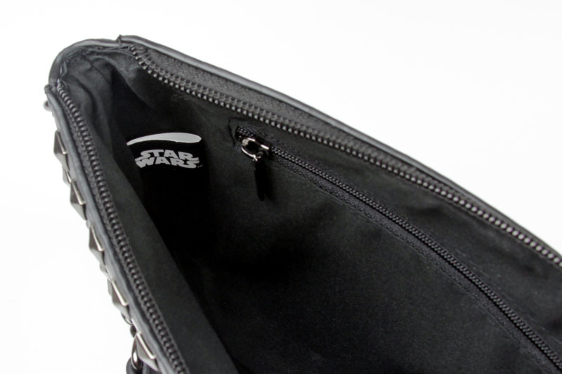 The purse is made from black faux leather, which has a subtle texture. The faux leather is fairly rigid (not soft like garment vinyl/leather), so it holds its shape well. The front of the purse features a Star Wars printed design, while the back of purse is plain. With a bag that doesn’t stand up on its own, I prefer a plain back so I don’t need to worry so much about damaging a design when putting the bag down.