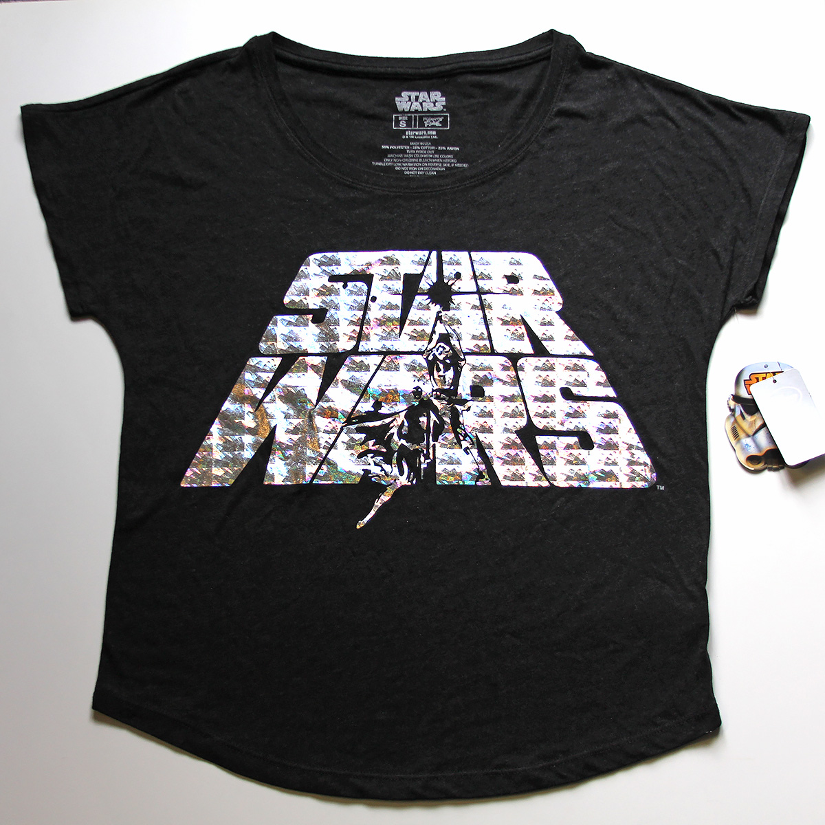 In early January four new Star Wars women’s tops were added to the Disney Store website. My favourite was the foil logo tee made by Mighty Fine, and not wanting to miss out, I quickly placed my order. I have a weakness for clothing with that vintage style logo, and combined with the foil I knew I had to have it. I paid US$24.95, ordering the size small.