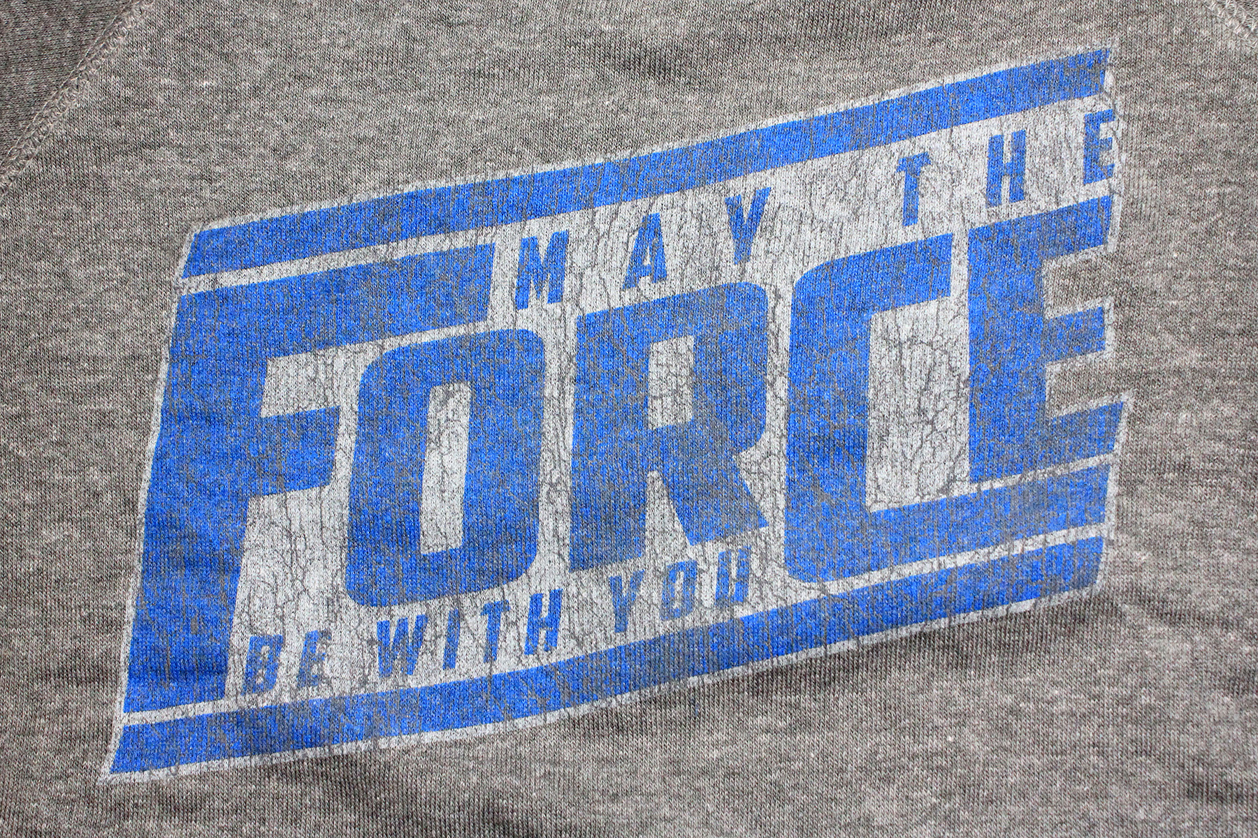 The gray heather sweatshirt features raglan style long sleeves and a vintage style ‘May The Force Be With You’ print on the front. The sweatshirt has a unisex fit, rather than women’s/fitted – but I find most sweatshirts tend to be unisex fit anyway. I bought mine in size XS – it measures approximately 50cm across the chest (underarm to underarm), 59.5cm from front neckline to hem, and 45.5cm across the lower edge. The fabric is 52% polyester, 48% cotton – lovely and soft inside, as sweatshirts should be. I love the side insert panels, and the weathered vintage effect of the front print, they really add interest. I’m really glad I had the opportunity to pick this one up after Celebration, it’s so comfy!