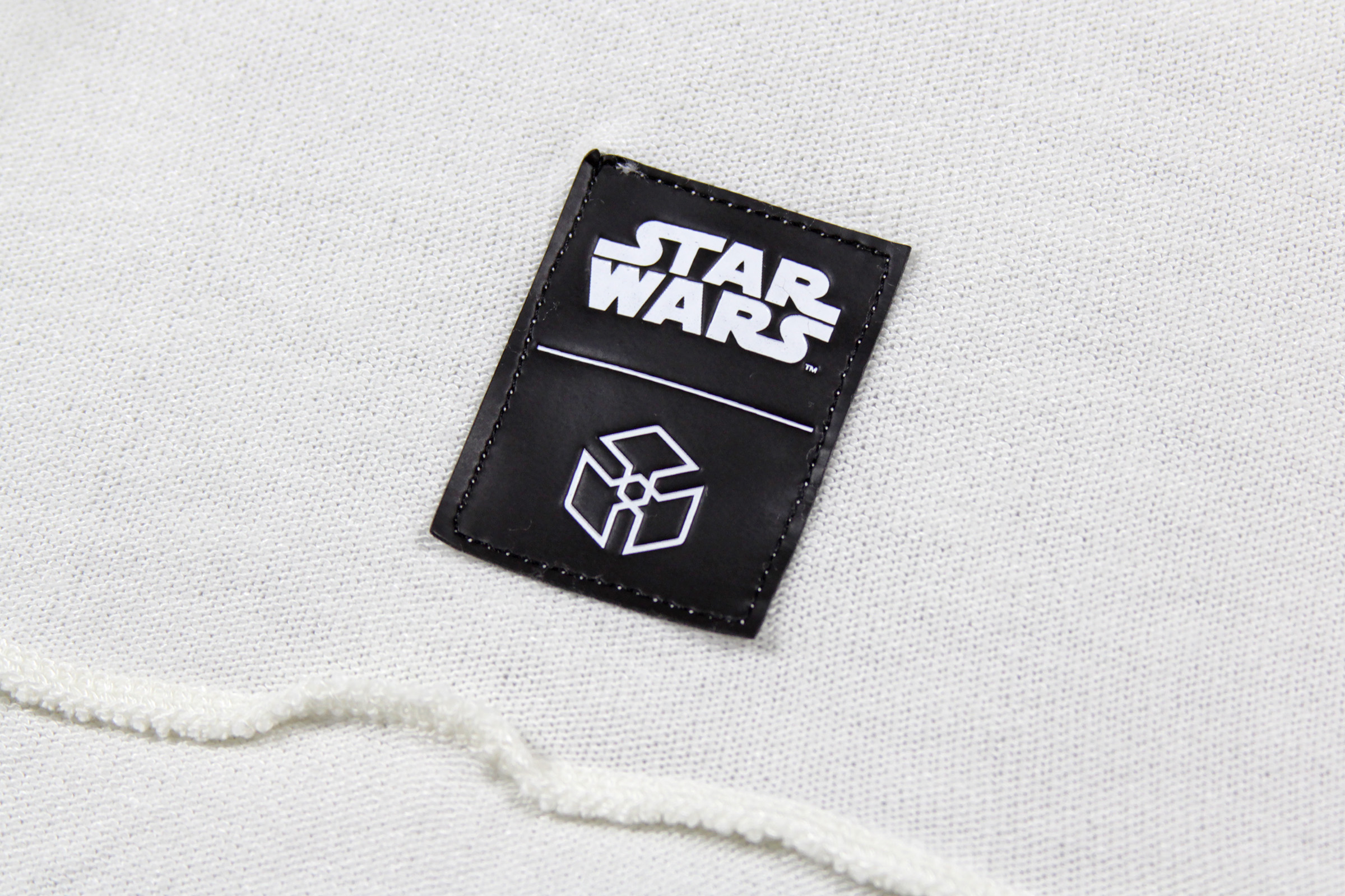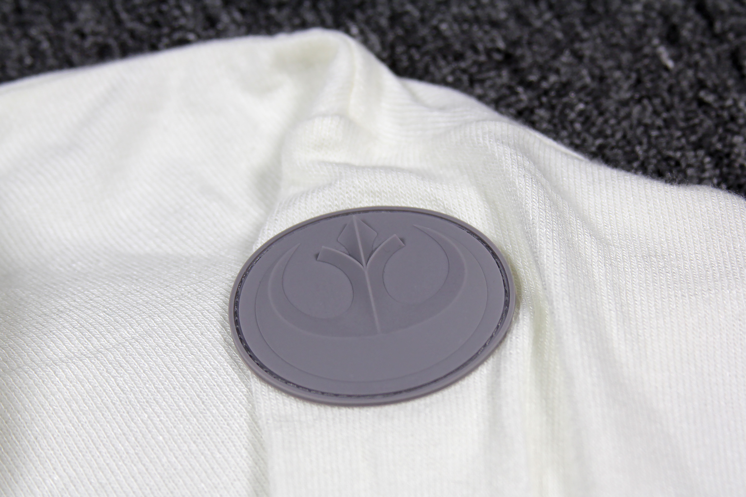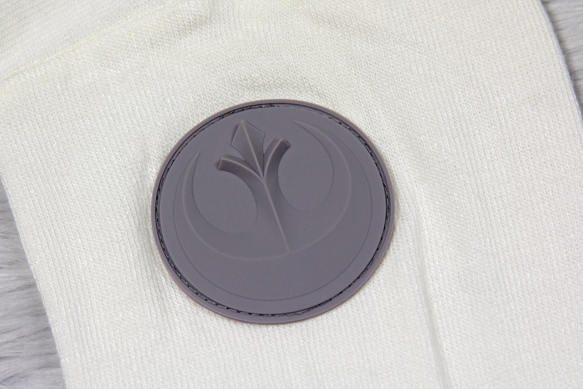 The left sleeve features a grey badge of the Rebel Alliance ‘starbird’ symbol. The grey colour works nicely with the pale sweater, drawing inspiration from the accessories Leia wears with her white outfits in A New Hope – silver plates on her belt, and later, silver jewelry and shoes during the Yavin medal ceremony. Whenever I think of Princess Leia’s white outfit, I always go for grey or silver accessories – so I happy to see Musterbrand chose grey too.
