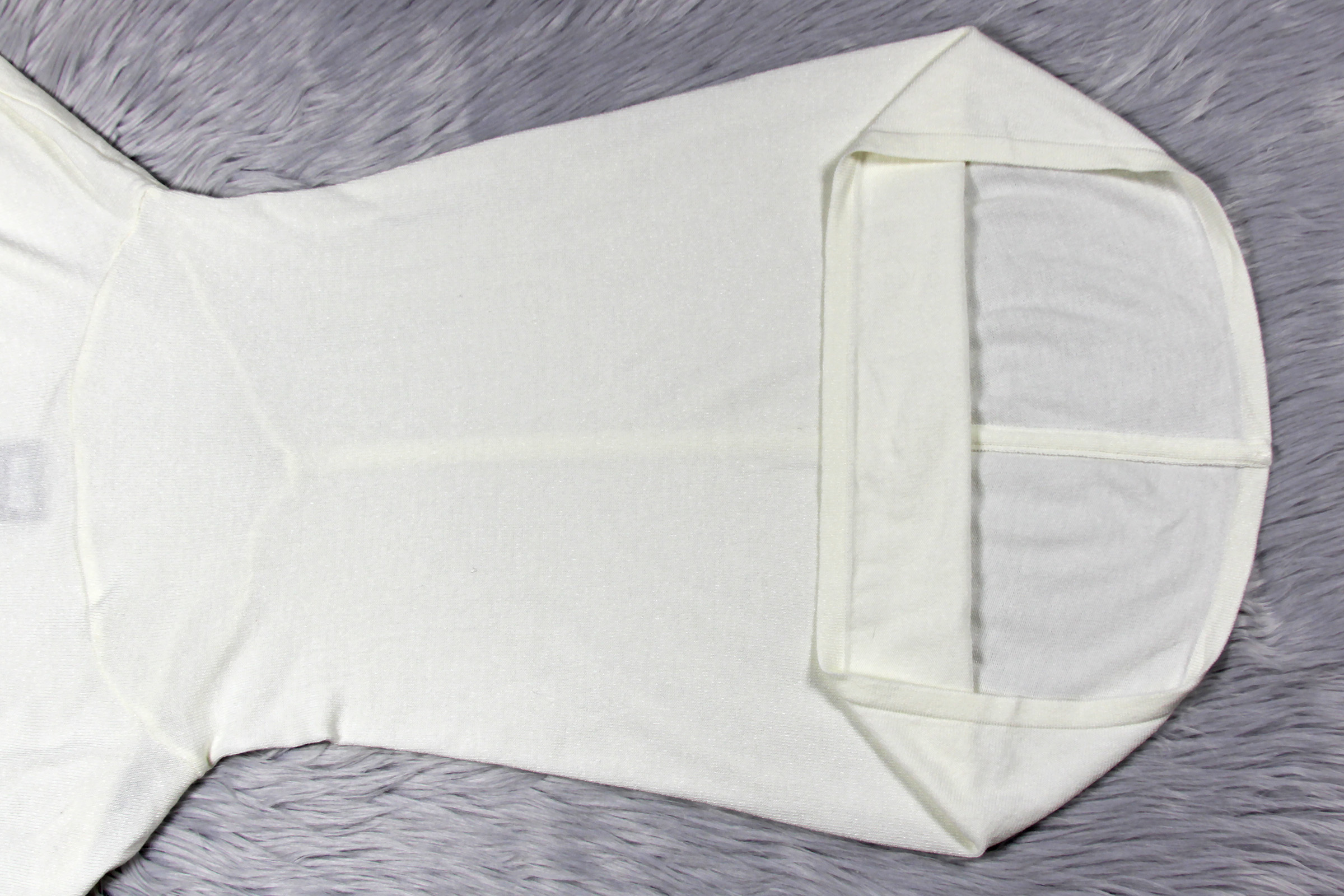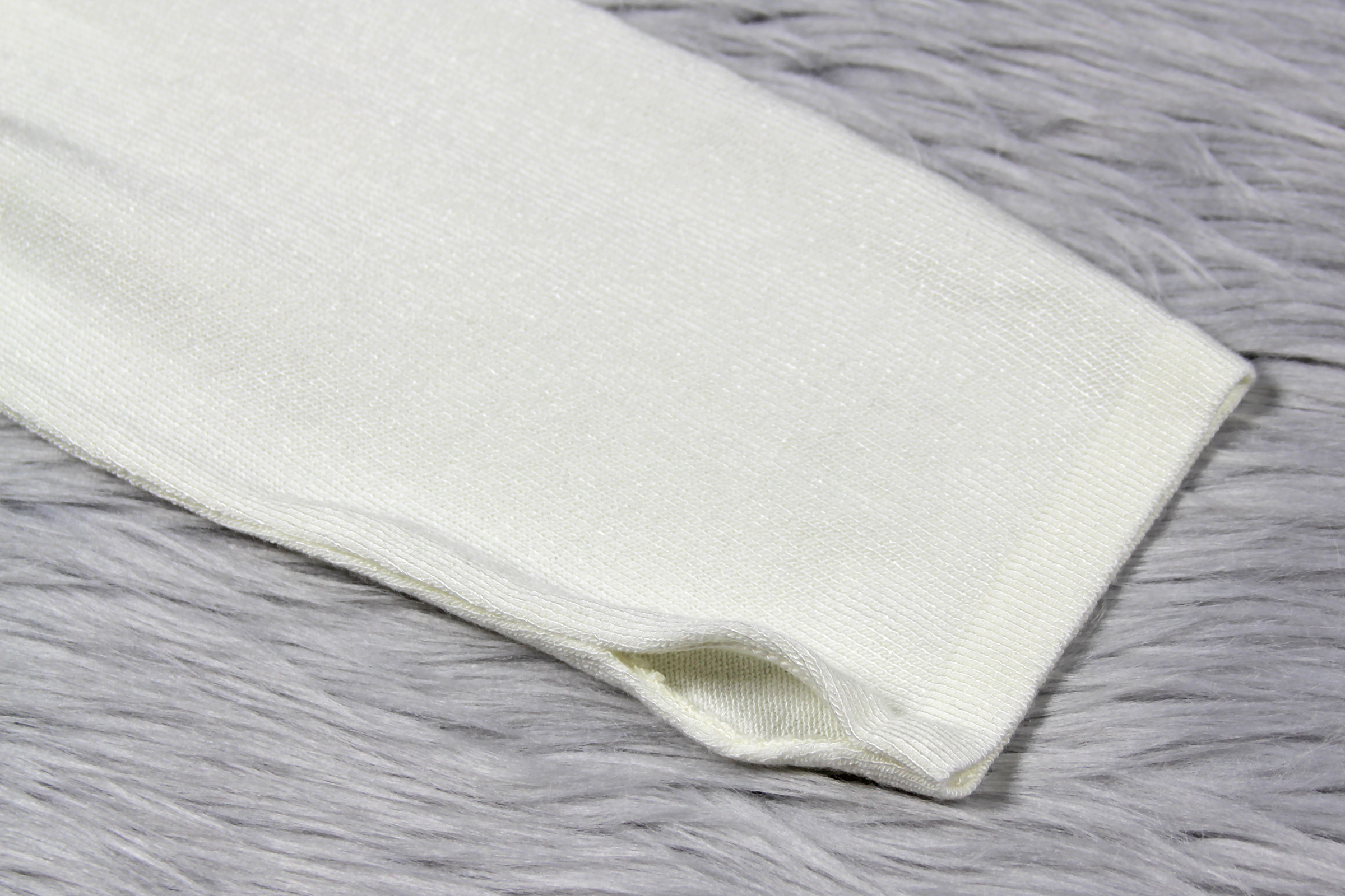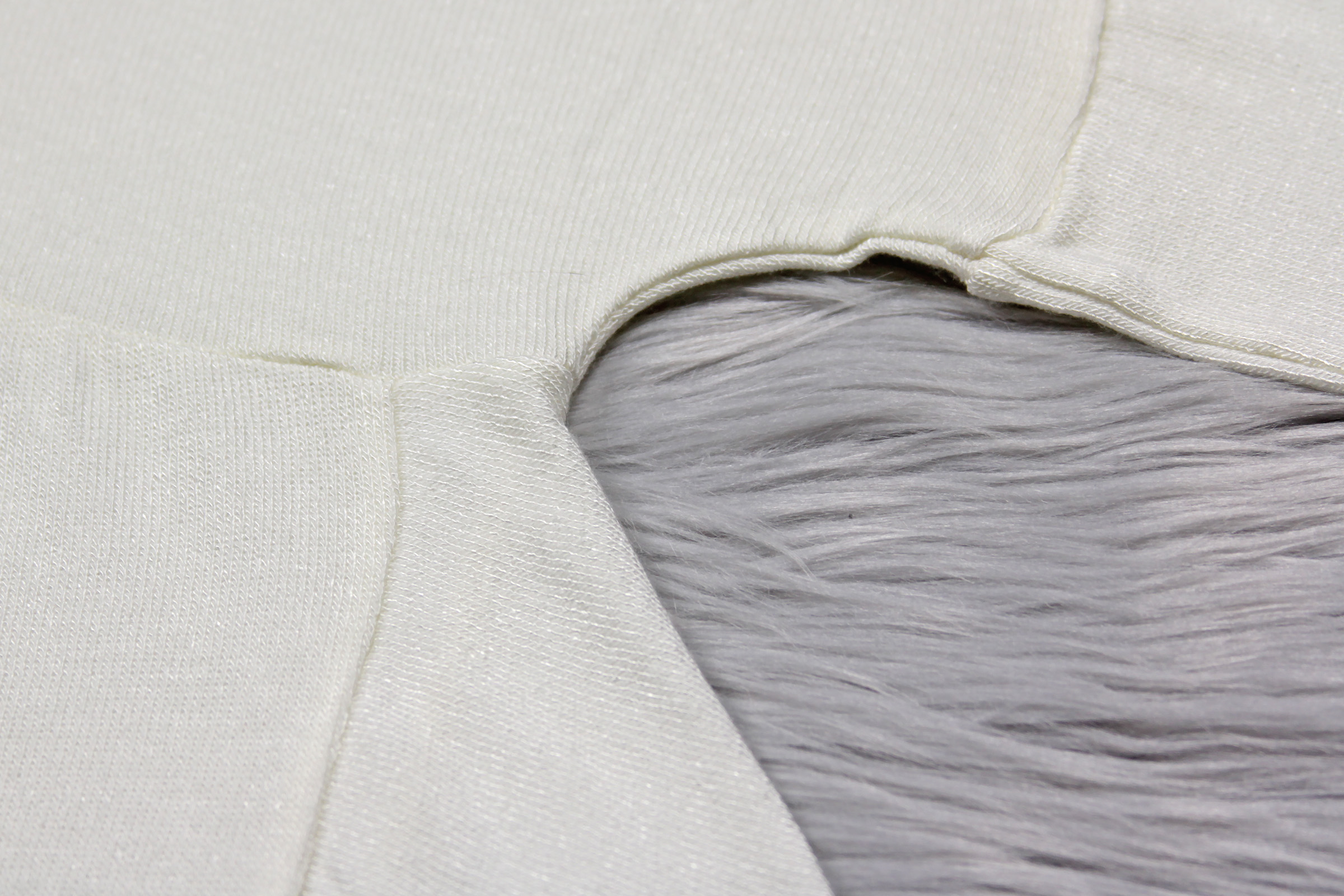 The sleeves are long and fitted – not wide and draped like the original Princess Leia white dress. White sleeves can get a little dirty, so keeping the hem closer to your hand will help avoid any accidents with long swinging sleeves. The end of each of the sleeves has a thumb hole, inserted in the side seam on the inner arm. The longer sleeves coordinate well with the long draped style of the sweater, creating the illusion of the original dress, rather than copying it.