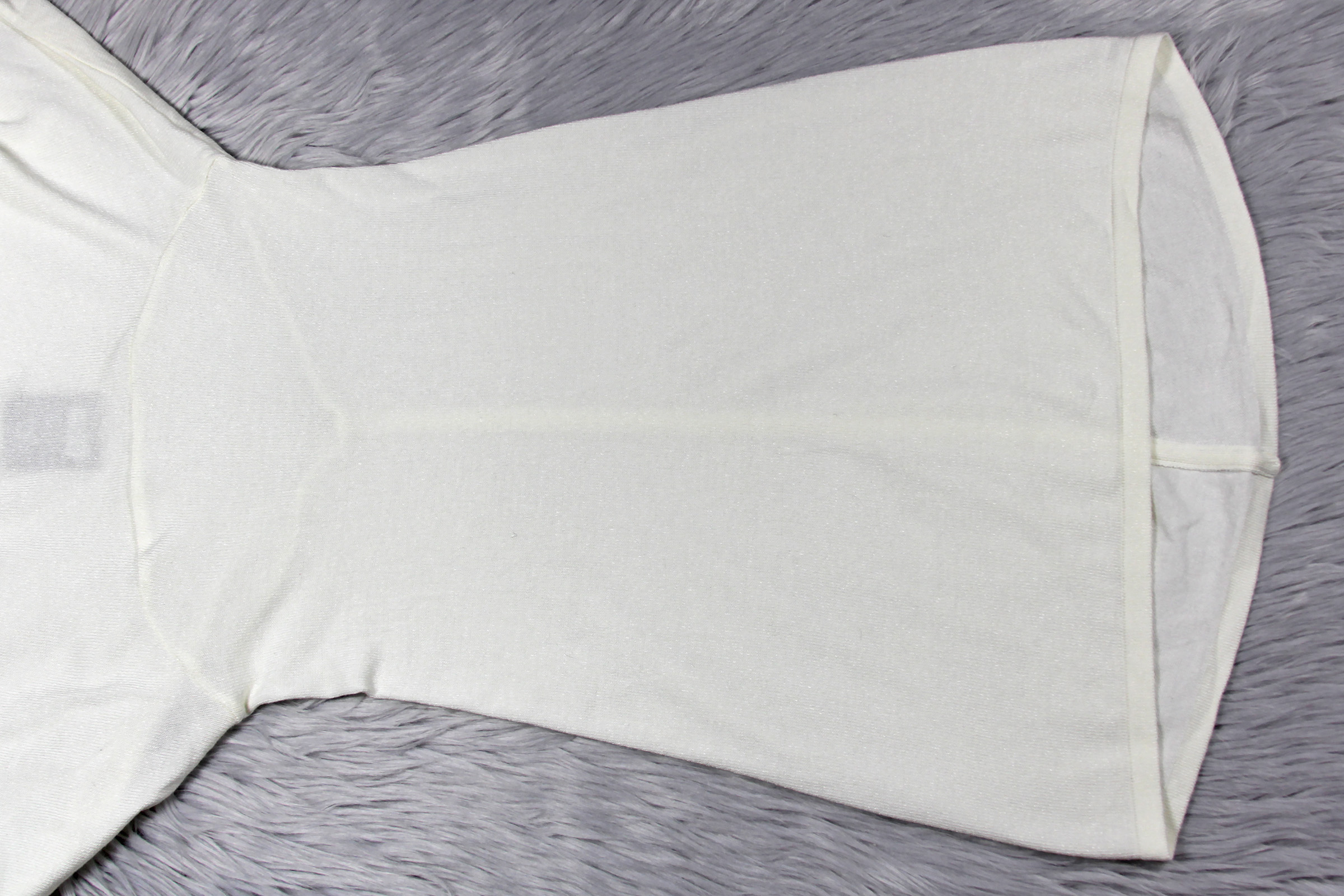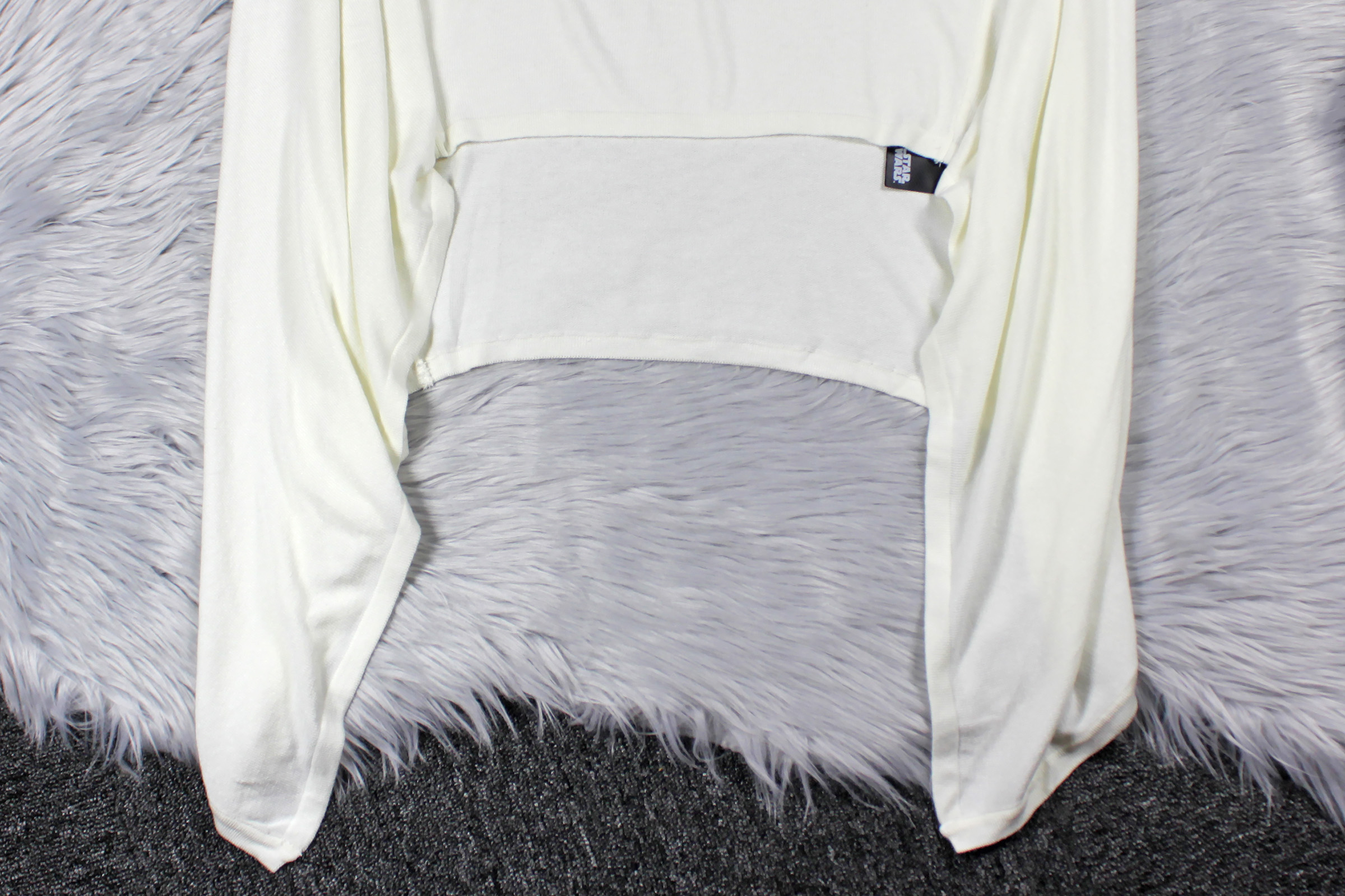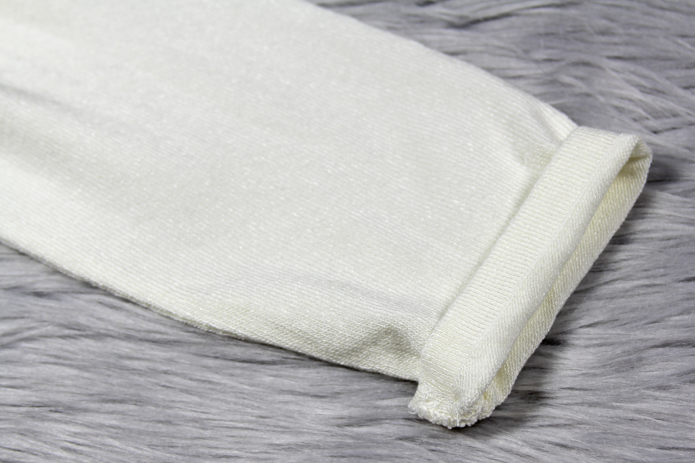 The sleeves are long and fitted – not wide and draped like the original Princess Leia white dress. White sleeves can get a little dirty, so keeping the hem closer to your hand will help avoid any accidents with long swinging sleeves. The end of each of the sleeves has a thumb hole, inserted in the side seam on the inner arm. The longer sleeves coordinate well with the long draped style of the sweater, creating the illusion of the original dress, rather than copying it.