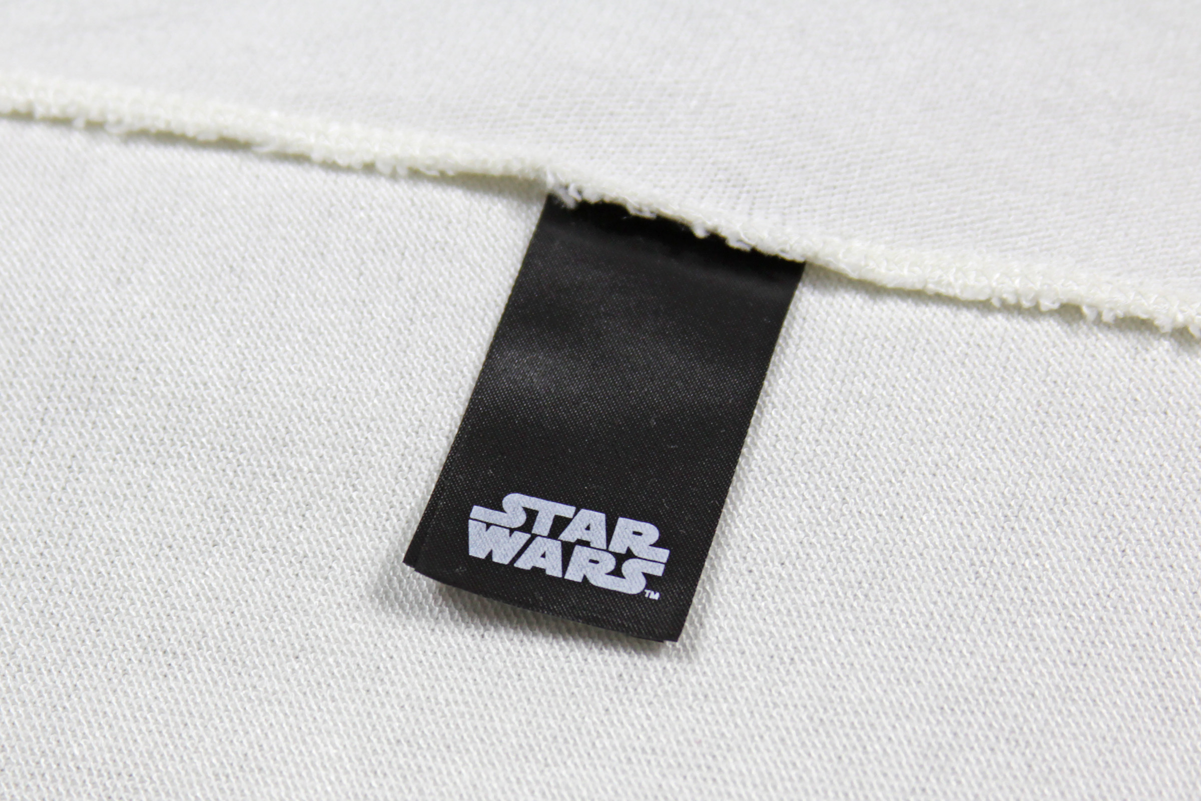 Sewn into the left lower inner side seam, there are three black fabric tags – the first features the Star Wars logo, the second features the Musterbrand logo, while the third features the fabric composition and garment care instructions.