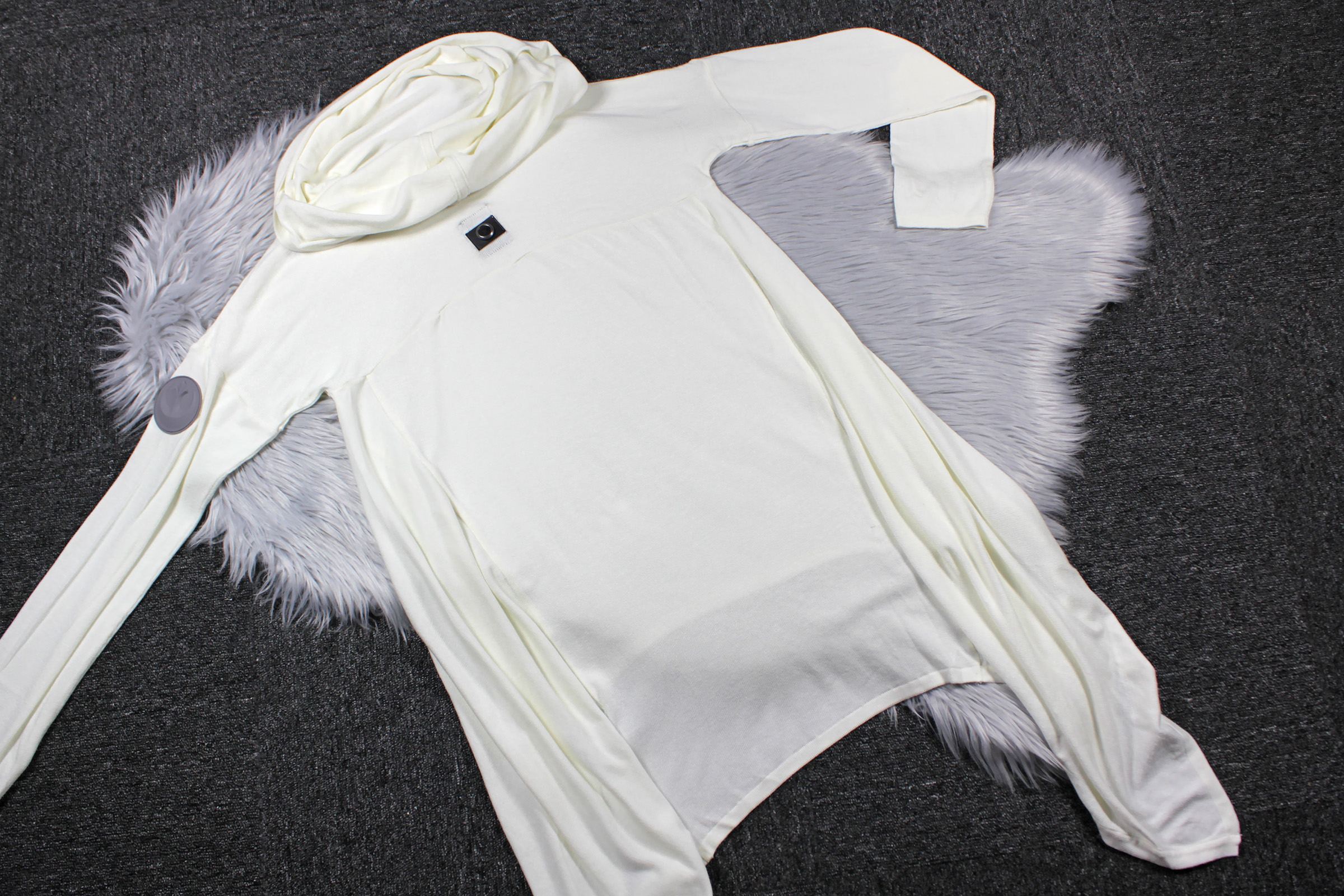 The Princess Leia sweater is made from an off-white knit material, and is inspired by Leia’s classic white dress from A New Hope. The sweater has a cowl/scarf-style collar, long sleeves with thumb holes, and a long draped high-low hemline.