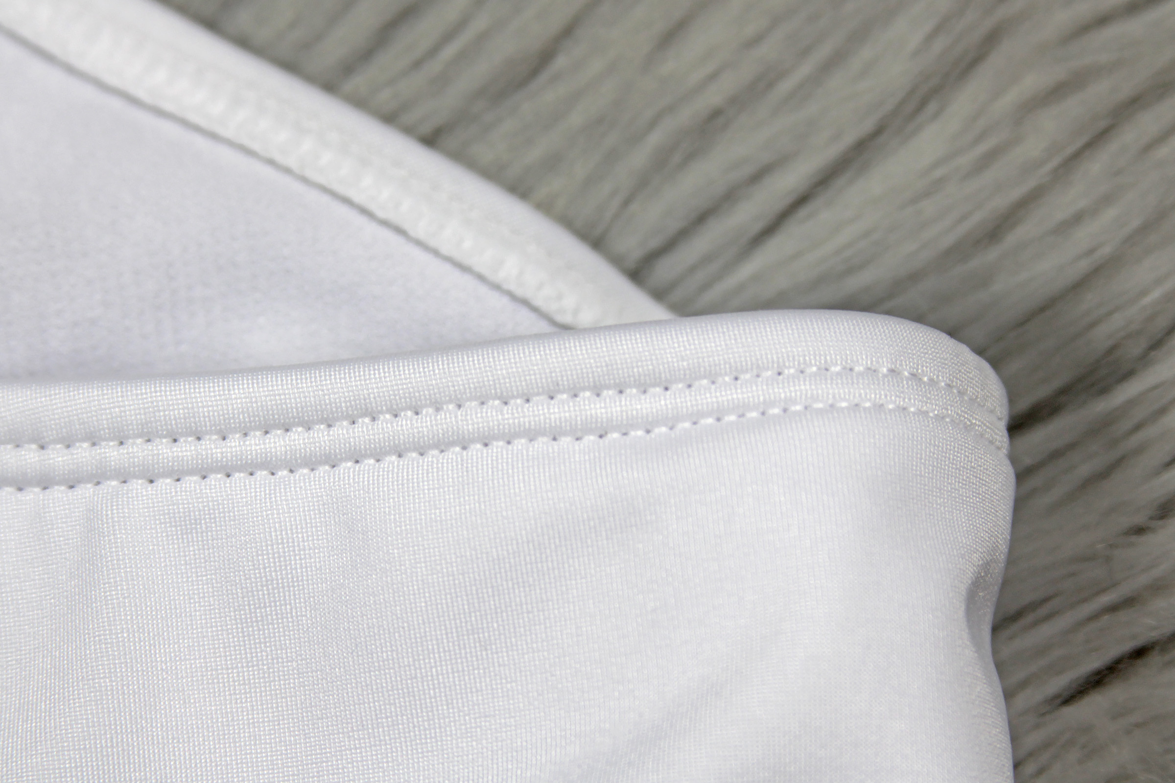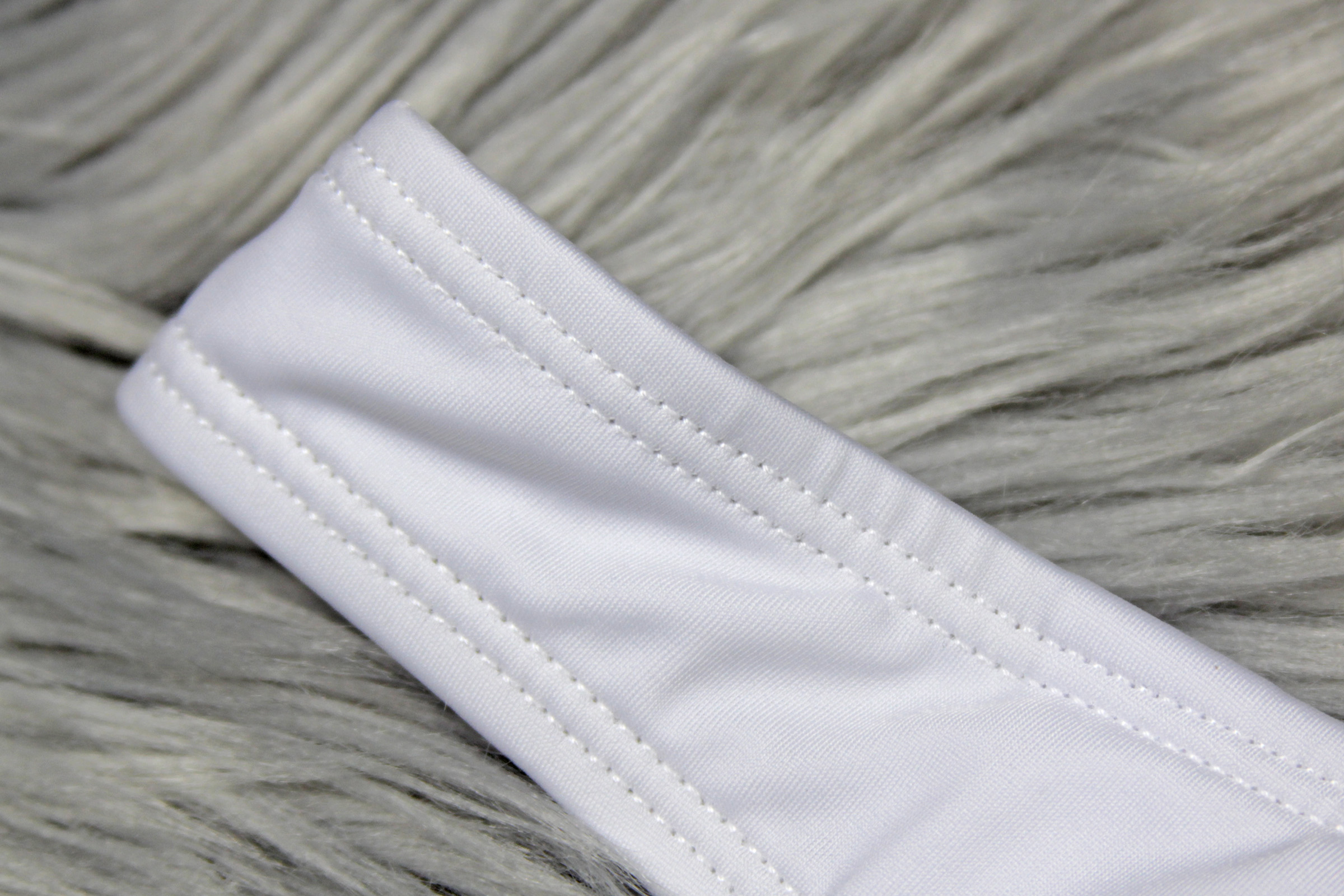 Turning the swimsuit inside out, the entire swimsuit is lined with matching white lining fabric. This fabric has subtle texture to it, and is soft against the skin. Now with a white swimsuit, I was concerned about how see-through the fabric may be, and of course this was taken into consideration.