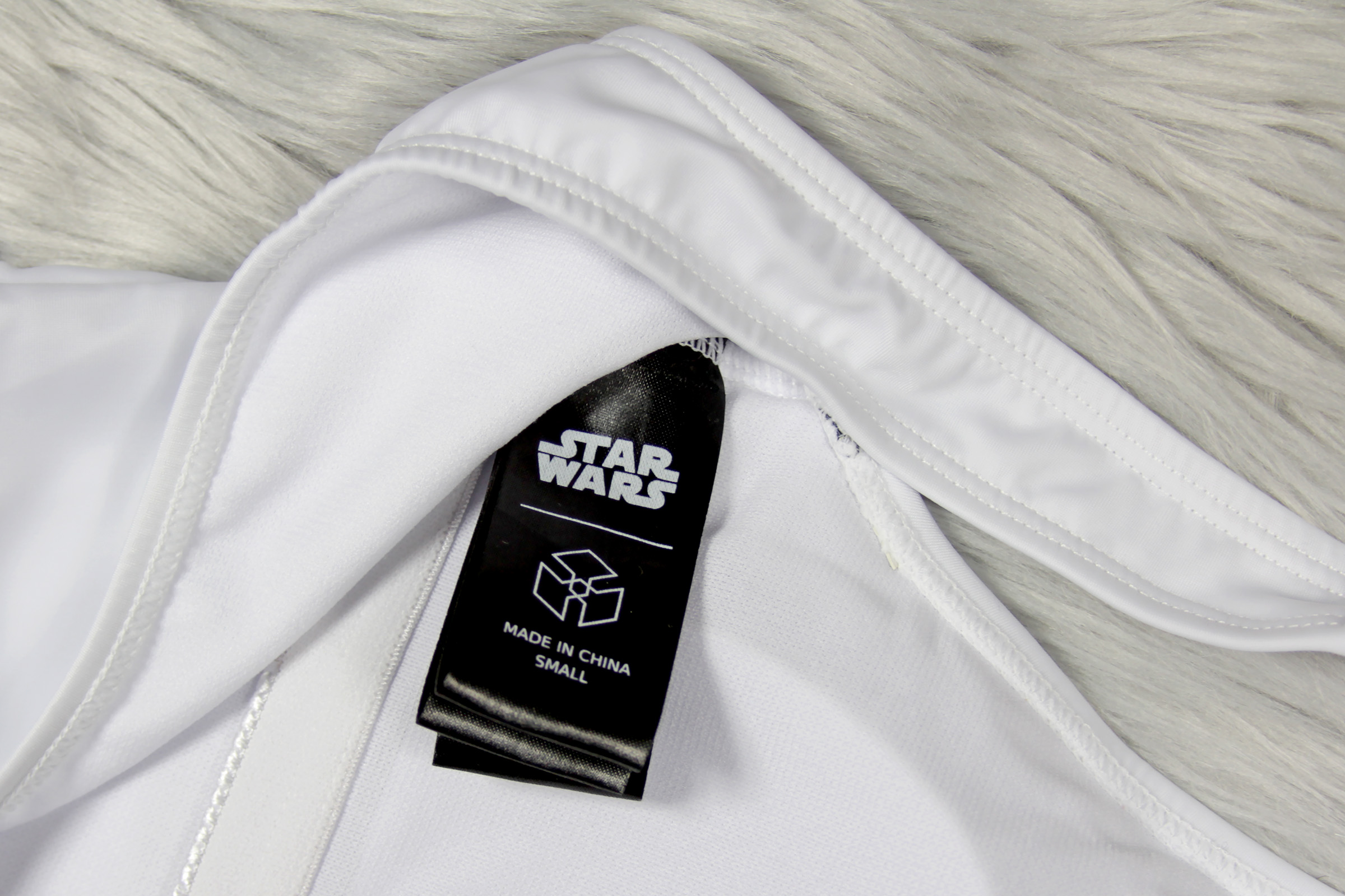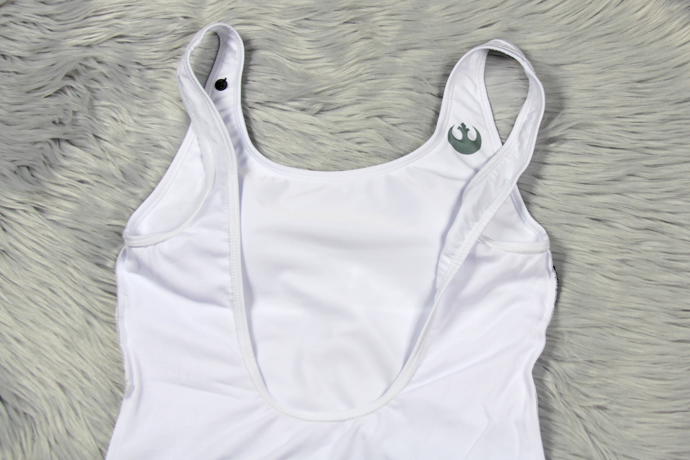 The Princess Leia swimsuit came in a clear plastic packaging bag, with the Musterbrand logo printed on the front. The swimsuit is a classic one-piece design, inspired by Princess Leia’s white outfit from A New Hope. Made from 85% Polyester, 15% Elasthane, the white swimsuit has matching white lining fabric, and removable soft bra cup inserts.