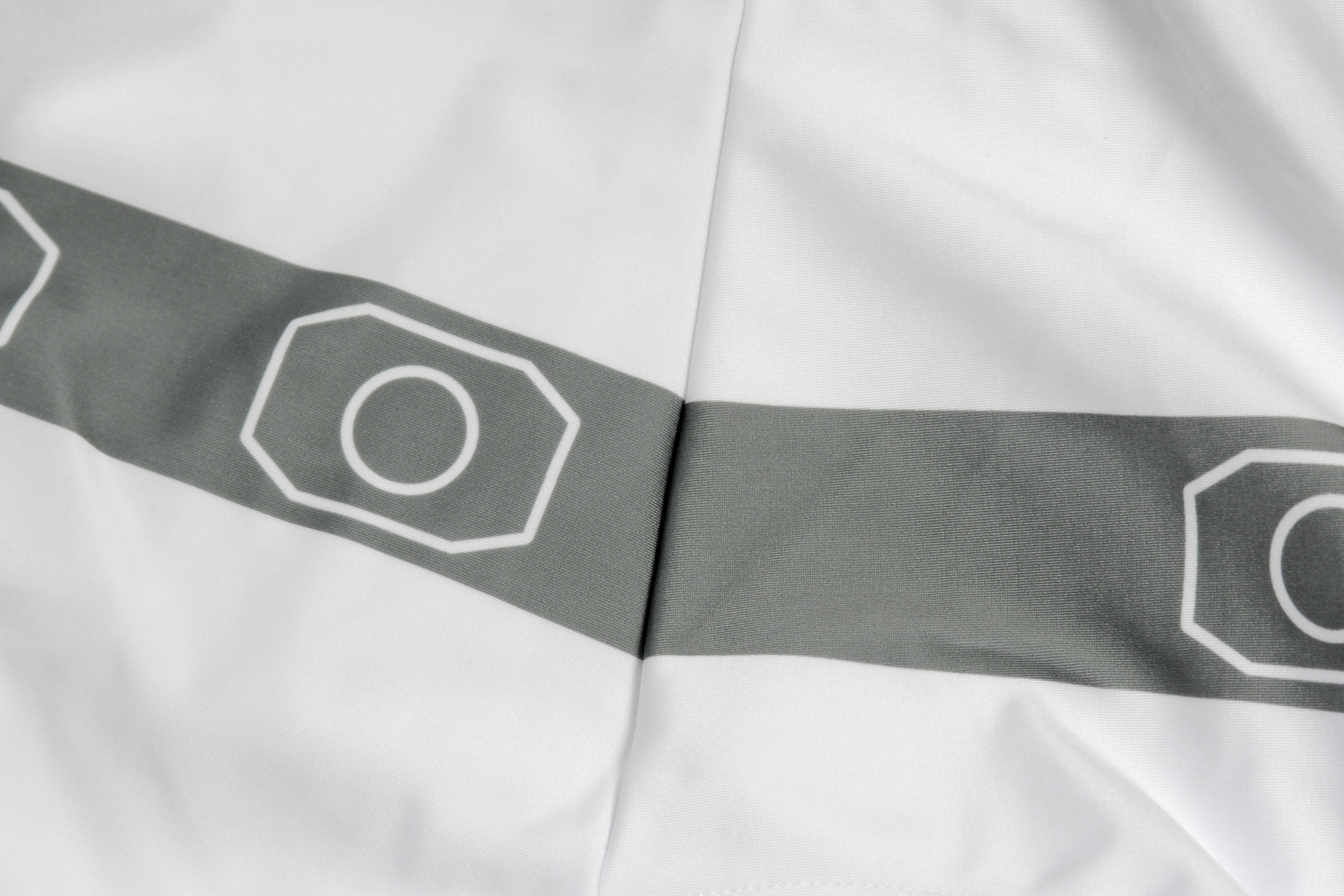 The main design detail of this swimsuit is of course the ‘belt’ print. This is inspired by Princess Leia’s belt from A New Hope – fans will know that Leia wears a white belt with silver details with her classic ‘senatorial’ dress, and a silver belt with silver details with her Yavin ‘ceremonial’ dress. White-on-white detail doesn’t show up well for a printed design, so for this swimsuit (and many other Princess Leia costume-inspired garments), the belt is depicted in a grey/silver colour instead of white.