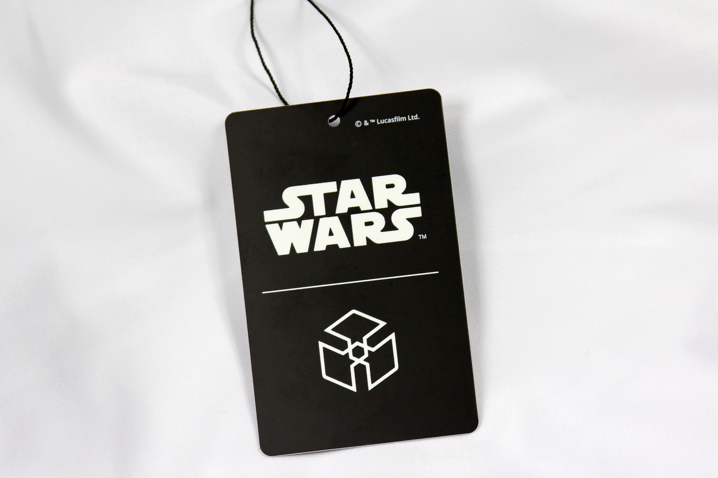 The black cardboard store tag is attached with black cord, which is looped through the inner garment tags – it doesn’t pierce the garment itself, which is great to see. The store tag features the classic Star Wars logo, the Musterbrand logo, and Lucasfilm copyright information on the front, and bar code information on the back.