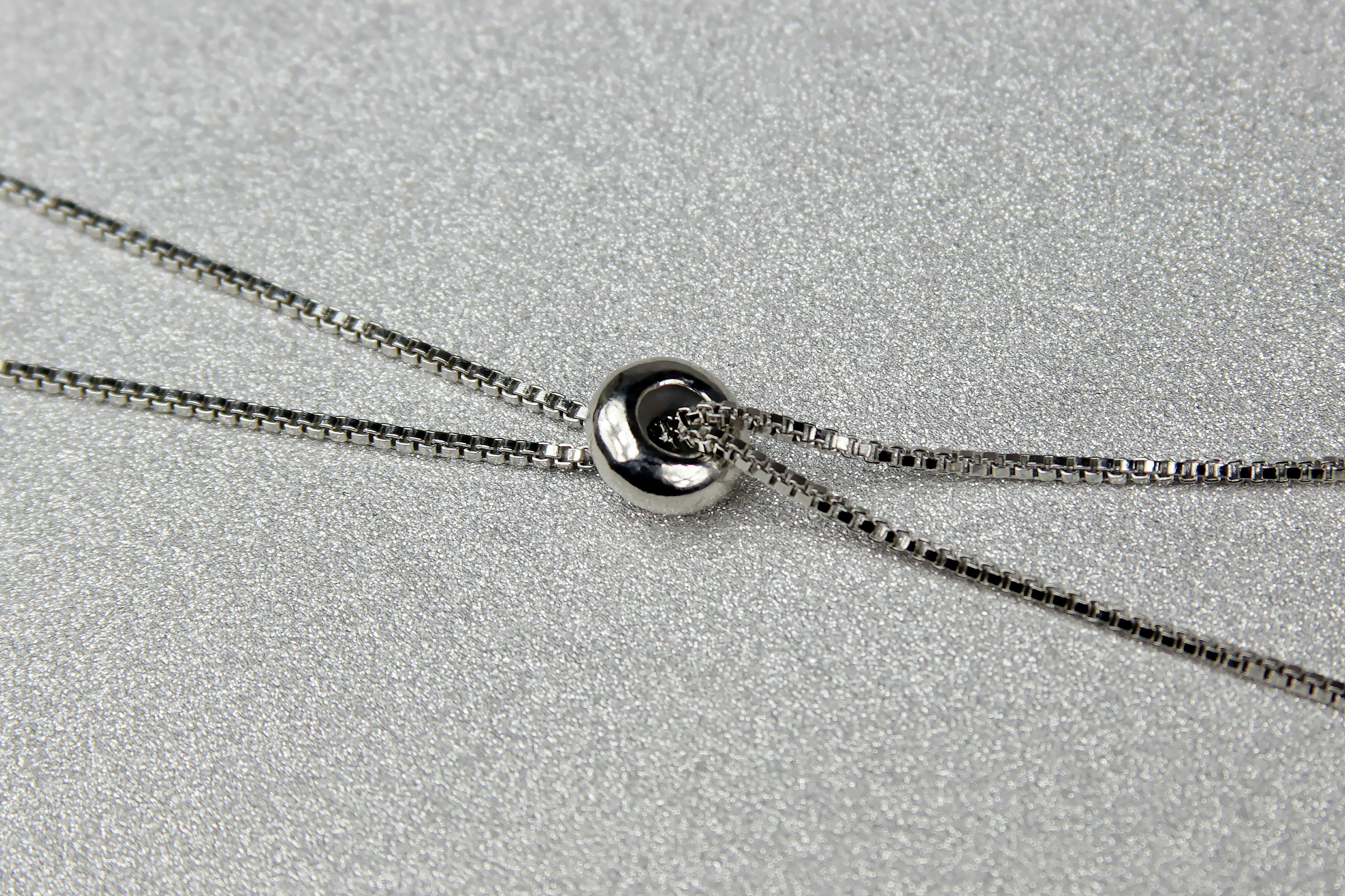 Instead of a closure at the apex of the chain (worn behind your neck), this chain adjusts with a circular bead at the front. The inside of the bead is just small enough to fit two strands, but holds in place. You can adjust the position of the bead, and how high/low each of the pendants sit – that is, they can sit at the same height as each other, or you can adjust their positions to have one higher and one lower. The higher up you adjust one pendant, the lower the other pendant will hang.