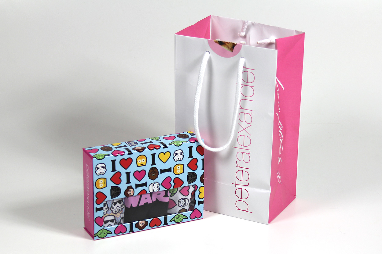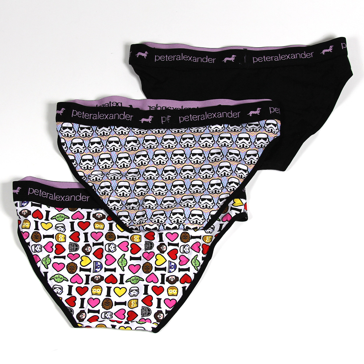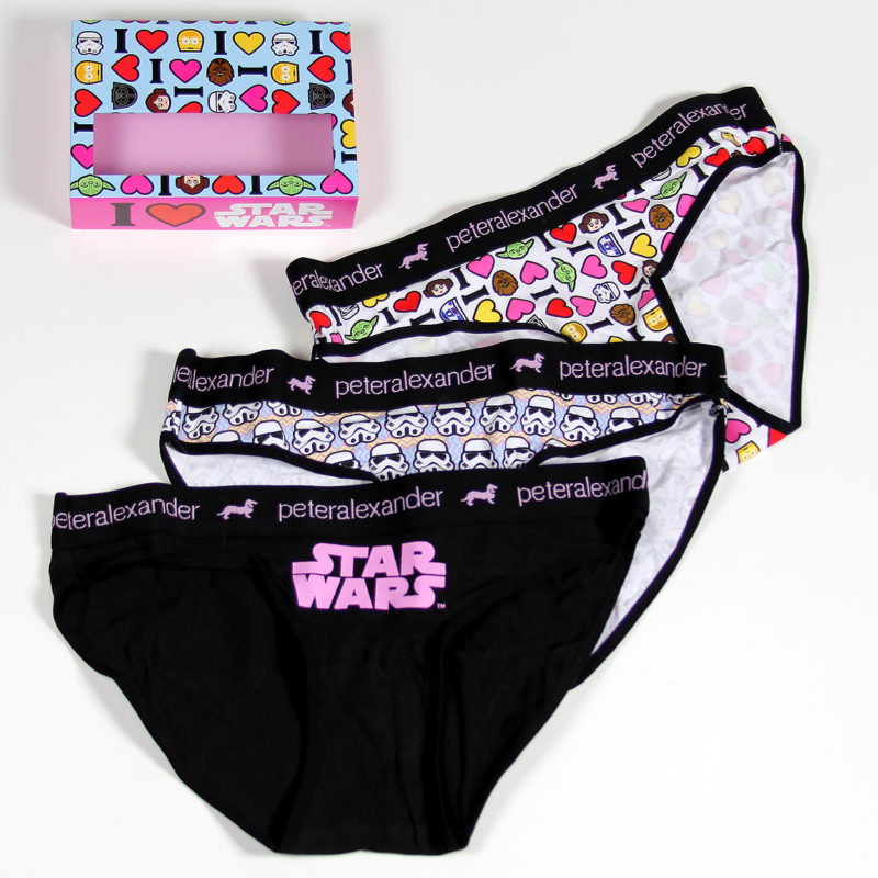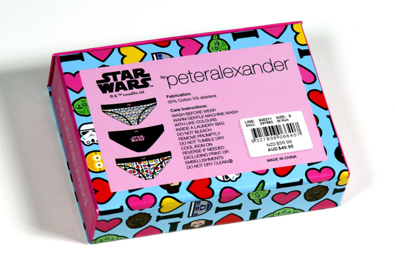 I first heard about the Peter Alexander Star Wars sleepwear collection from a fellow Star Wars collector – and of course rushed out to my local store to check it out for myself. Not being a big pajama wearer myself (shhh…), and having spent a bit in recent on-line shopping, I left the store empty handed. A little while later, I was at the same mall and noticed a sale sign in their window, so peeked in to see if they still had some of the Star Wars collection. A smaller selection was still there, and on sale! After a while trying to decide, I chose to buy the boxed 3-pack set of Star Wars women’s underwear. The original price was NZ$59.99, but the 20% off sale brought it down to NZ$47.99 (working out at approx NZ$16 each, not bad for licensed designer underwear).
