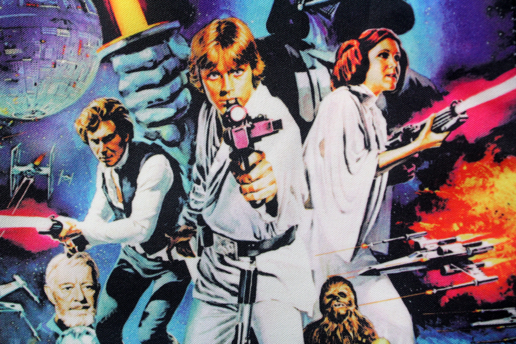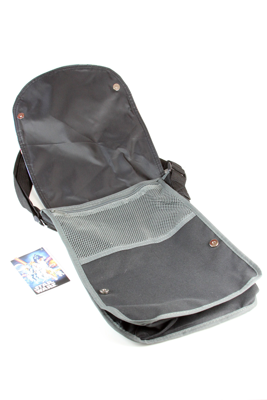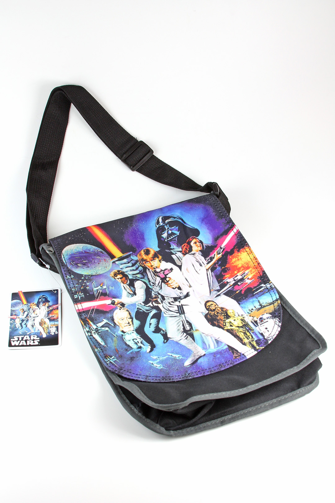 I bought this Star Wars poster crossbody bag a little while ago, as I was looking for a casual bag for conventions. Originally priced at US$24.99 from Spencer’s, it is now on sale for US$12.97 (limited stock remaining). The black canvas bag features grey trim around the edges, with a grey mesh zip-up pocket underneath the front flap. The front flap features a colourful print of the classic Star Wars poster art by Tom Chantrell, and closes with two magnetic button snaps. I do find it a little odd that the main compartment doesn’t have a closure like an internal magnetic snap or zip, it is open at the top. Inside the bag is lined with black fabric, with one zip-up pocket. The bag can be worn on the shoulder or across the body with it’s adjustable strap – it measures approximately 106cm at full length. The bag itself measures approximately 33cm high, 23cm wide and 8.5cm deep. It’s a neat casual bag, I love the vivid print of the classic poster art.