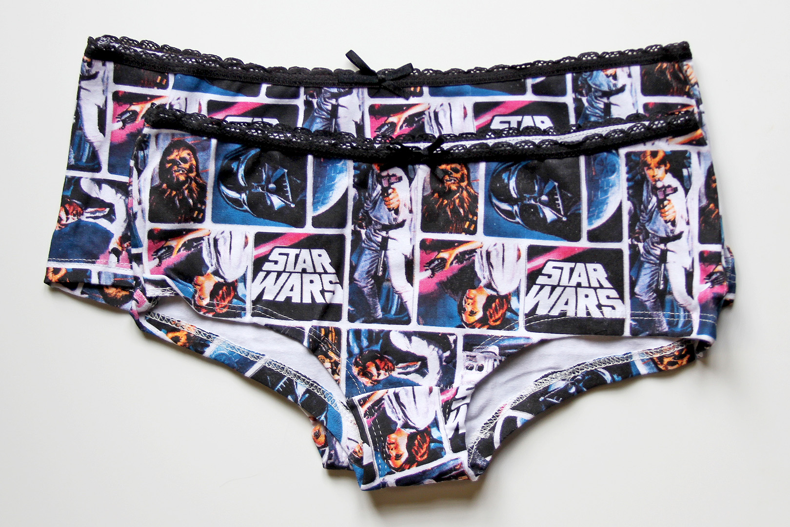 The three women’s briefs each feature a different design – a pink pair with a repeating Star Wars logo print in black, a multi-colour pair with a poster art grid pattern, and a black pair with ANH dvd cover art image with a gold border (which looks like glitter, but only printed).The briefs are 95% cotton, 5% elastane, with a trim of lace along the top edge, accented with a small bow at the front. The pink and multi-colour briefs are sewn from printed fabric, while the black pair has the image printed on the front (the back is plain). Funnily enough that matches the underwear set by Peter Alexander – that is, two pairs from printed fabric, one black pair with a printed image on the front. The printed image doesn’t stretch, so it could be prone to cracking over time if overstretched. The size xs measure approximately 29cm across the waist band, while the size s measures approximately 34cm across – you can see a size comparison in the photos below. I think they’re fantastic, so happy to have some more Star Wars to wear under my clothes too!