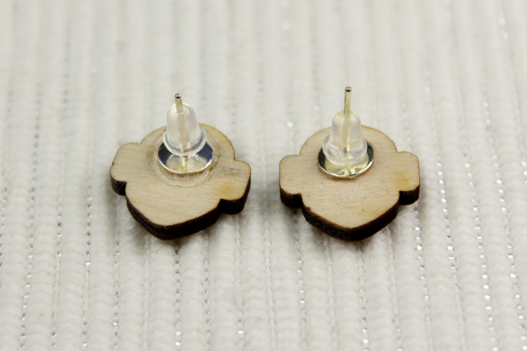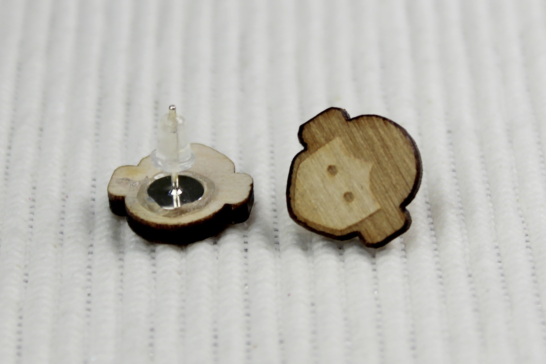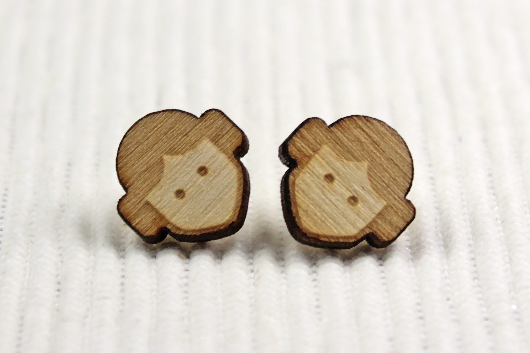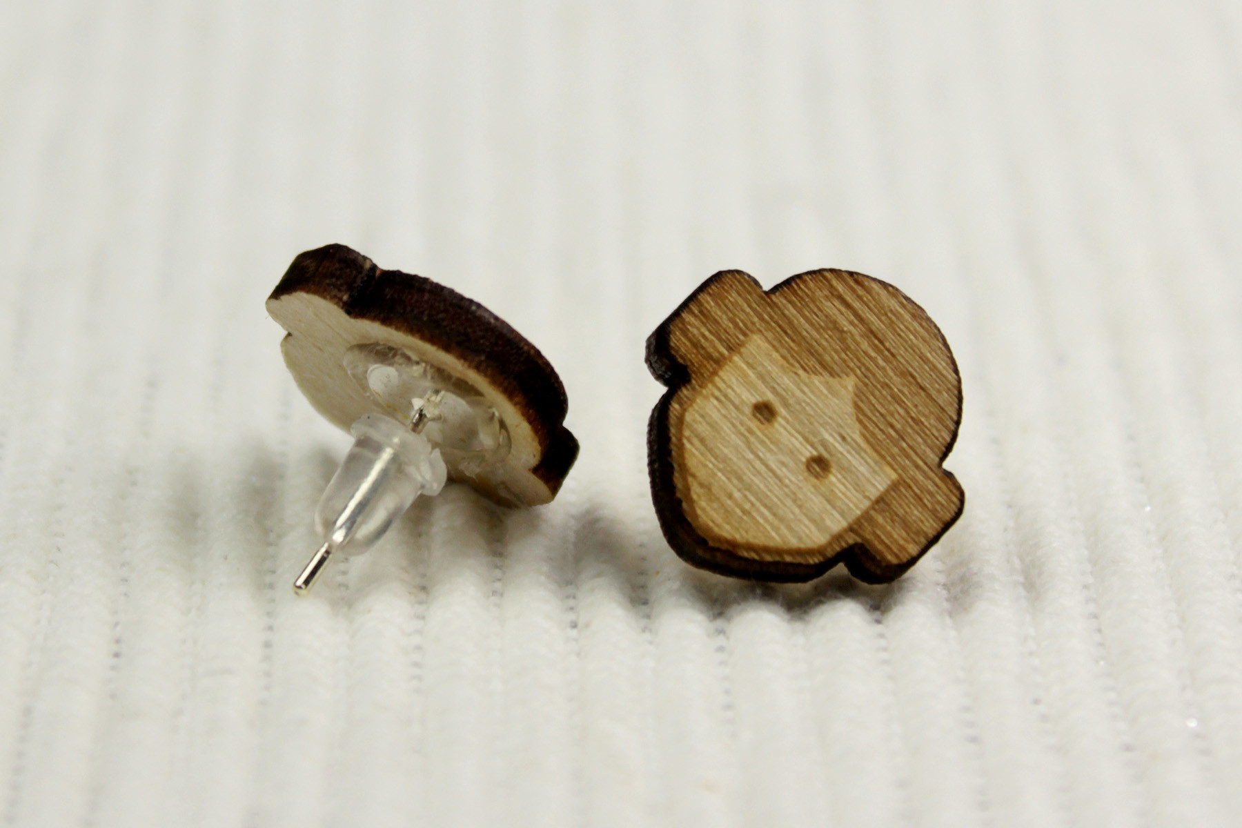 The earrings are laser engraved, made from 3mm thick birch plywood – they measure approximately 1.4cm high and 1.4cm across. The design features Leia’s classic bun hairstyle, with a pale face area, 2 dot eyes, and a slightly darker hair area. The hair and eyes are slightly recessed compared to the face area, so there is a subtle 3D texture to the design. The cut outer edges are a darker brown than the surface, which helps define and frame the shape.
