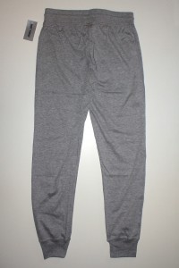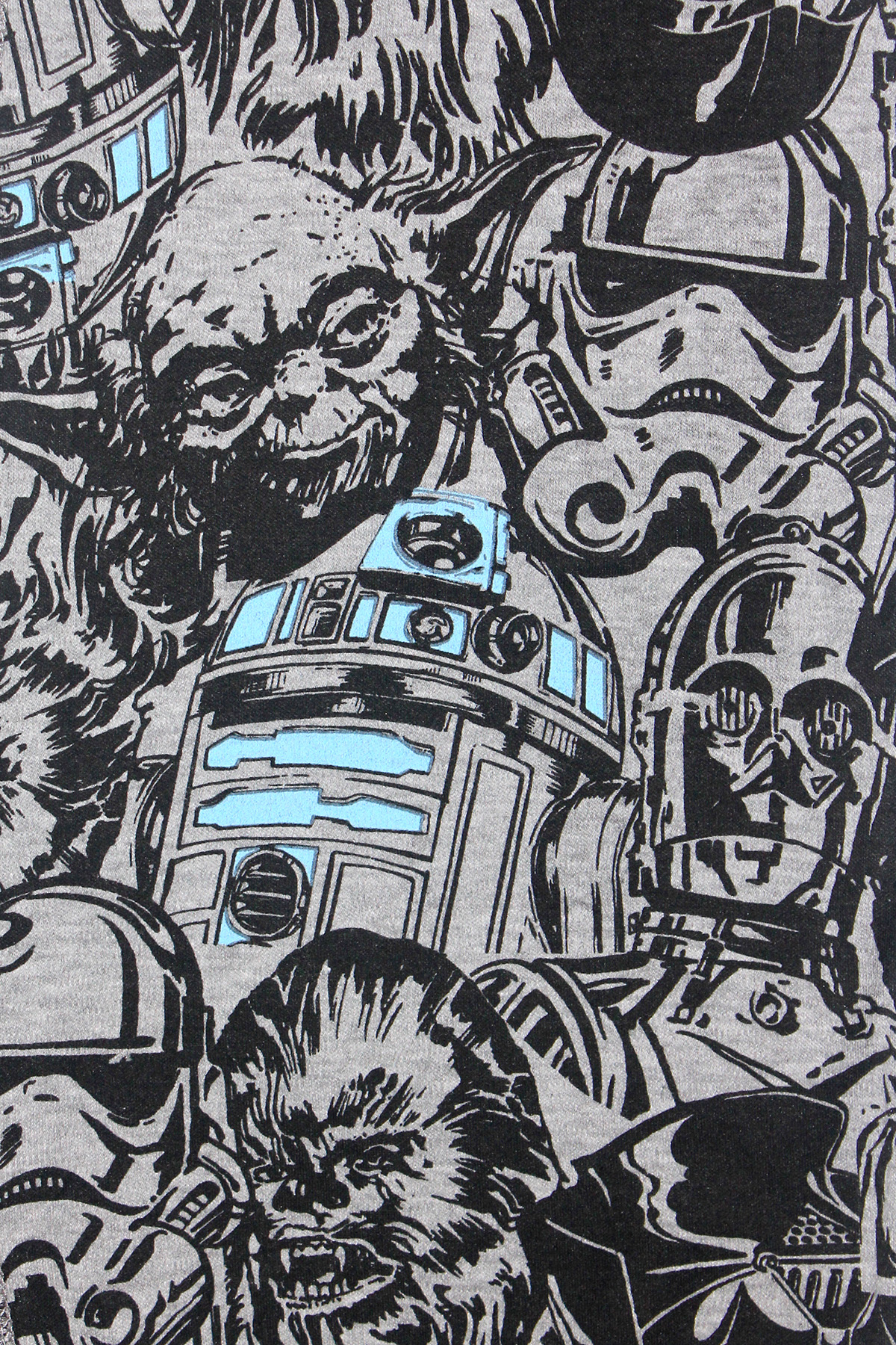 The grey pants have a drawstring/elastic waist band, with cuffs at the ankles/lower hem. The fabric is 60% cotton, 40% polyester – nice and soft with some stretch. The outside features the Star Wars logo down the left leg, printed in black with blue accents. The inside features an all-over repeating character print in black – with R2-D2 accented in blue. Most of the characters appear upside down – but ‘right way up’ when looking down at your legs while wearing the pants, which suits their ‘around home’ purpose. Wearing the pants ‘inside out’ means the garment tags are now on the outside (so should be carefully removed), and the drawstring is now inside the waist band. If you prefer, the drawstring can be removed altogether, as the waist already has a wide elastic band. The seam allowances are nice and flat for both sides (better than I’ve seen on some other reversible clothing), though the grey stitching is more visible on the reverse side due to the contrast against the black print. Whichever side you prefer, these comfy pants are perfect for wearing curled up on the sofa for a Star Wars movie night at home.