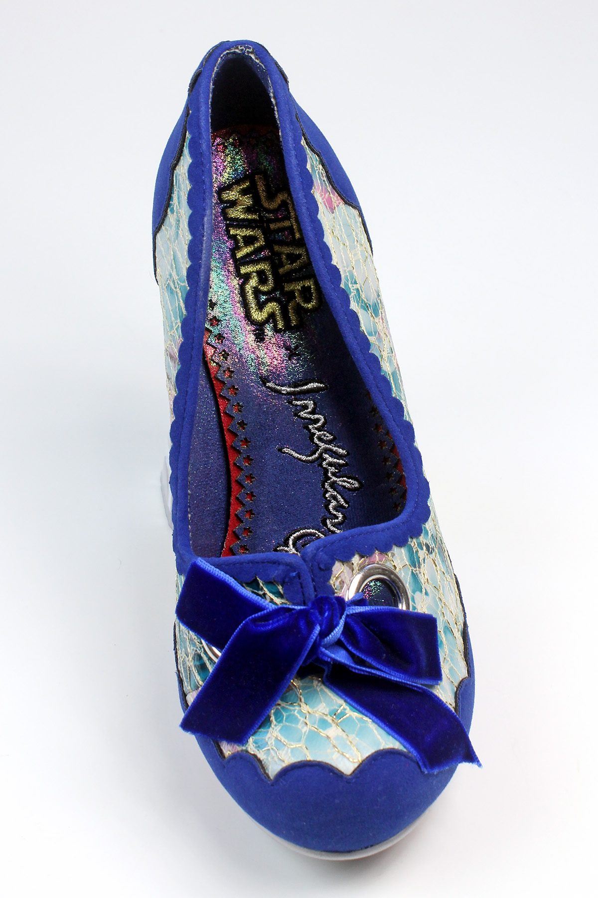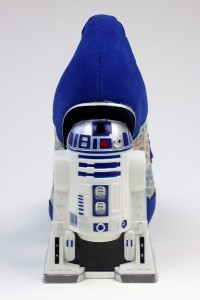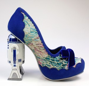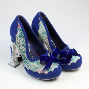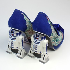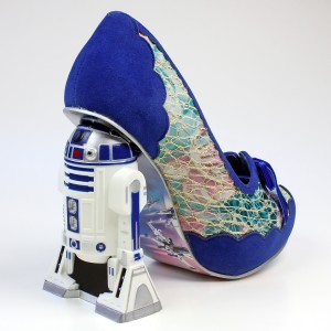 The R2-D2 shoes are made from a floral print leather with a lace overlay, and blue faux suede. The lace is fused down to the leather underneath, so you can’t snag it accidentally. The toes feature silver eyelets tied with blue velvet bows – a soft feminine touch to the design that I really like. It feels like a long time coming to finally have licensed Star Wars women’s shoes that didn’t look like they were designed for men, so I really appreciate the details of this design that set it apart from previous footwear options. The high heel paired with lace and velvet made this an instant wish list item for me – as well as R2-D2 of course! Irregular Choice are known for their amazing sculpted heels, so as a fan of the brand it was exciting to see sculpted heels in the Star Wars collection. The R2-D2 heel is accurately sculpted, in his classic ‘two leg’ mode – the paint details are nice and tidy all the way around. The area between R2-D2’s legs is filled in black, with the whole sculpt attached to a silver heel base – he feels very sturdy and solidly attached.