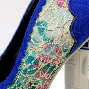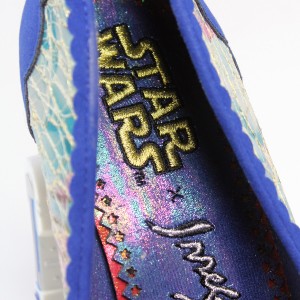 The attention to detail is amazing, like the fully embroidered Star Wars and Irregular Choice logos on the hologram insole. The European shoe size number is printed inside, and on the sole. The lace overlay has gold foil thread running through it, a lovely addition to the green and pink floral design of the leather underneath. The edges of all the blue faux suede areas are scalloped, further adding to the softer, feminine design. This design and the ‘I Know’ flats were, for me, the prettiest shoes in the collection, but they still have great attitude to go with any outfit you pair them with. There is a 2cm concealed platform, with a heel height of 12cm (approximately 4 3/4″).