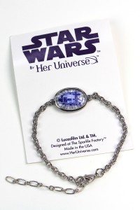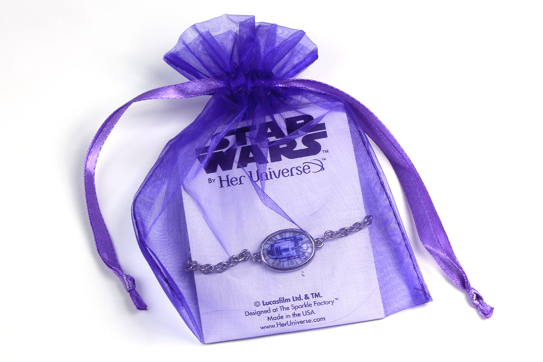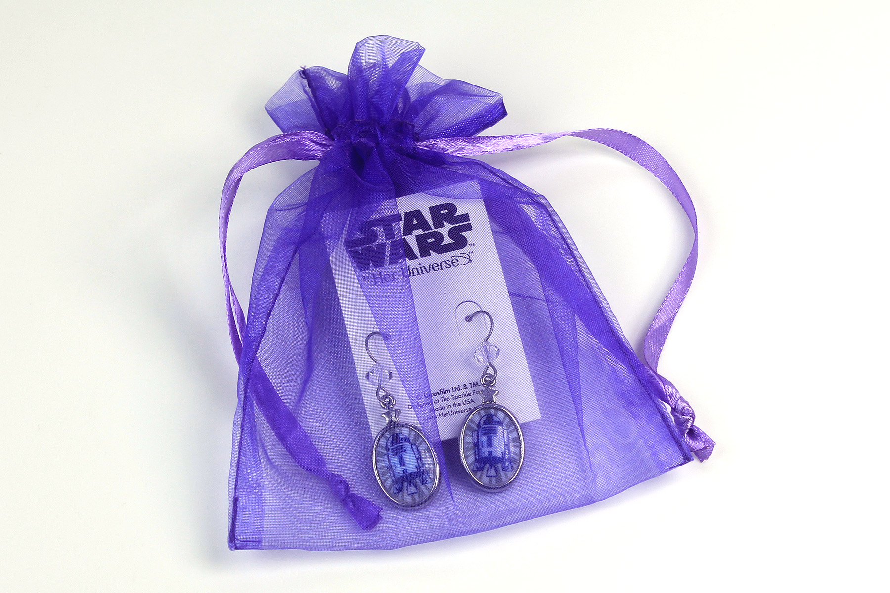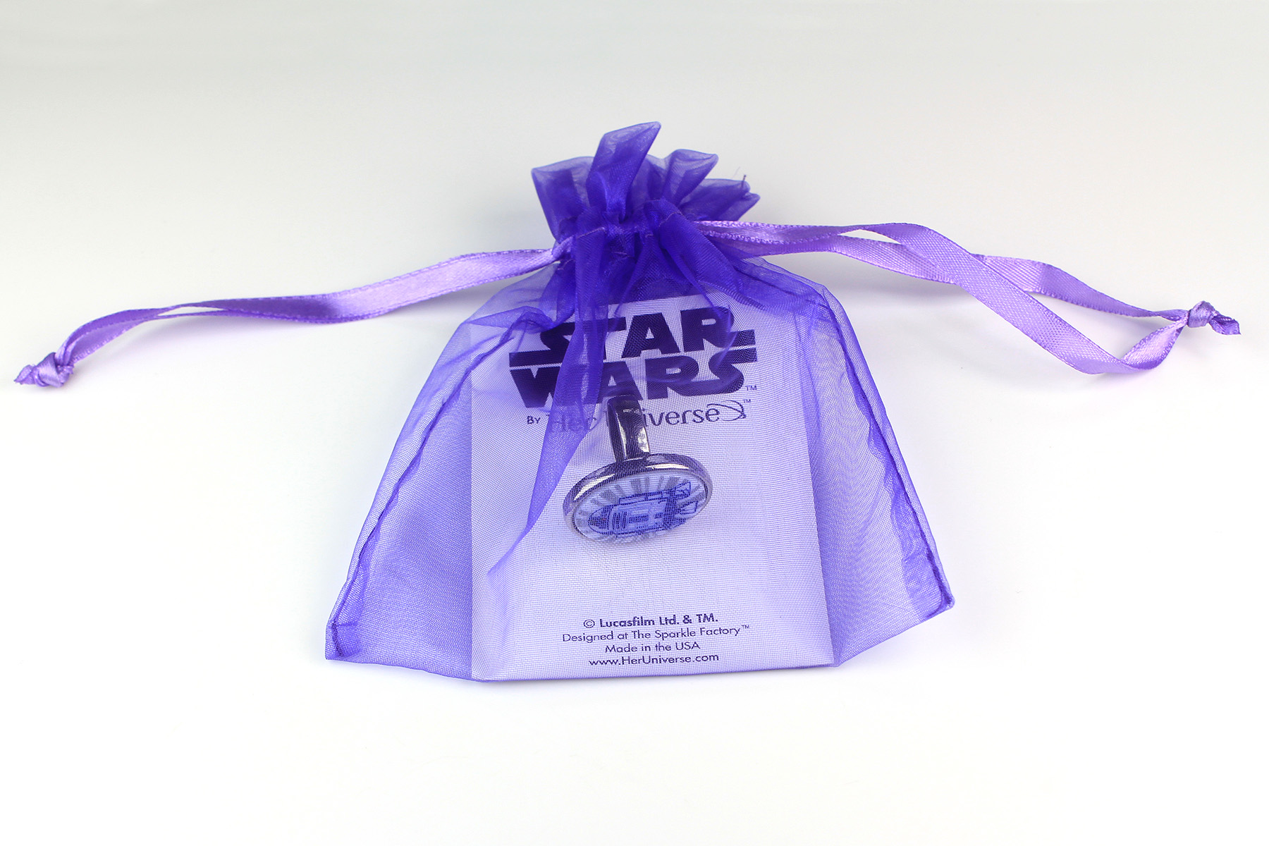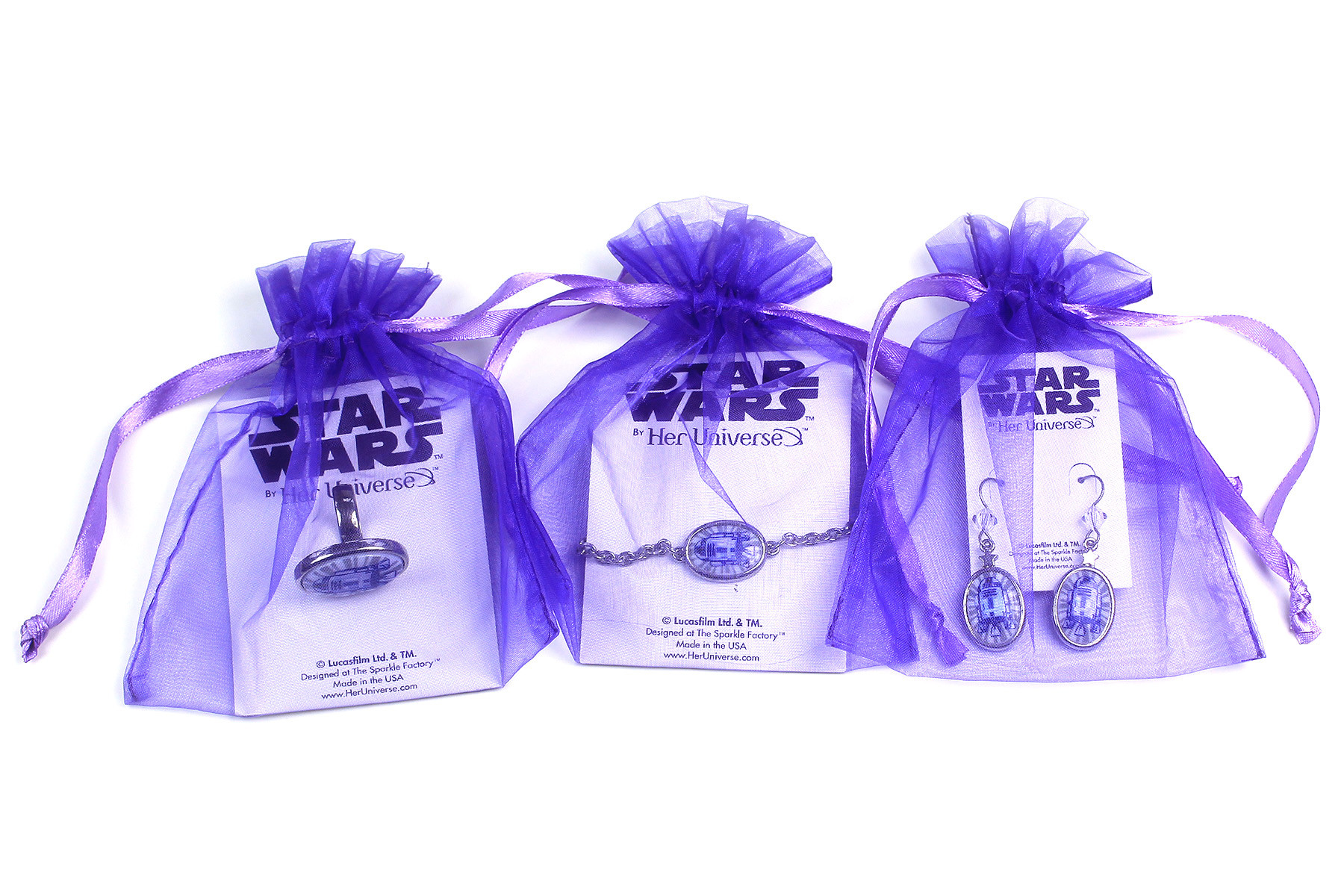 Each item came packaged inside a purple organza drawstring bag, with purple ribbon ties. Inside each bag is a white cardboard backing card with the Star Wars and Her Universe logos – but only the earrings are attached to the card, the bracelet and ring are loose and not attached to the card. This packaging is quite pretty if giving these as a gift – though I do wonder why the bracelet wasn’t attached to the card, as it just sits at the bottom of the bag (I arranged it neatly for my photos instead).
