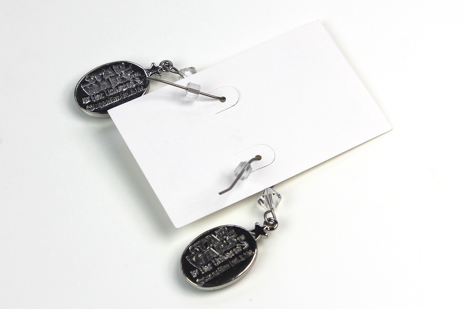 The R2-D2 star drop earrings again feature the same R2-D2 design as the bracelet and ring – the earring pendants are the same size as the one for the bracelet. The back of each pendant features the logos and copyright text. The silver coloured pendant setting has a silver star at the top, while each earring hook includes a clear crystal-style glass bead. I love this little touch of sparkle to the design – the curve of the earring hooks mean this bead can’t slip off, which is great. The Her Universe website notes the materials are – Rhodium silver plated white metal, glass, Lucite and titanium posts.