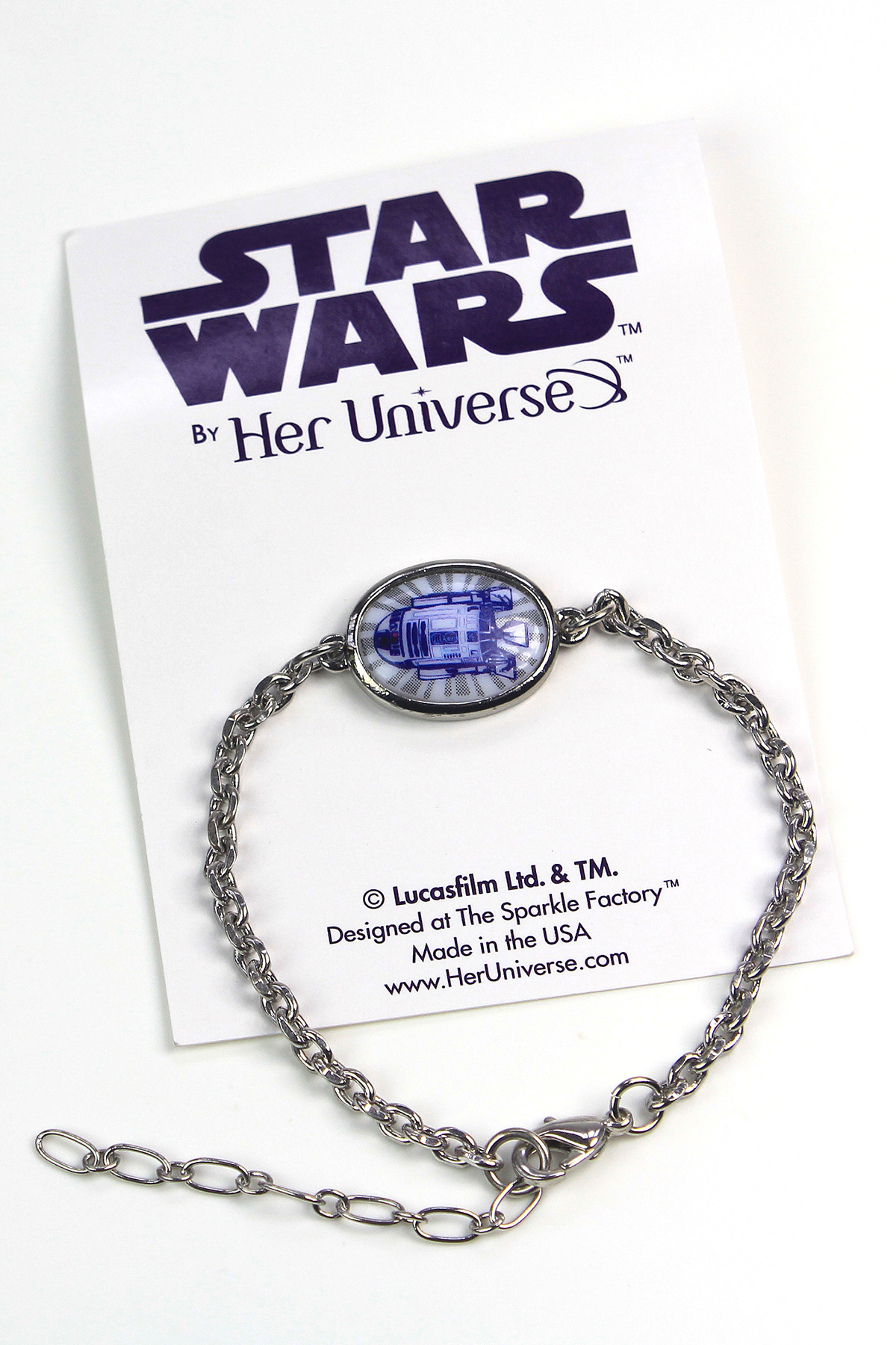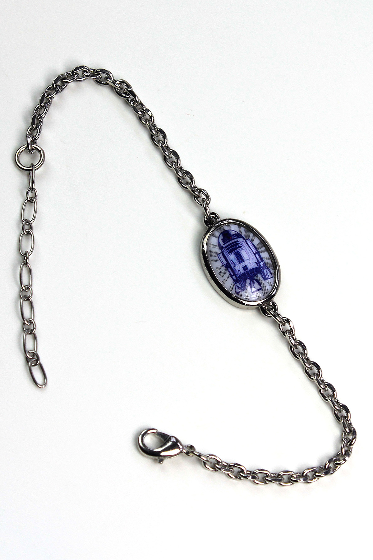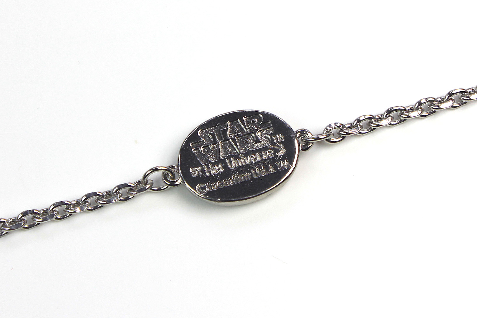 The R2-D2 pendant bracelet features the same R2-D2 design on a plastic pendant – but the bracelet’s pendant is smaller. Also, the plastic pendant is more recessed within the silver coloured setting of the bracelet, compared to the ring. The bracelet pendant measures approximately 20mm by 15mm (and 4mm deep). The back of the pendant is stamped with the same logos and copyright information as the ring. The bracelet chain is attached to each end of the pendant – the section ‘below’ R2-D2 ends with a standard lobster claw style clasp, while the section ‘above’ R2-D2 has a length of adjusting chain (with wider chain links). The full bracelet measures approximately 18cm long, with a further 5cm for adjusting. I can comfortably wear this bracelet at it’s shortest length – I was worried that the pendant would ‘swing’ underneath my wrist when wearing, but the fit means it doesn’t move on it’s own without being tight. Of course this will vary depending on your own wrist size, but jewelry chains can be easily shortened if desired. I’m always looking for more Star Wars bracelets to add to my collection, I really like the slender design of this one. The Her Universe website notes the materials are – Rhodium silver plated white metal, steel and Lucite.