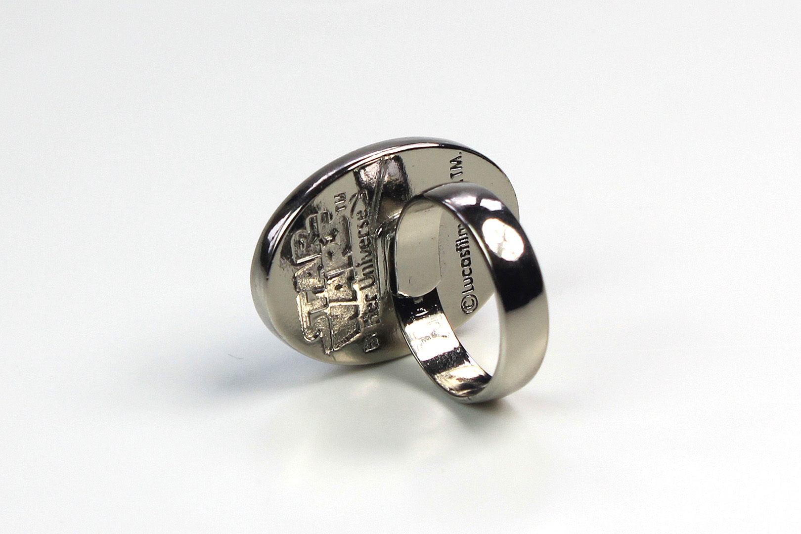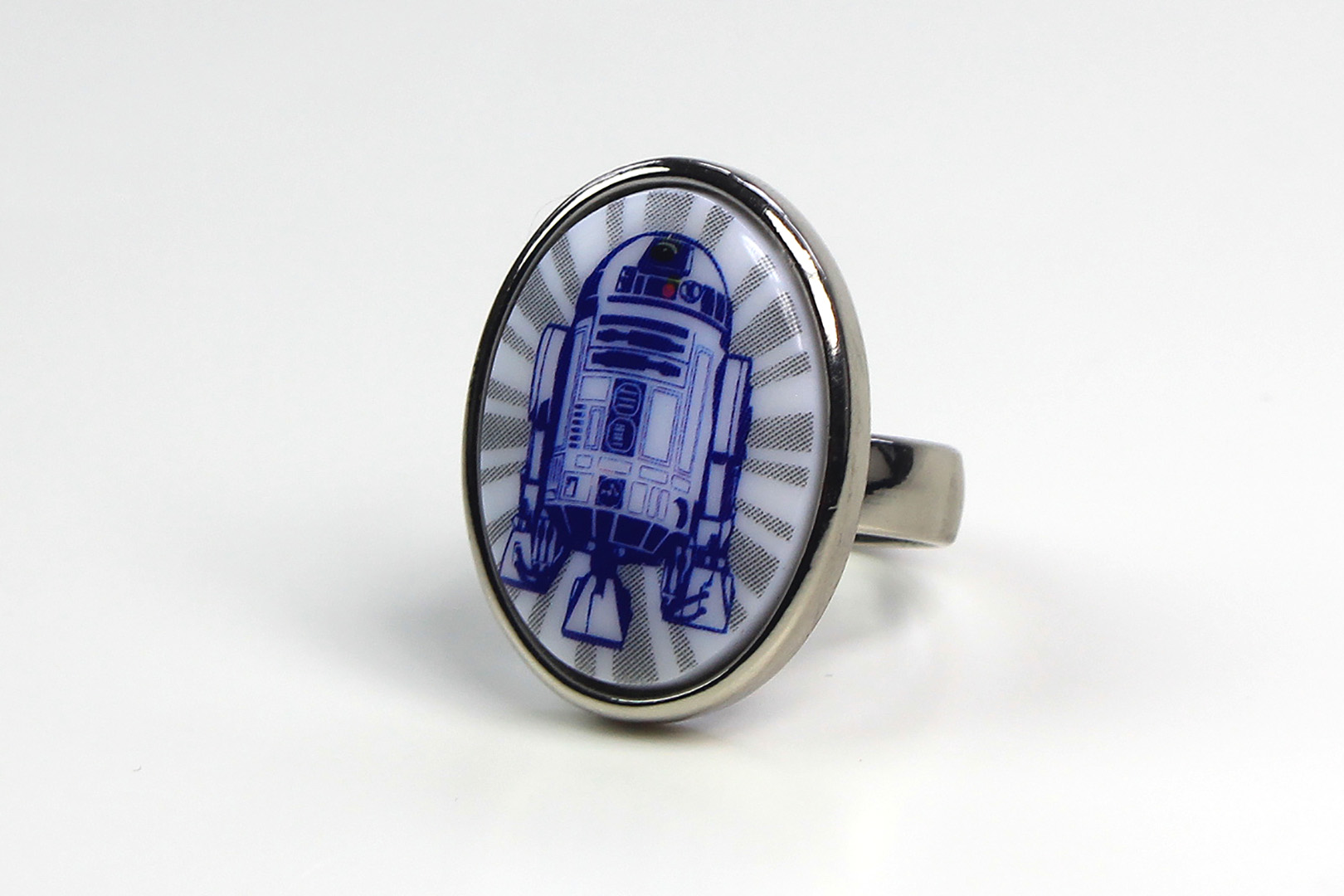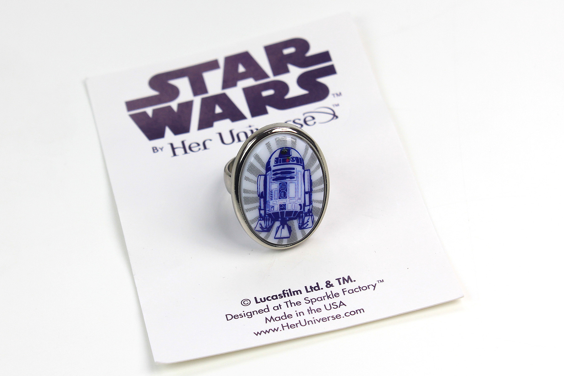 The R2-D2 mod ring is silver coloured, with a central pendant featuring R2-D2 against a grey ‘star burst’ style background. The print of R2-D2 is clear and quite detailed – all the details are blue, except for black and red lights/’eyes’. The back of the ring is stamped with the Star Wars logo, Her Universe logo, and the standard Lucasfilm copyright text. The main oval decoration part measures approximately 27mm by 20mm (and 5mm deep). The band measures approximately 5mm wide – the approximate internal diameter of the band as it arrived is 18mm, but it can easily be tightened or widened with gentle force. The band is very sturdy – it overlaps underneath the main decoration, so it opens/adjusts on top of the finger, rather than underneath the finger when worn. It is very comfortable to wear – the large pendant makes this a statement ring, but it’s not heavy to wear. The Her Universe website notes the materials are – Rhodium silver plated white metal ring base and Lucite cabochon.