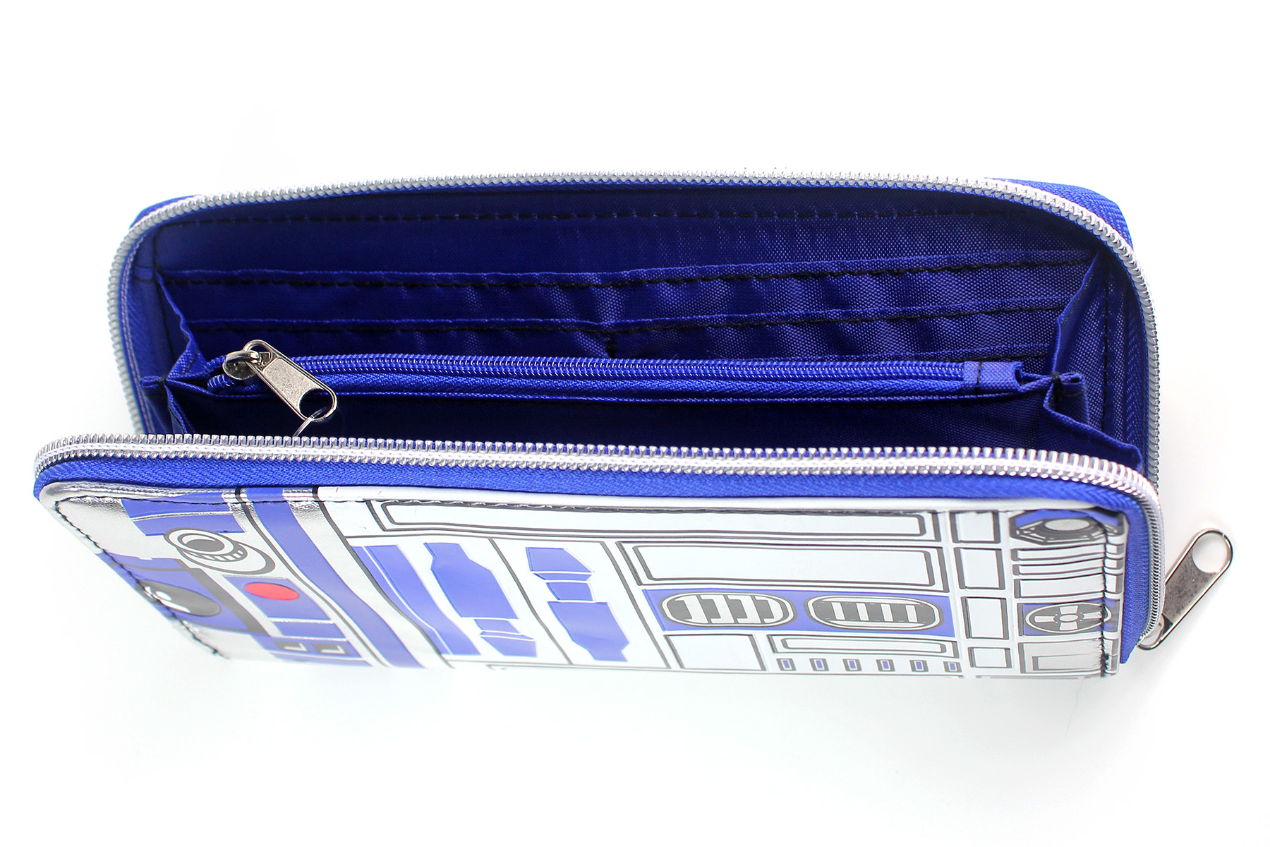 The R2-D2 wallet is made from vinyl, with printed and embossed designs. The wallet has the ‘front’ design of R2-D2 printed on both sides, in that the front and the back of the wallet are the same. I really like the silver accents, they’re quite eye catching. The main outer zipper has blue backing, with silver ‘teeth’ and silver-toned metal zipper pull, which matches the colour scheme nicely. Inside, the wallet is lined with blue nylon fabric, and features 2 bill/receipt pockets, 12 credit card pockets, and a central zip up pocket. I don’t use cash much, but I do prefer wallets that have a zip-up compartment, and I like the larger number of card slots.