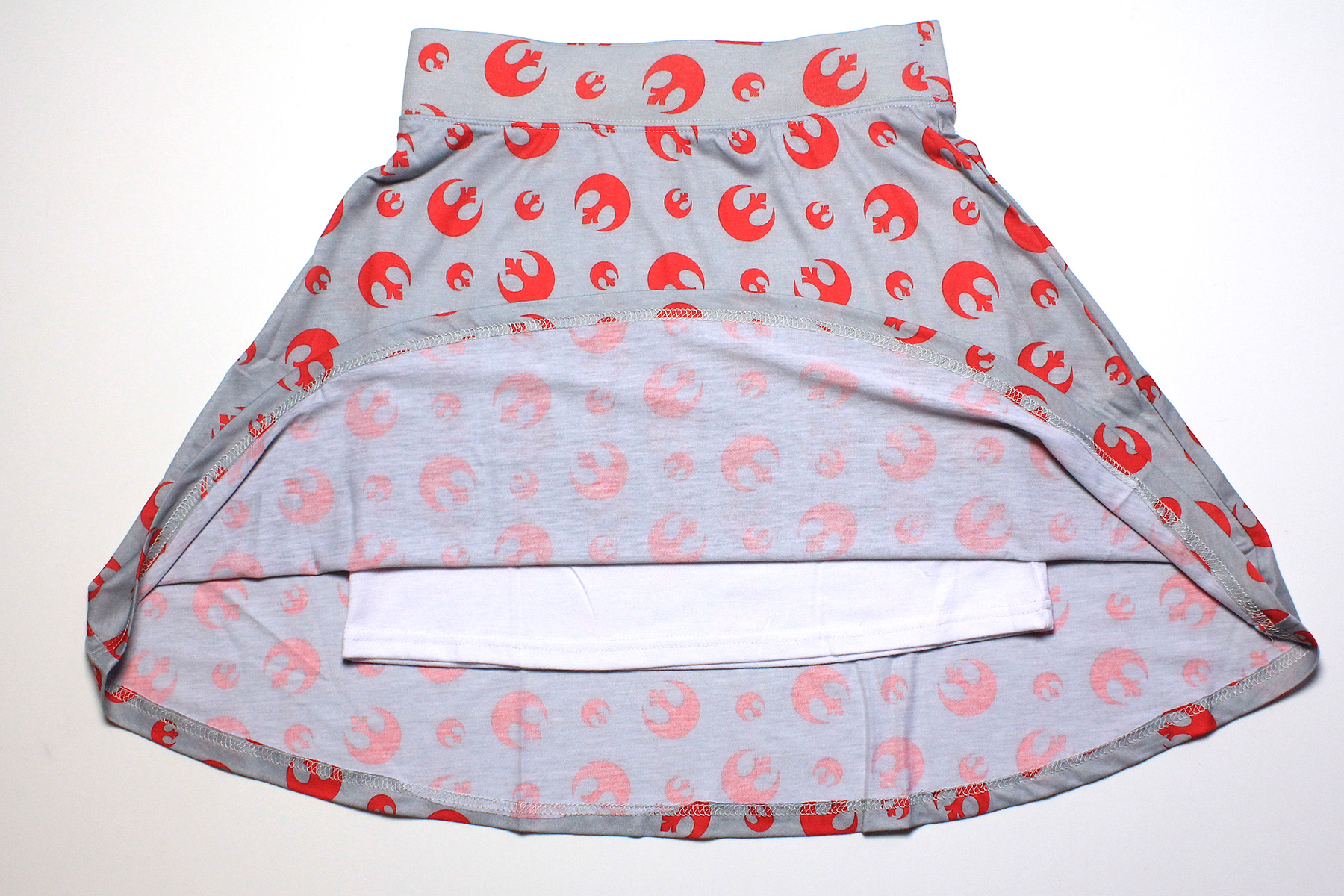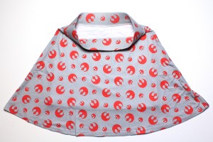 When it arrived, all my worries were put to rest – I love it! The background colour is darker than I was expecting – as you can see in my photos, it’s much more gray than it appears in the photos on Her Universe’s website. I don’t mind the colour, I actually prefer it – more practical than white and the red/gray combination reminds me of X-wings. The Rebel Alliance symbols on the printed fabric are nice and clear, with a very subtle darker border around each symbol. As noted in the website description, the lining is more fitted than the outer skirt but the lining fabric does have stretch, it is a lovely soft t-shirt-type material. The Her Universe website notes the fabric as 60% cotton, 40% polyester – but the printed garment details note the fabric is 96% polyester, 4% spandex. I ordered the size small – the waist band measures approximately 33cm across, and the skirt measures approximately 43.5cm long from waistband to hem. The hem of the lining measures approximately 42cm across, and 33cm long from waist band to hem. I think it’s a fantastic skirt, and I’m so glad I was able to grab one before they sold out.