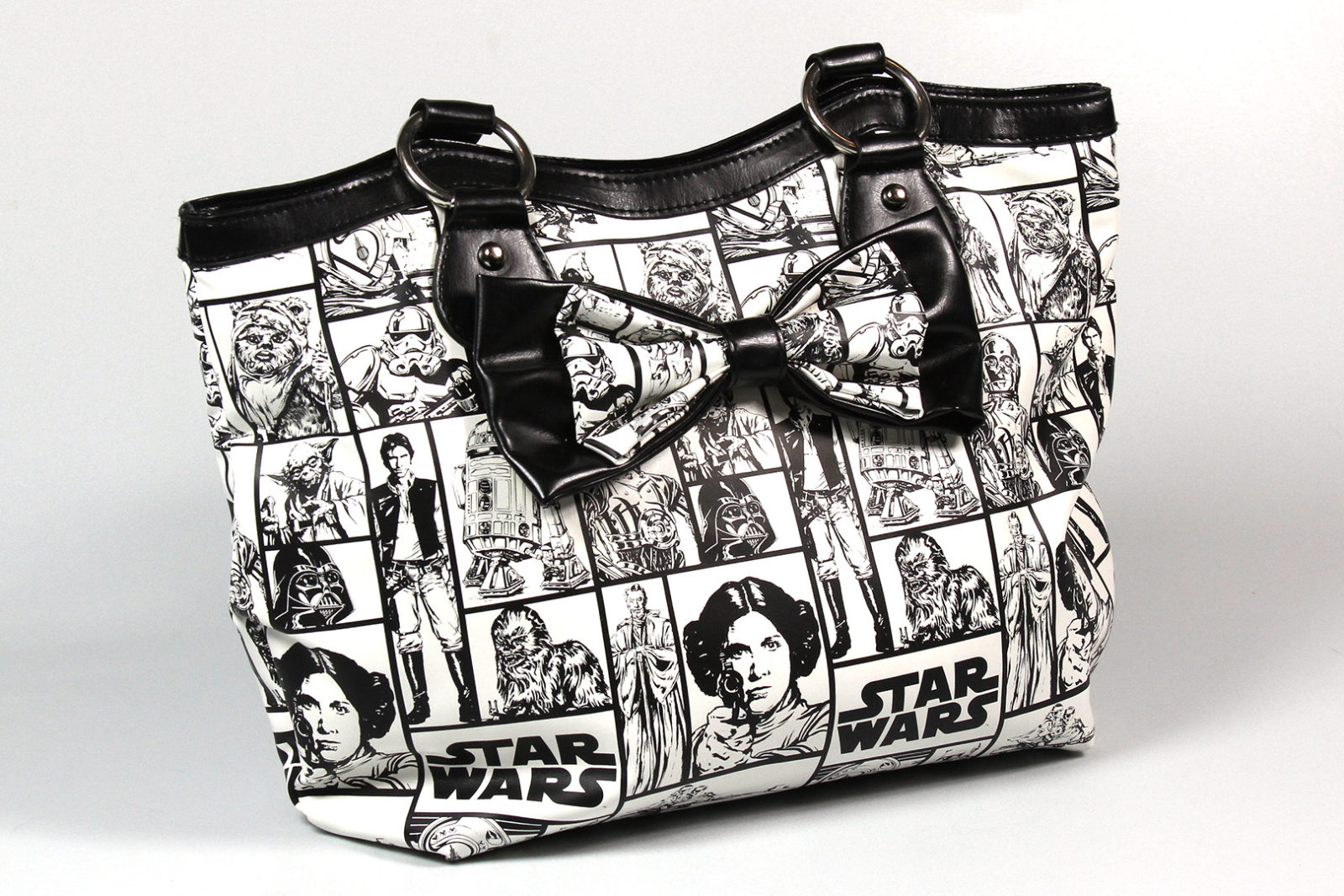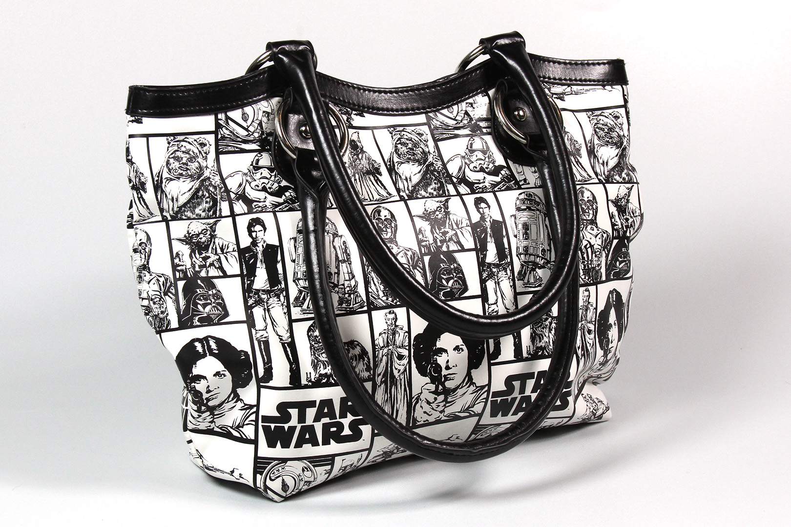 A couple of years ago Rock Rebel released a Star Wars collection of accessories. One of my favourites from the range was their ‘checker’ handbag, which of course I had to have. It features an all-over black and white comic style print in a soft faux leather. The interior is lined in black, with two fabric pockets on one side, and a zip-up pocket on the other. There are two tags sewn into the lining – ‘Rock Rebel’ and the official ‘Star Wars’ tag. The black handles are just the right length for me to wear the bag on my shoulder. It closes at the top with a black zip, and I love the bow on the front, a nice touch. I’ve had mine a while, and it’s held up well despite it’s frequent use. It measures approximately 26cm x 36cm, a good medium size handbag. I paid around US$40 for it via ebay, it’s a great addition to my Star Wars outfits – or any outfit.