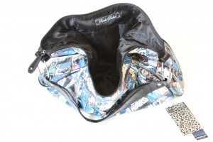 The bag is made from a soft faux leather, with the classic poster art displayed in a grid. The colours appear slightly toned down, giving a vintage feel. The main compartment is lined with black fabric, featuring the Rock Rebel tag sewn on one side, and the Star Wars tag on the other. Inside there are three pockets – one closes with a zip, the two on the other side are open. There is also one external zip compartment, accented with silver studs. The side seams have black piping, coordinating well with the faux black leather shoulder strap. The bag measures approximately 42cm long, 35cm high, with the non-adjustable shoulder strap measuring approximately 50cm long (including the metal rings). I am so happy to finally add this bag to my wardrobe, I love the casual ‘sling on your shoulder’ style and stud details.