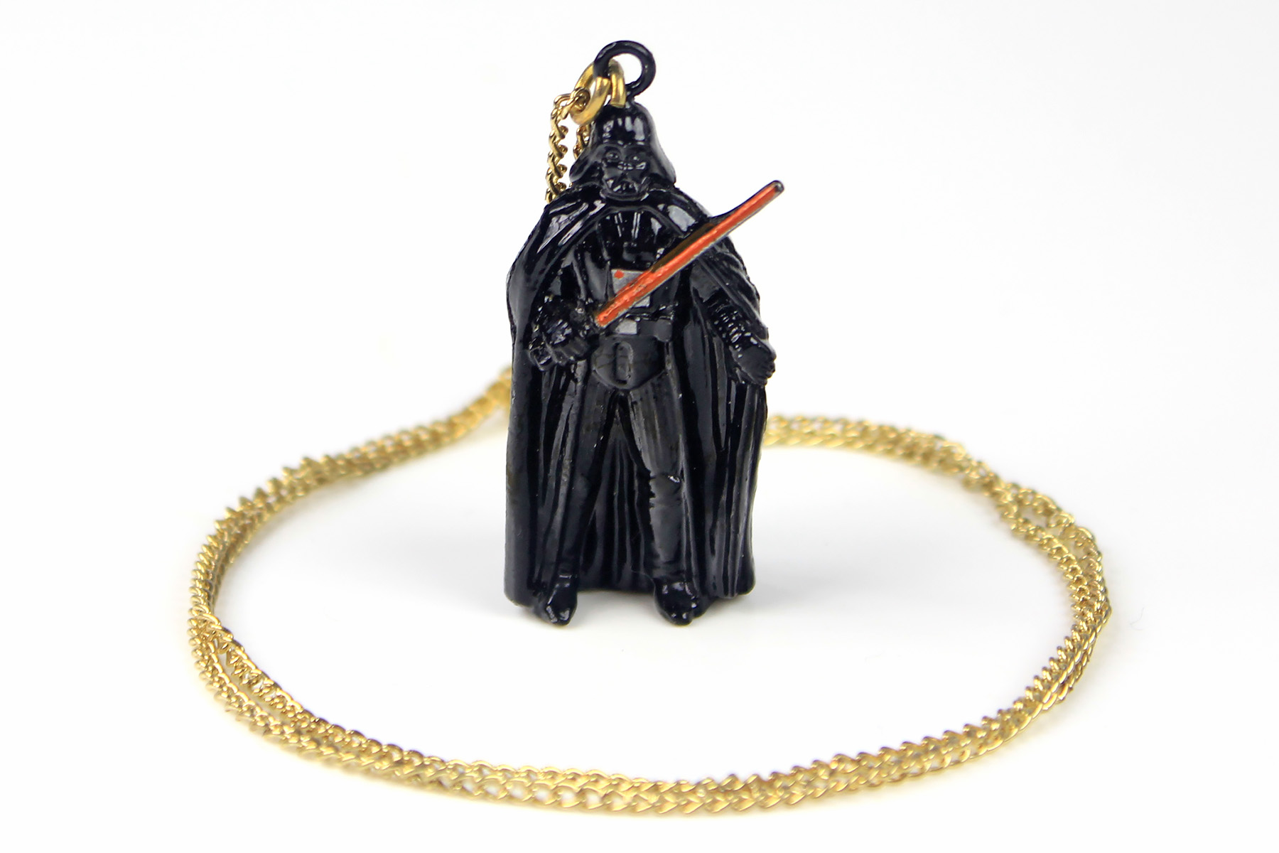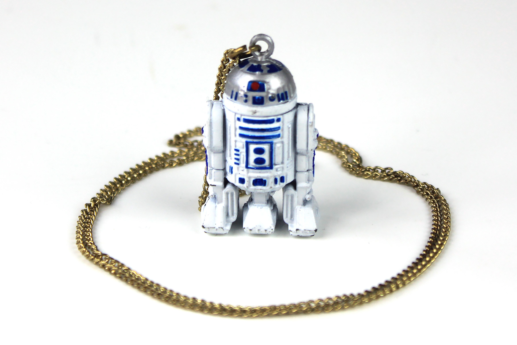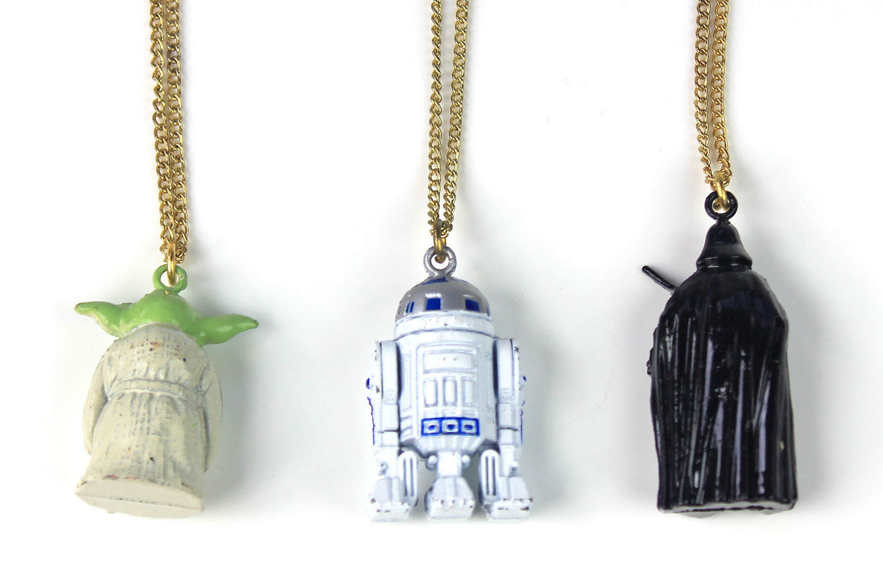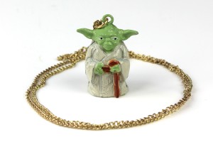 The pendants are solid die-cast metal, so they have a bit of weight to them. The Yoda and Darth Vader necklaces weigh 26g each, while R2-D2 weighs 29g (chains included). Each pendant has ‘(c) LFL 1983 H.K.’ in small raised text on the back – but as this is underneath the paint, it is very hard to read clearly. The details of the paint application are quite well done, considering the scale. The pendants are flat on the bottom, so they can stand on their own (as you can see in my photos below). Yoda is the shortest at 3cm tall, R2-D2 at 3.2cm tall and Darth Vader of course the tallest at 3.9cm (not including the top hanging rings). Each pendant is hung on a non-adjustable gold tone chain, measuring approximately 62cm long and closing with a standard circular jewelry clasp. As I don’t wish to risk any damage, these necklaces will reside in my collection, rather than be worn, but I’m so happy to have finally been able to track down this cute little set.