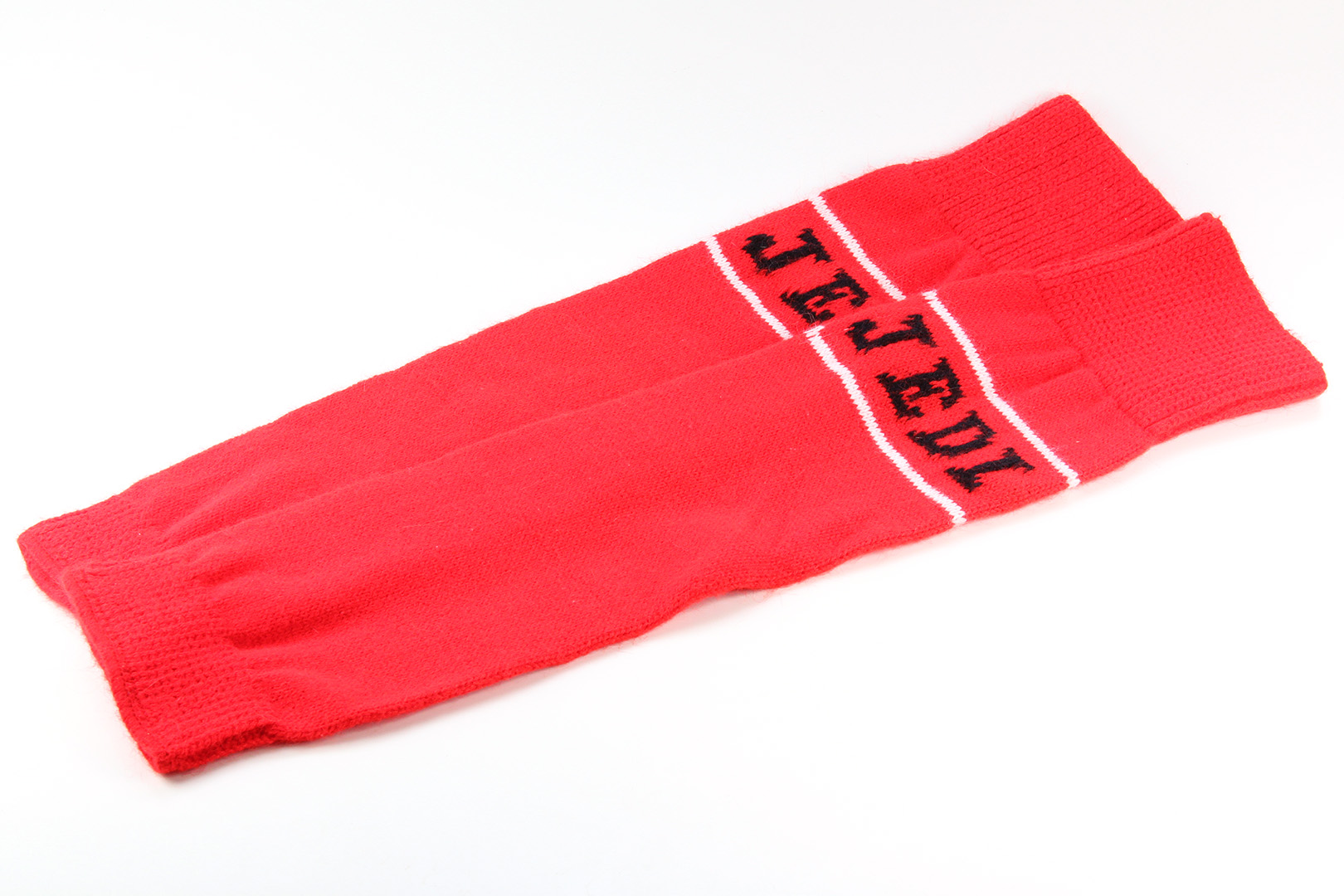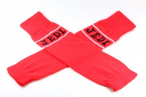 This pair is red with white stripes and ‘Jedi’ in black on both sides. These didn’t have a tag so I wasn’t sure what fibre type these are – many thanks to Star Wars collector Duncan Jenkins, who confirmed they are 100% Orlon Acrylic. They measure approximately 54cm long and 14cm wide (lying flat) which would be women’s sizing, not girl’s. Credit goes to Collectors Archive for the manufacturer information. Even though these are more for my collection than wardrobe, I am rather keen to track down other pairs from the range featuring Wicket, R2-D2 and C-3PO. I paid US$8 for mine on ebay, they are in great condition.