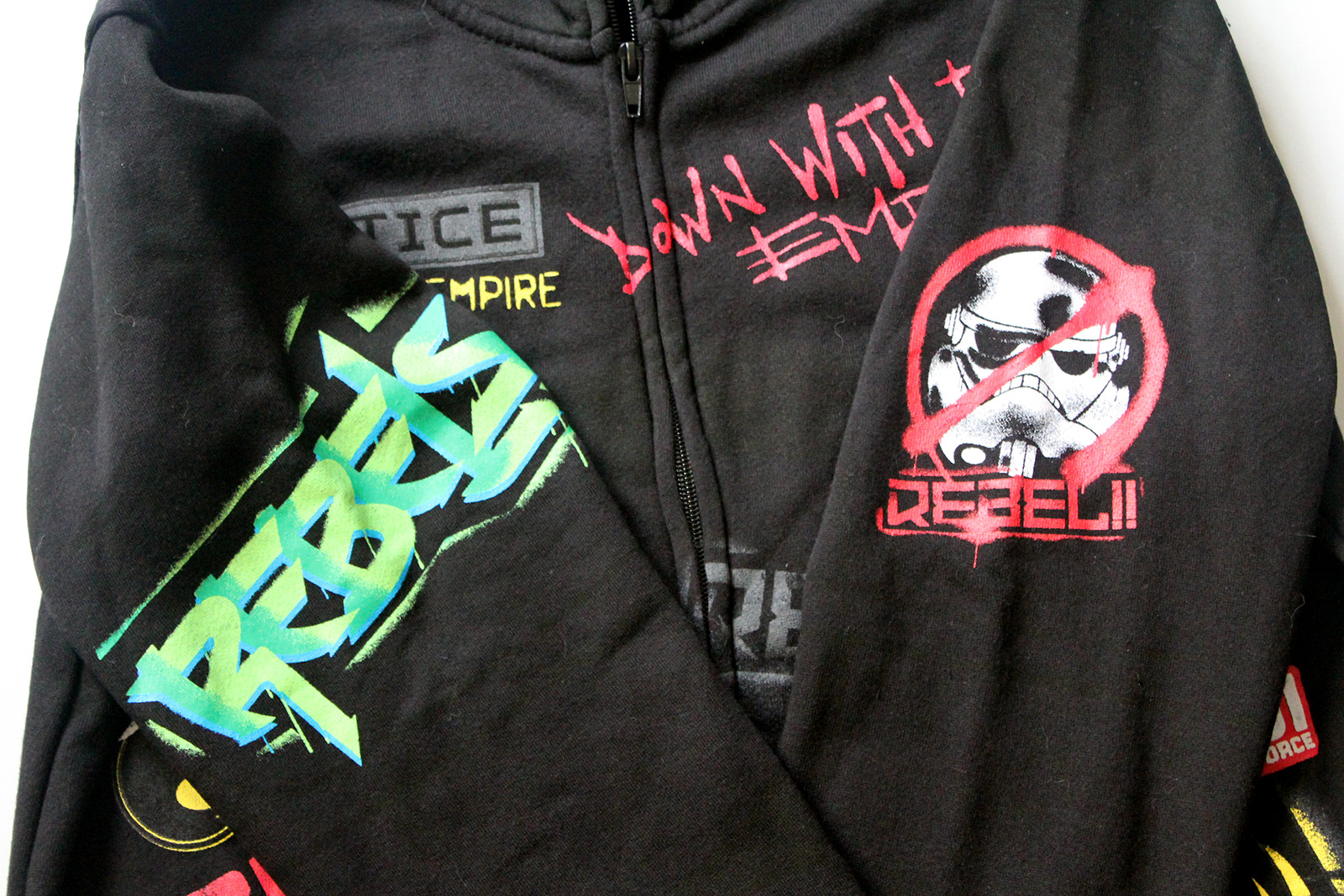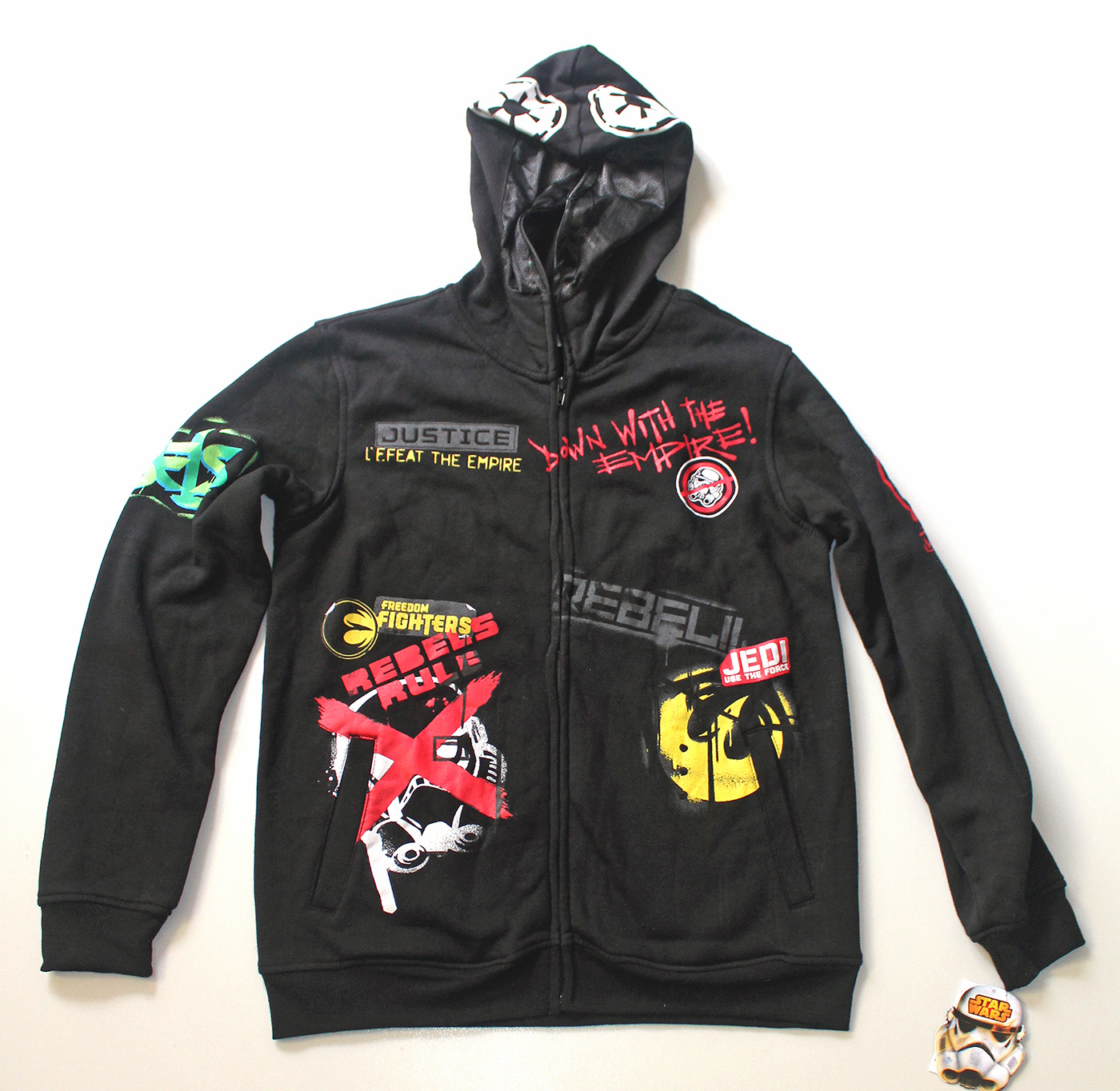 My first licensed Star Wars t-shirts came from the boys section of my local clothing store. Thankfully there is a lot more range available for women these days, but some times I spot something meant for kids that I want myself. While doing my routine on-line browsing, I followed a trail of links and ended up looking at the boys Star Wars clothing on Sears.com. One item in particular stood out – a black hoodie with Rebels themed graffiti. To me, this calls out to be worn by girls too – as the Rebels character Sabine Wren is an artist who leaves her graffiti behind when taking down the Empire. As it turns out, the hoodie was 50% off, so I made use of a free U.S. domestic shipping promotion and bought it via my U.S. mail service.