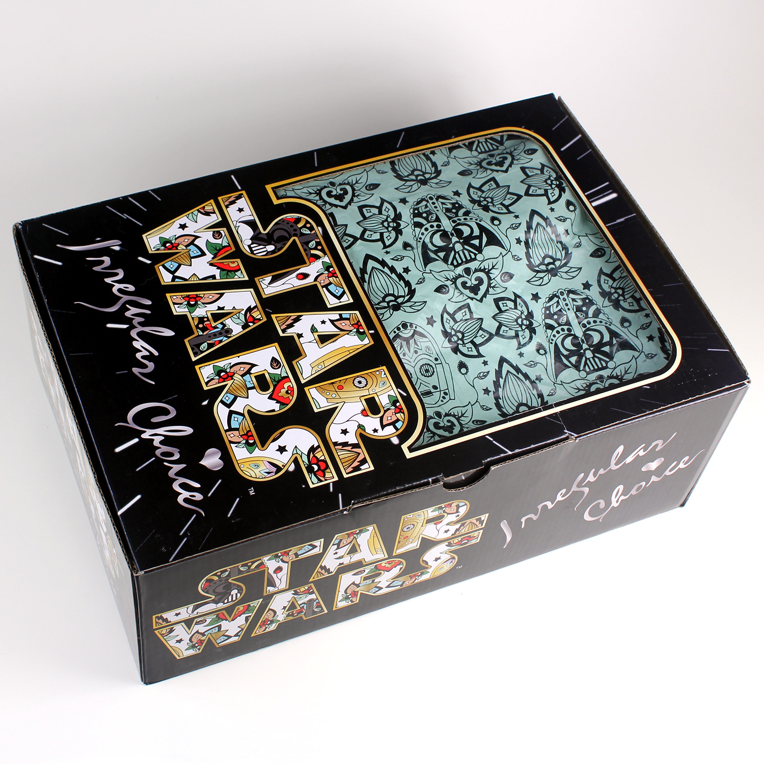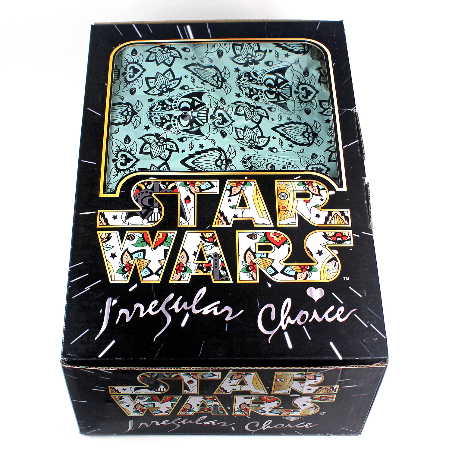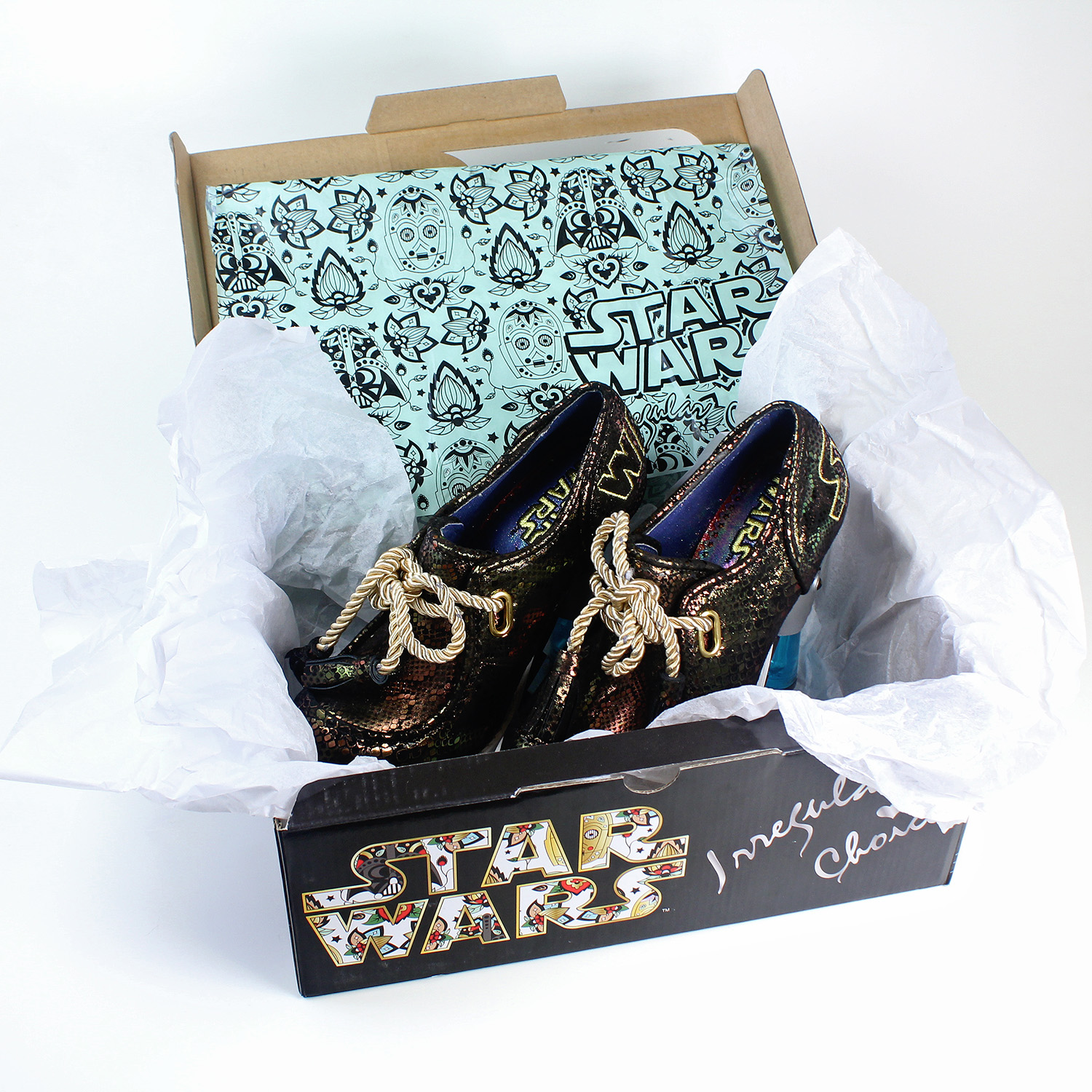 I have admired the range of shoes from Irregular Choice for quite some time, so it was very exciting to find their booth at Celebration Anaheim back in April, advertising an upcoming Star Wars collection! It was hard waiting so long, but now I finally have a pair of light up lightsaber heels! While convention attendees could pre-order pairs at Celebration, I had such a hard time trying to narrow down my favourites, so I decided to wait until I could order on-line. I knew the collection was going to be popular, but certain styles/sizes sold out within 15 minutes of the launch! One of my purchases was the Skywalker heels, which have just arrived direct from Irregular Choice – and I couldn’t contain my excitement opening the boxes.