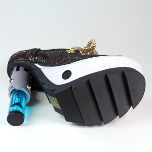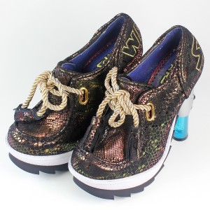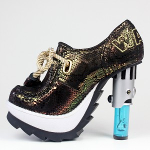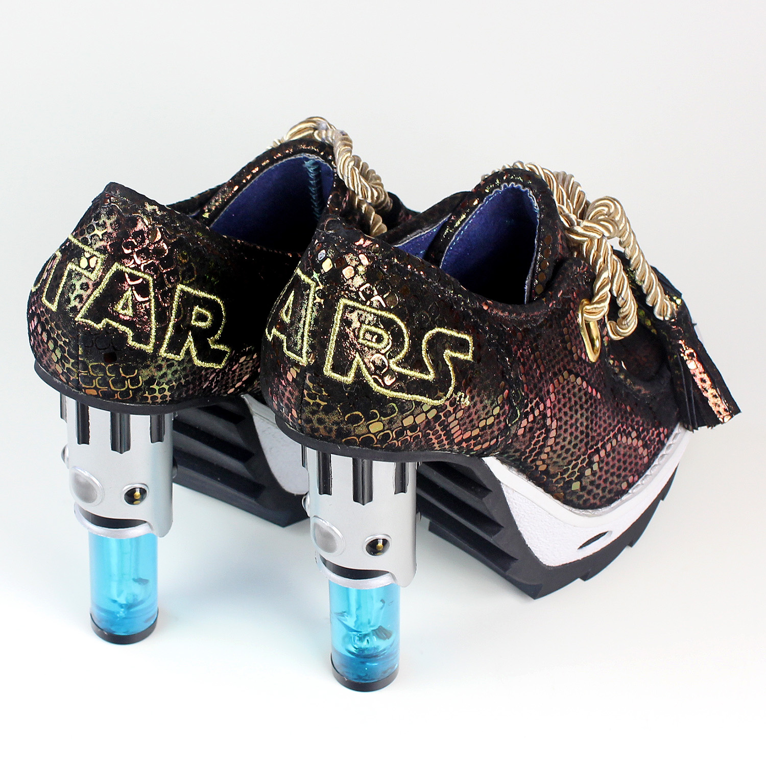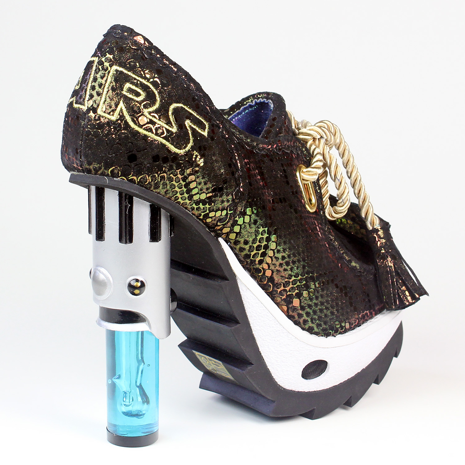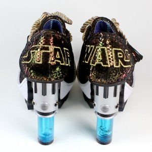 The Skywalker shoes are made from a bronze snake effect leather, which really shimmers when seen in person – makes me think of butterfly wings. The front of each shoe features two gold eyelets tied together with gold rope-style cord – each end of the cord has a tassel made from the same leather as the shoe. As with any cord, care should be taken to avoid damaging the gold fibre ‘wrap’ and exposing the cord underneath – though this will happen a little with general use. When I first saw this design, I wasn’t sure if I liked the cord detail – but it has definitely grown on me. Unexpected and unique details are what Irregular Choice is all about, and I wouldn’t want their Star Wars shoes to be any different. It feels like a long time coming to finally have licensed Star Wars women’s shoes that didn’t look like they were designed for men, so I really appreciate the details of this design that set it apart from previous footwear options. Irregular Choice are known for their amazing sculpted heels, so as a fan of the brand it was exciting to see this design feature in the Star Wars collection. As a big fan of jedi and lightsaber themed fashion, these were definitely on my wish list – and they light up!