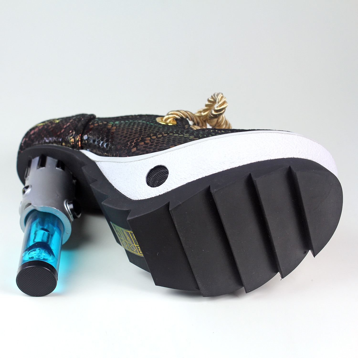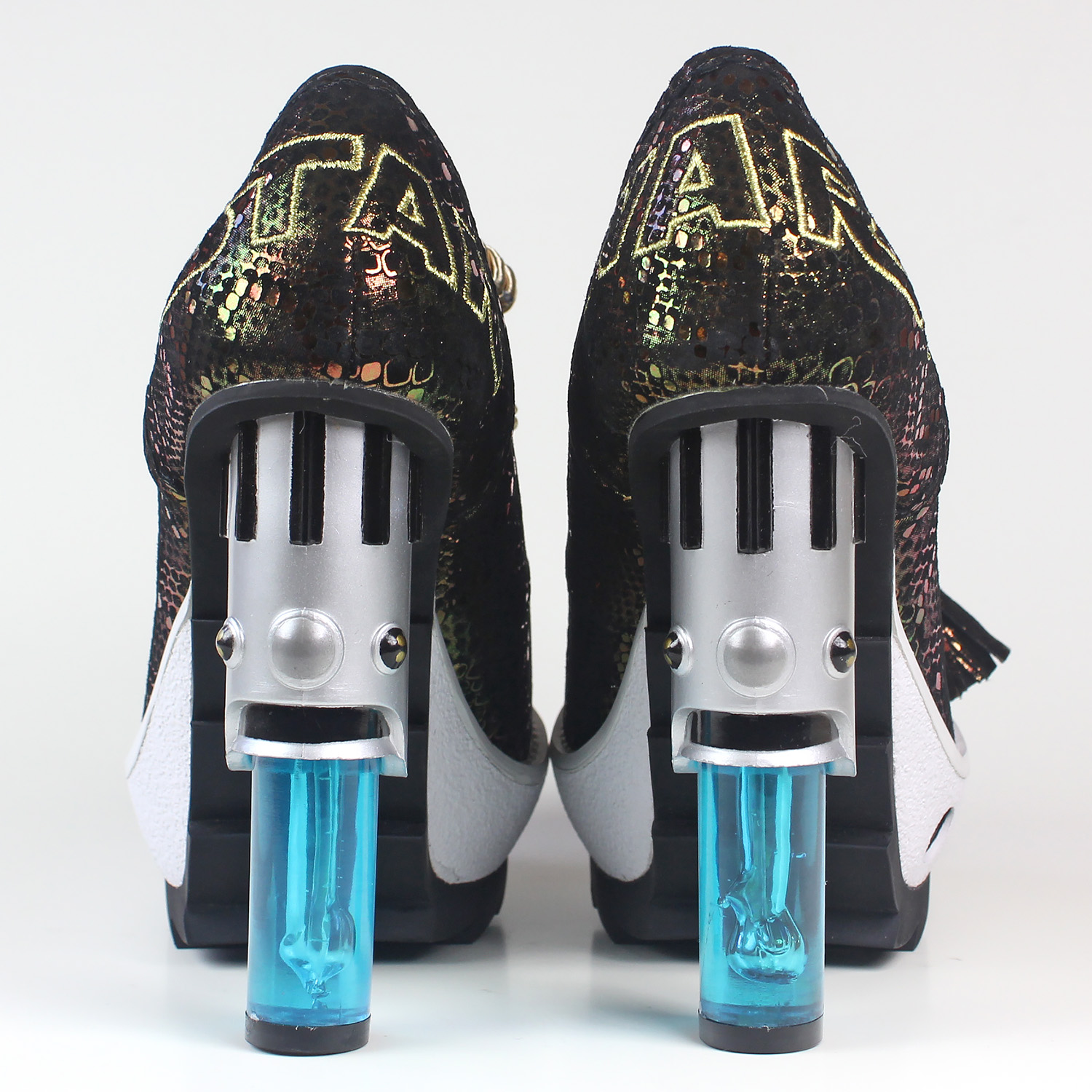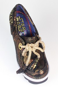 There were two light-up heel styles in the collection – these Skywalker heels, and the Tatooine boots. The heels are sculpted in the shape of Luke Skywalker’s lightsaber (technically, the one that Anakin made and Obi-Wan gave to Luke) – as the style is called Skywalker you can decide if these are Anakin or Luke themed. The blade of the lightsaber is translucent blue, and lights up with flashes when the sole of the shoe (not the heel itself) impacts on the ground when you walk. The right shoe also features sound – with a small but effective speaker in the outer sole. There are three different sequences of lightsaber, starfighter and blaster sounds, which are triggered by a small switch inside – with care, you can press on the correct spot on the outside when wearing the shoes, to show off this amazing feature. You can check out my video at the end of this review to see the lights and sounds. The shoes came charged up, ready to go – which was great when you’re excited about your new purchase and want to try them out as soon as they arrive! This style should not be allowed to get wet, as this can damage the electronics. They are rechargeable via a micro USB connector (not included), it takes a few hours for a full charge.