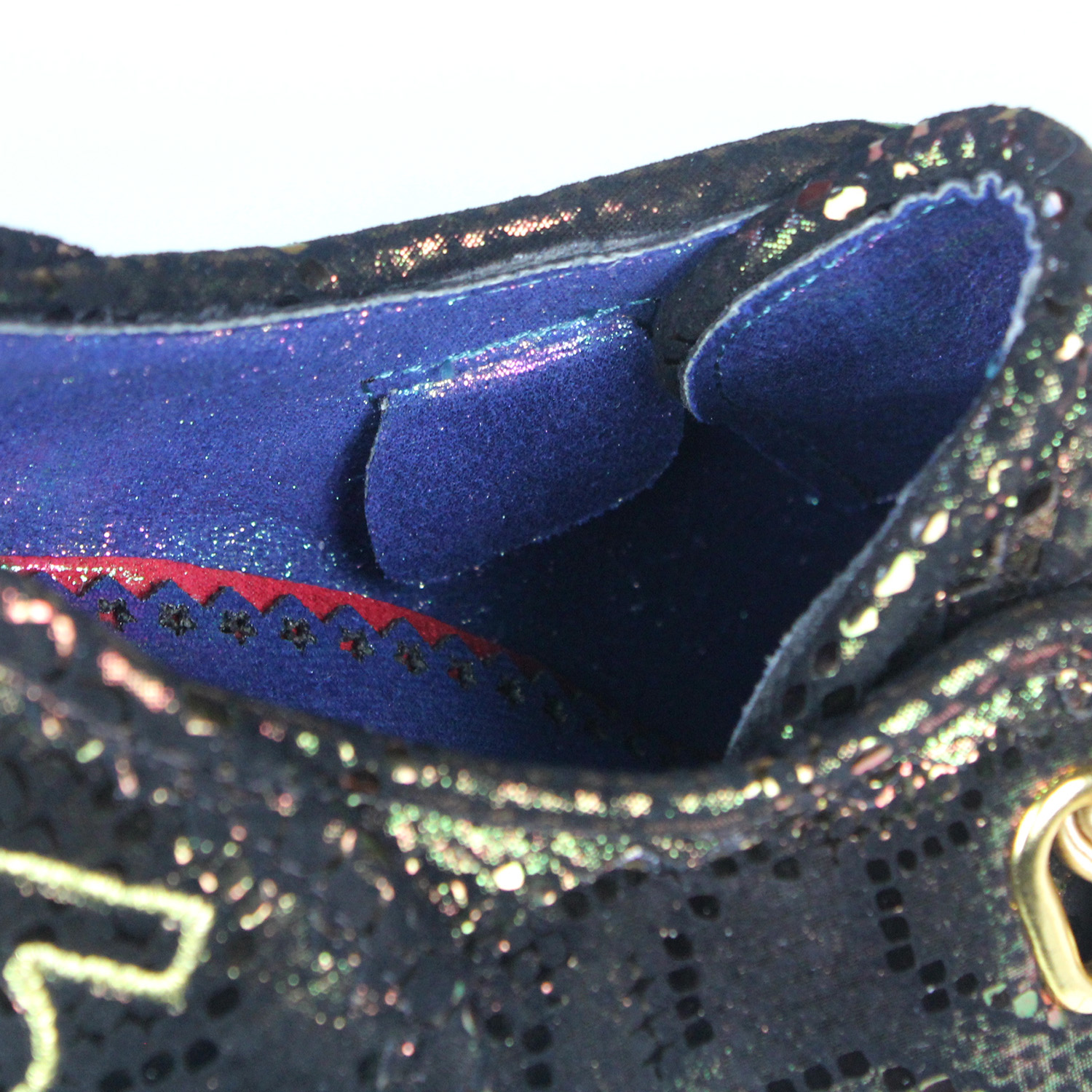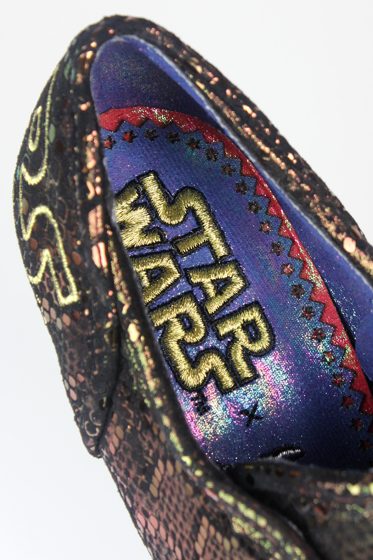 The back outer heel of the shoes features the Star Wars logo embroidered in gold – ‘Star’ on the left, ‘Wars’ on the right, so the words join together when wearing the shoes. The European shoe size is printed inside, and the hologram insole features fully embroidered Star Wars and Irregular Choice logos – a lovely detail. While most of the range featured printed Star Wars imagery on the soles, this style does not. The sole has a chunky black tread instead, so they don’t need protecting like the printed soles – but be aware they can leave black marks on some surfaces, as black soles tend to do. There is a 4cm platform, with a heel height of 13cm (just over 5″) – the chunkiness of the sole helps offset the heel height, so the angle of your foot isn’t as steep.