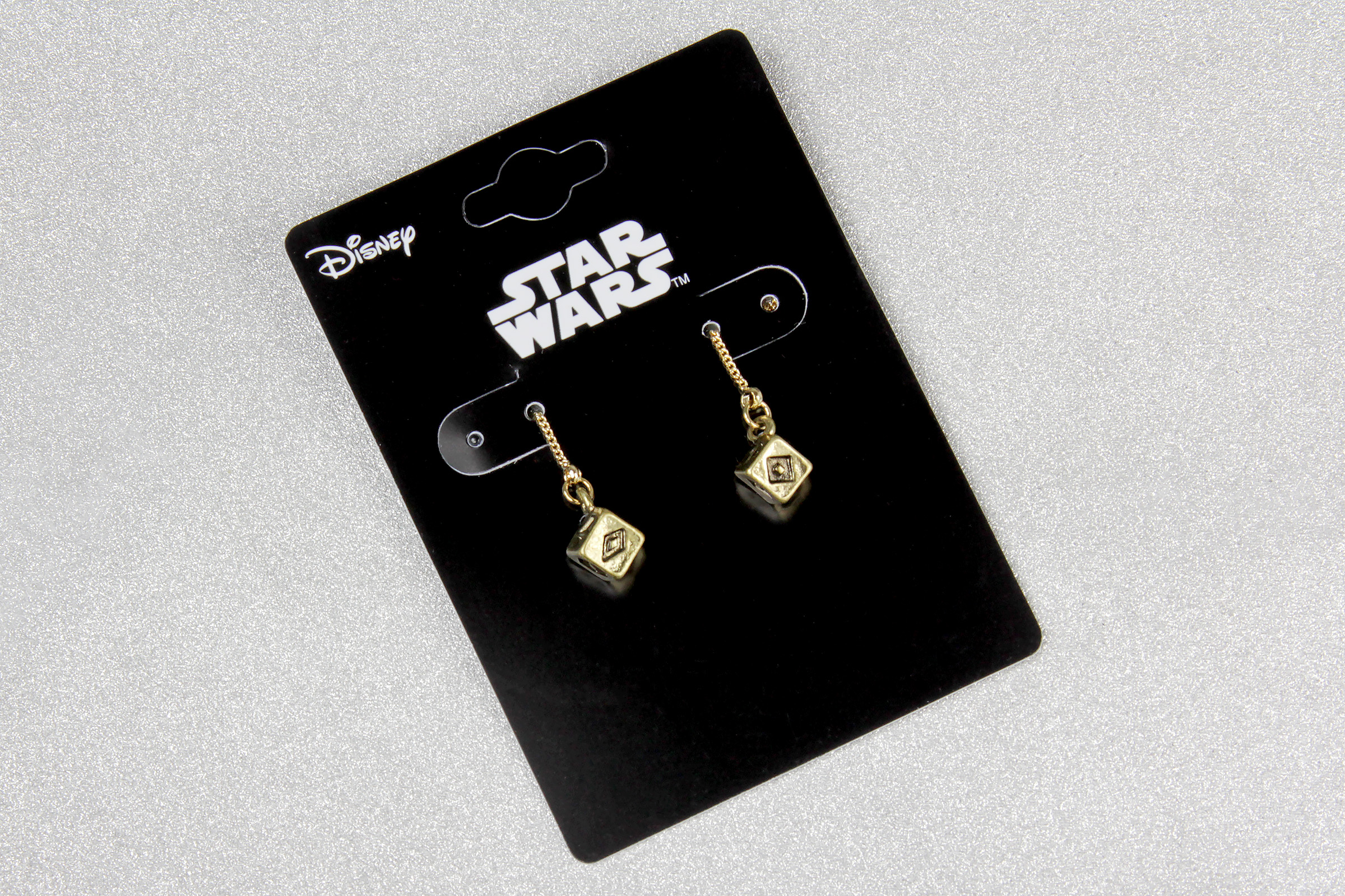 Today’s review features the Body Vibe x Star Wars Solo Dice threaded drop earrings. The gold-tone earrings are ‘thread style’ dangle earrings, with a slender bar for inserting through pierced ears, with a length of dangle chain. The earrings feature small 3D sculpted versions of Han Solo’s lucky dice, as seen in Solo and The Last Jedi.