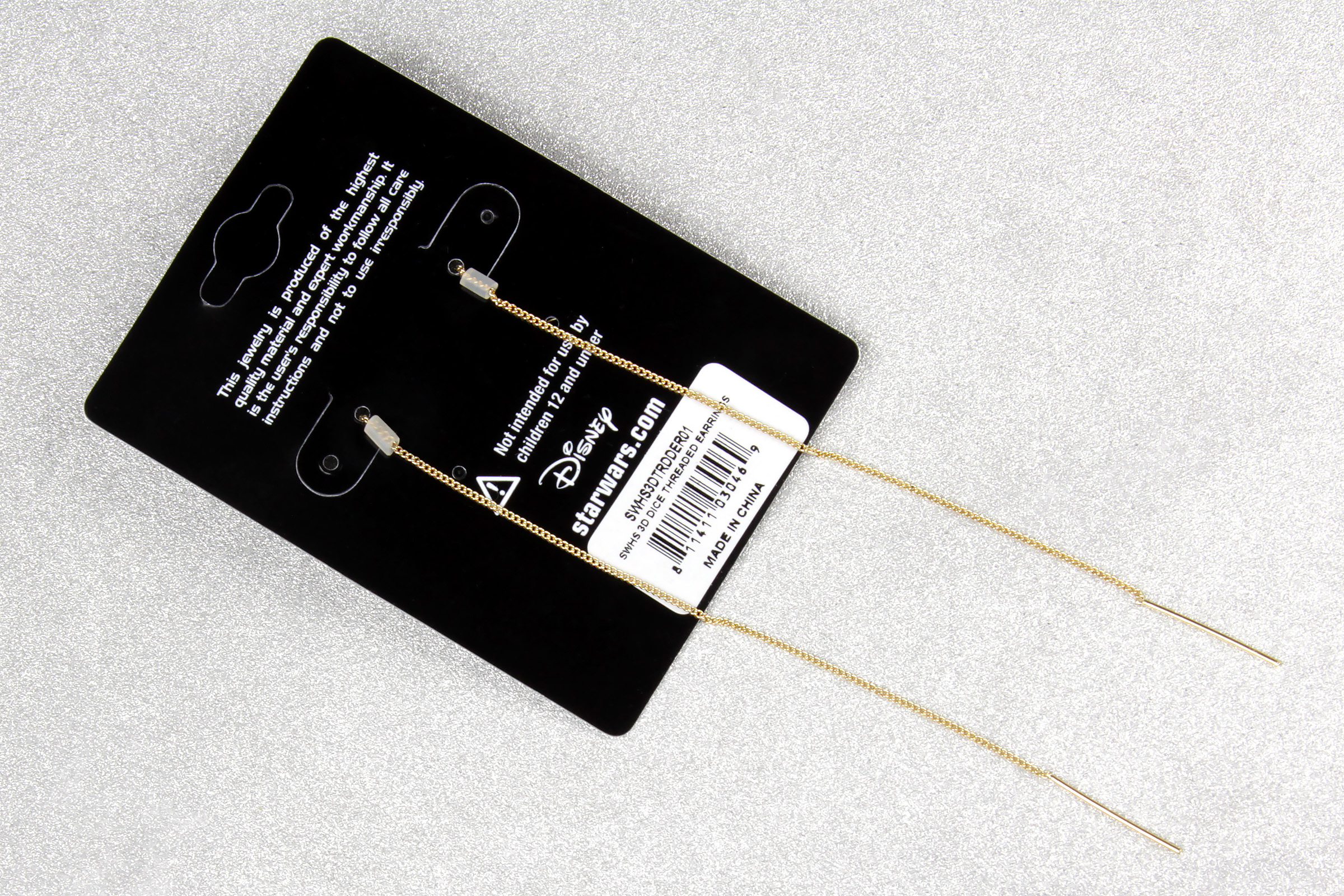 The earrings came packaged on a black plastic backing card, with the Star Wars and Disney logos printed on the front. The backing card was also packaged inside a clear plastic sleeve, which helps contain the long chains safely, but I removed it for easier photography – and I was eager to have a closer look at these earrings the moment they arrived!