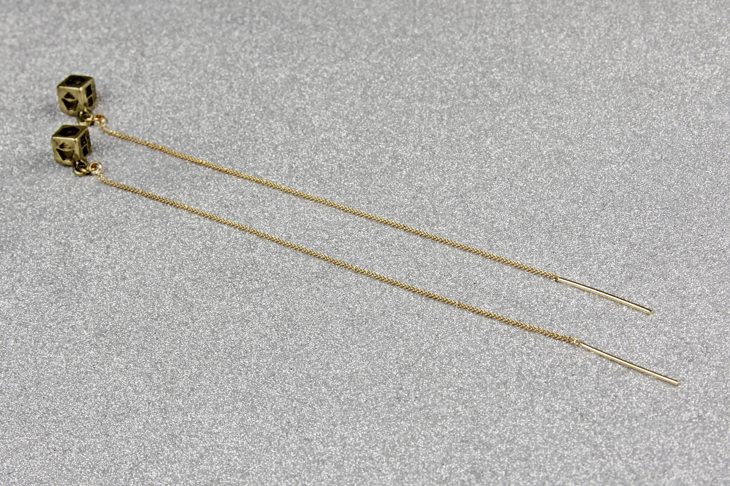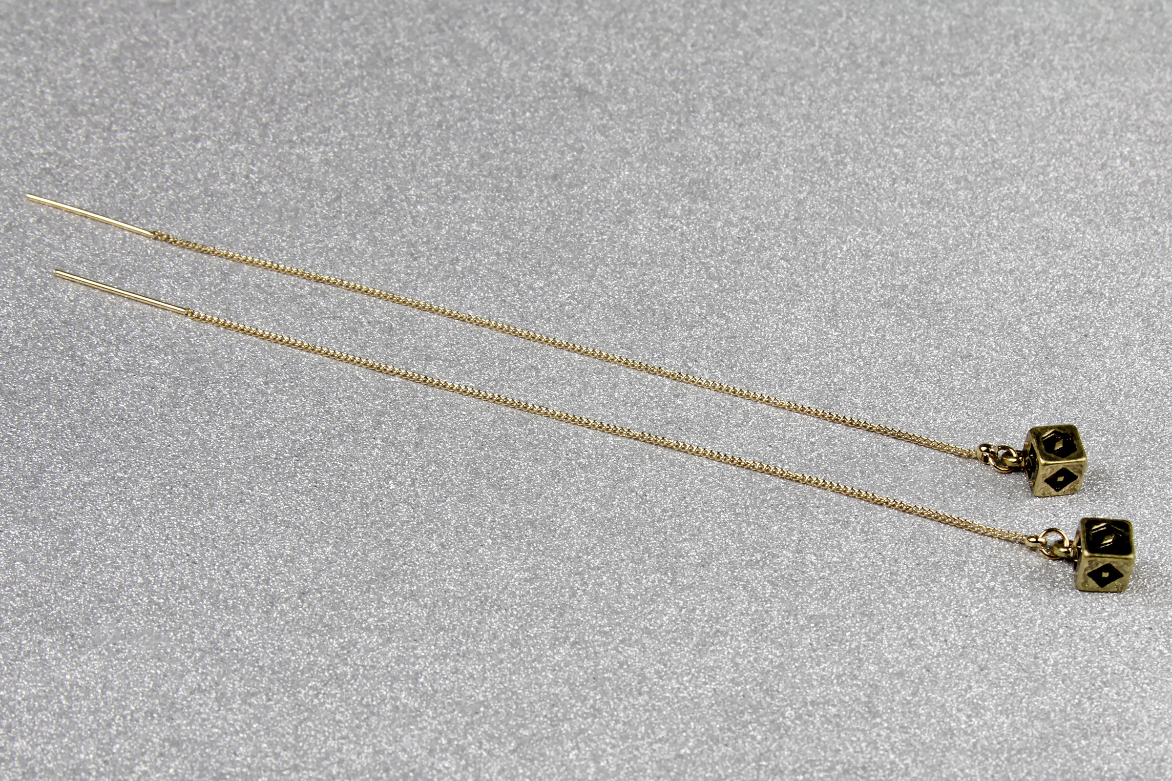 The earrings feature small 3D sculpted dice pendants, attached to fine gold-tone chains with a slender rod at the other end. Thread earrings are worn by inserting the rod through an ear piercing and pulling through, so the chain is sitting through your ear. The dice pendants hang from the front, while the slender rods hang from the back.
