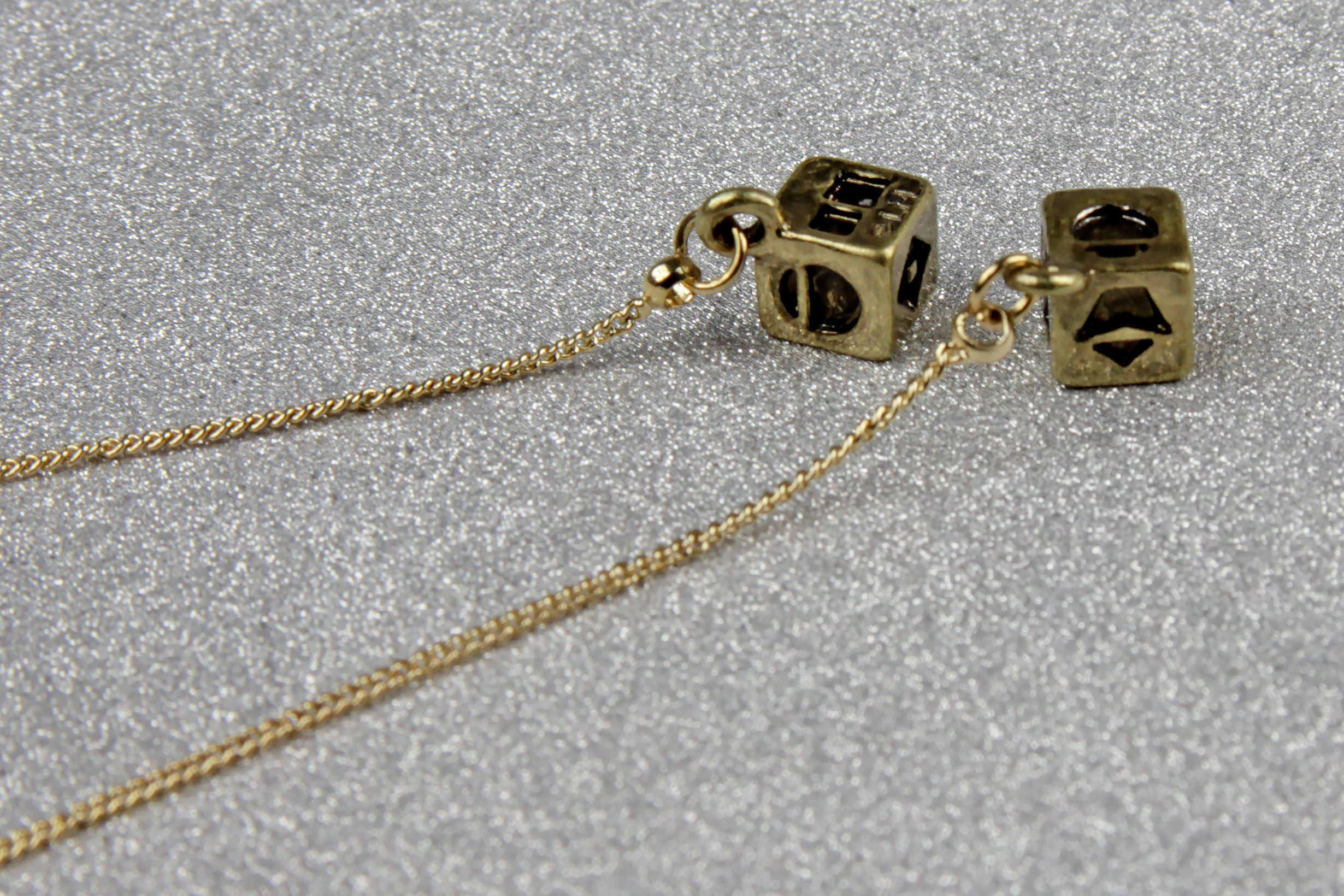 The dice pendants are accented with black antiquing, which highlights the recessed designs. This gives the pendants a little more of an ‘old gold’ colouring, compared to the shiny gold of the thread chains, but the contrast is minimal.