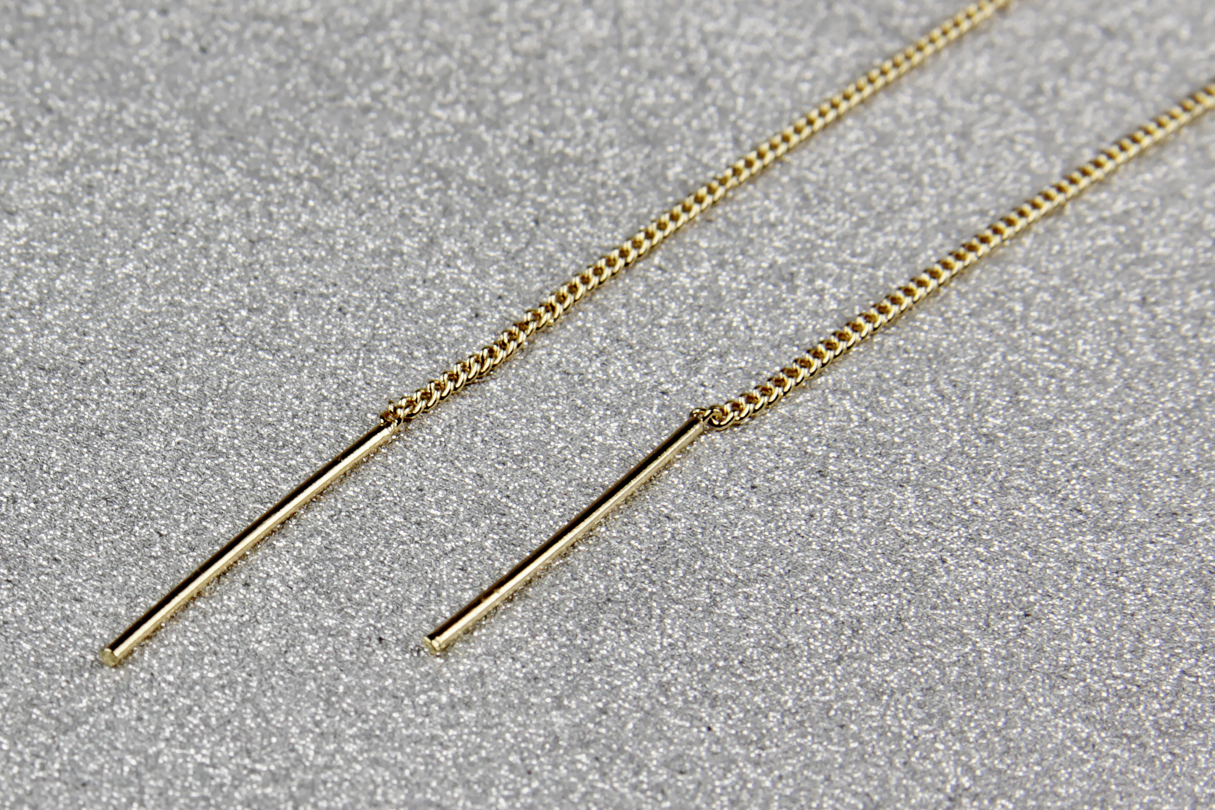The end of the slender thread chains are attached to thin rod, which is used to thread the earrings through an ear piercing. The rod is the same diameter (thickness) as a standard stud earring backing post, so it will fit through your ear piercing comfortably.