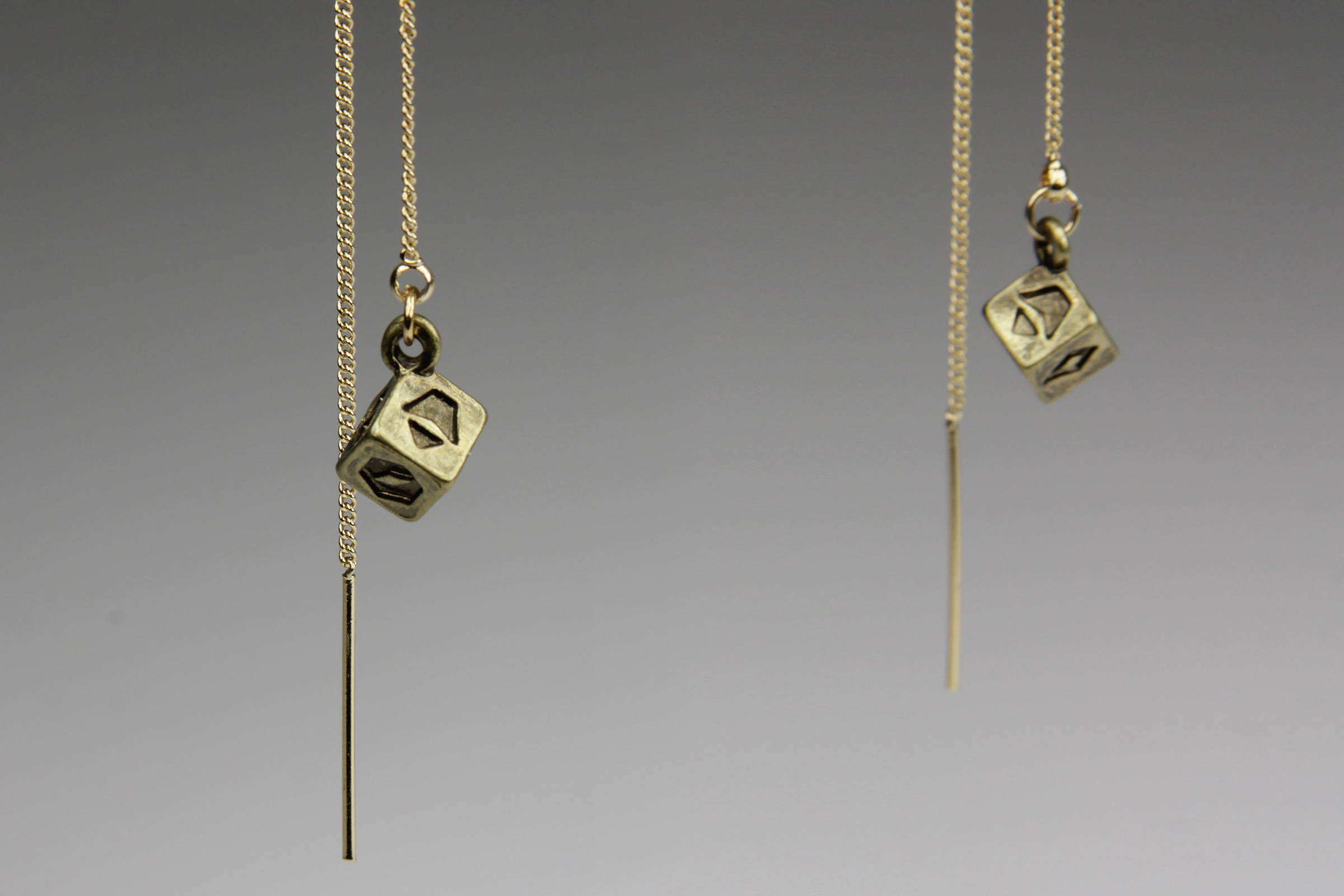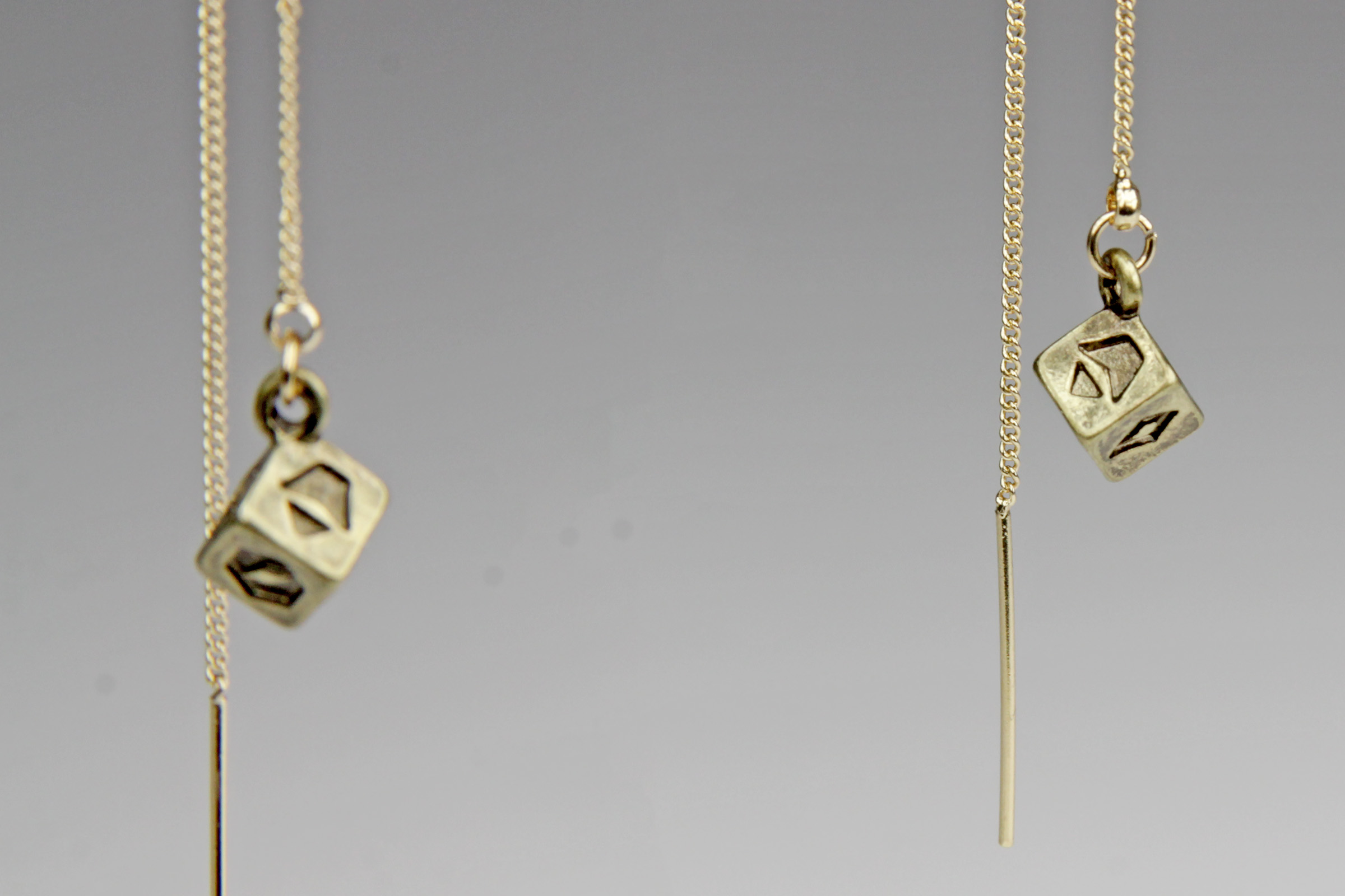 With this style of earring, you can choose the length of the pendant drops – you can wear the earrings with the dice closer to your ears and a long length of chain hanging behind, or keep the rod and dice hanging at the same level. These earrings are also less likely to ‘fall out’ when wearing, compared to standard hook-style dangle earrings.