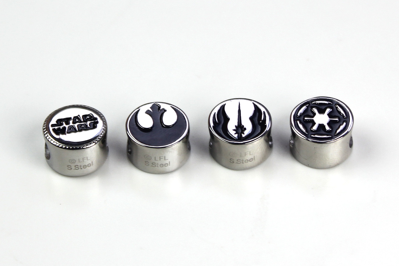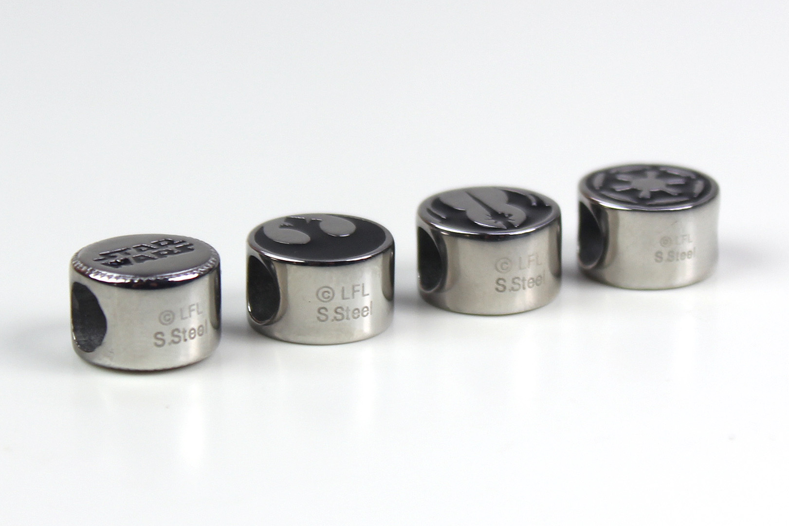 The bead charms came packaged on a Body Vibe x Star Wars backing card. There are four in the set, each sold separately – Star Wars logo, Rebel Alliance logo, Jedi Order logo and Imperial logo. The designs are recessed and filled with black enamel – on both sides, so it doesn’t matter if they rotate when worn on bracelets or necklaces. The bottom of each bead is etched with ‘(c) LFL S.Steel’ – noting these are officially licensed and made from stainless steel. Each bead charm measures approximately 10mm across, and 6mm in depth. As with the rest of the Body Vibe x Star Wars bead charm range, these can fit standard Pandora bracelets. The detail on each logo is really nice, and they make a great addition to my bead charm bracelet.