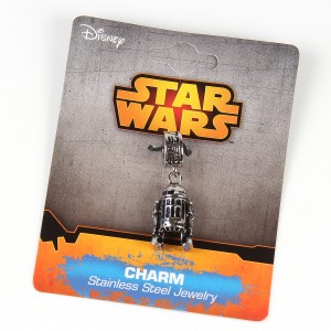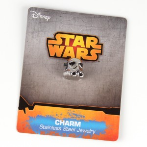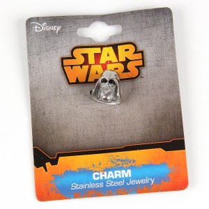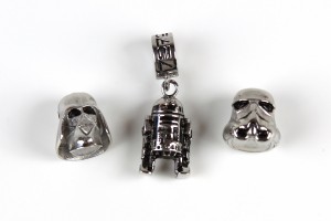 The bead charms came on individual backing cards, the same style as the Jedi Order earrings packaging, featuring the SalesOne LLC information on the back. The charm beads will fit Pandora style bracelets, a popular style for accessories (I already own a Pandora bracelet) so I was excited when I saw Thinkgeek advertise licensed Star Wars charm beads. They are made from 316L surgical stainless steel, the Darth Vader and Stormtooper charms have ‘(c) LFL S Steel’ printed on the back, the text is very subtle so you won’t see it unless looking closely. The Darth Vader/stormtrooper charms measure approximately 13mm tall, whie the R2-D2 measures 16mm tall (or 28mm including the dangle bead). The dangle portion of R2-D2’s bead has ‘R2D2’ in Aurebesh font twice, a neat touch. The sculpts on all three are nice and detailed, they look great.